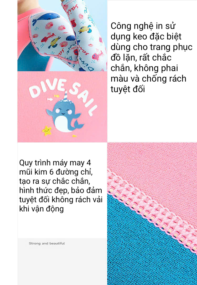 - Công nghệ in sử dụng keo đặc biệt dùng cho trang phục đồ lặn, rất chắc chắn, không phai màu và chống rách tuyệt đối