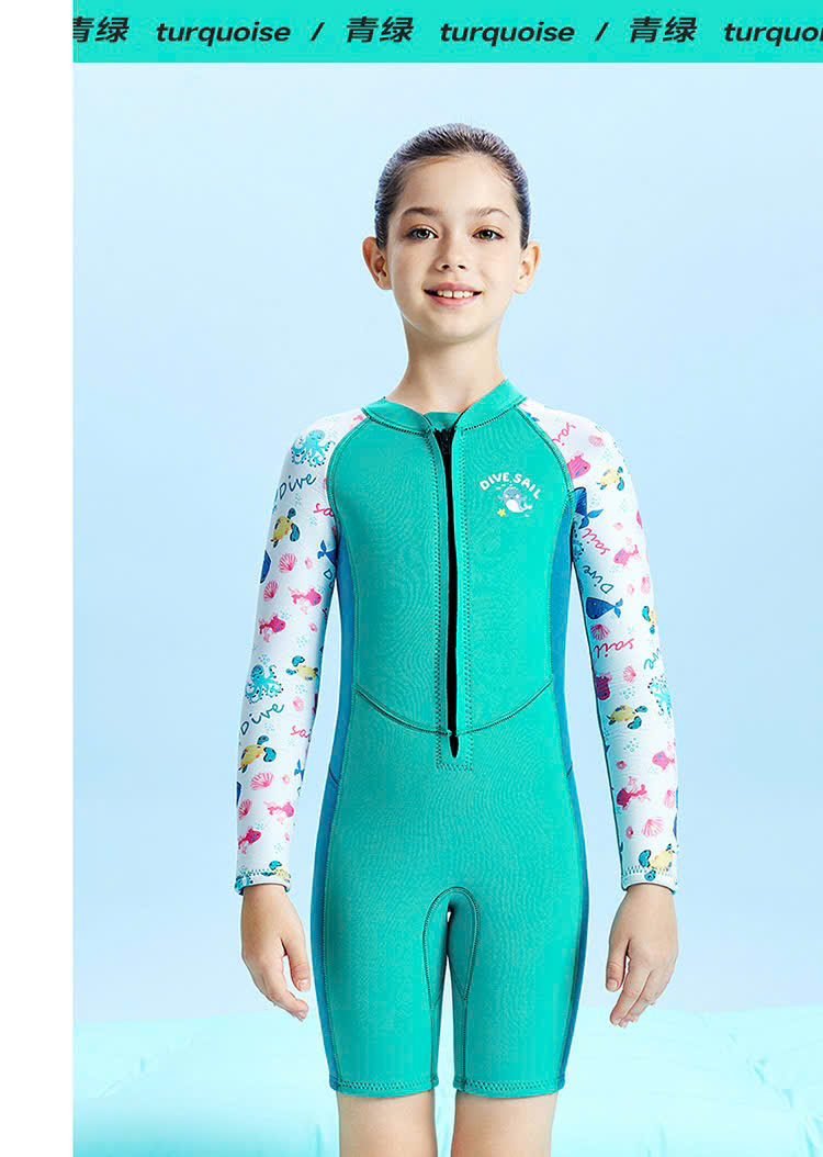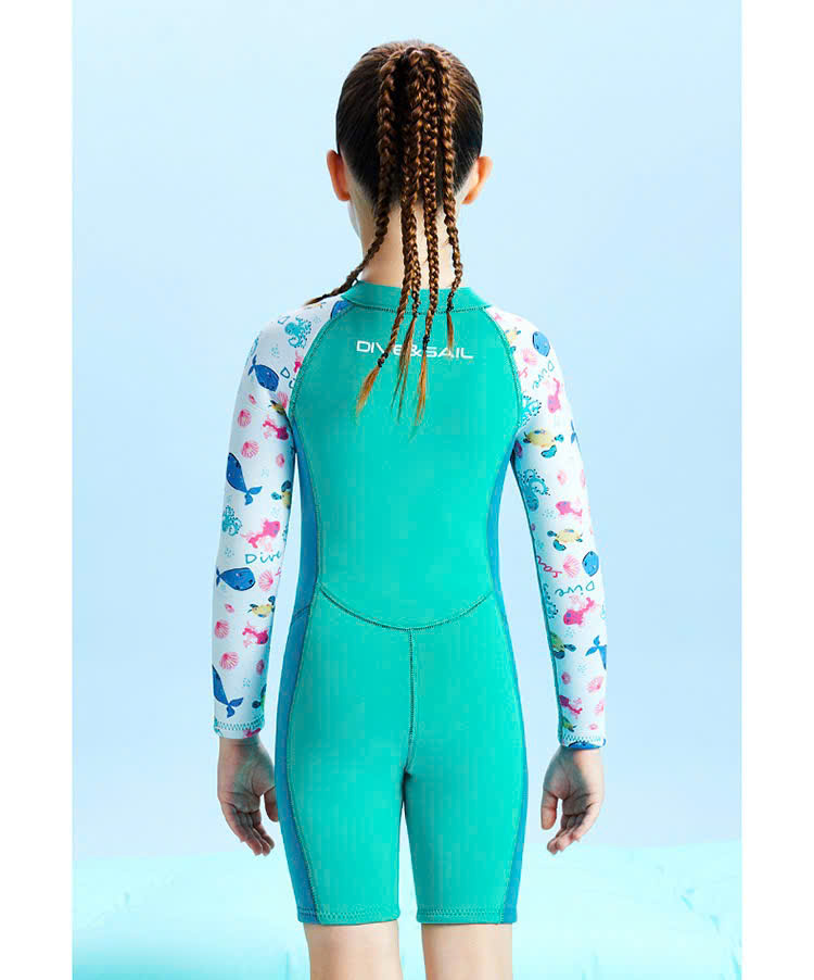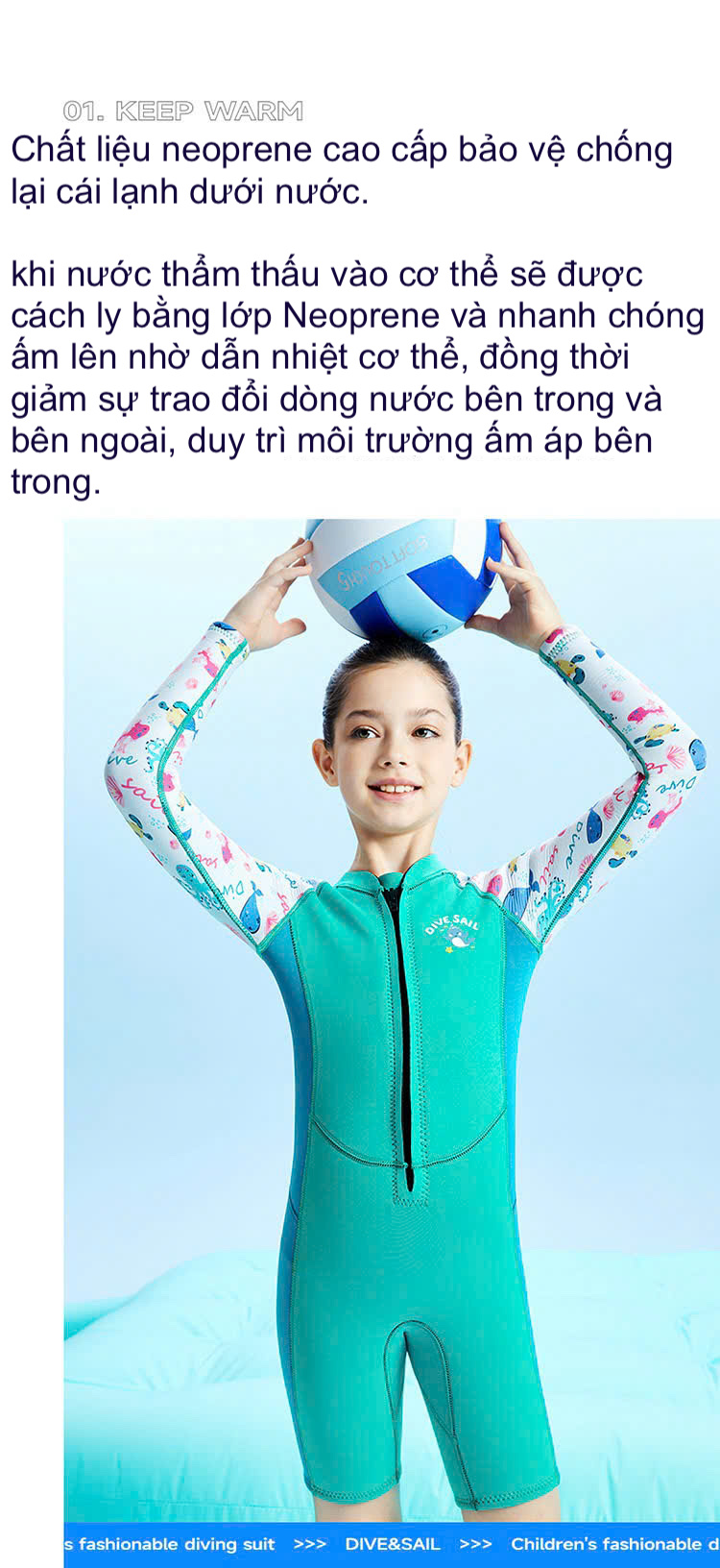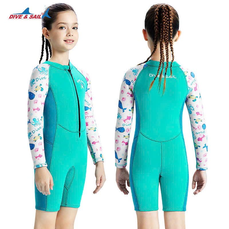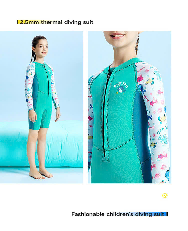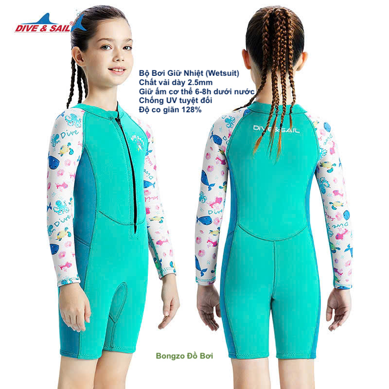 Bộ bơi giữ nhiệt bé gái, dài tay, màu xanh tay trắng, vải dày 2.5mm, Dive & Sail