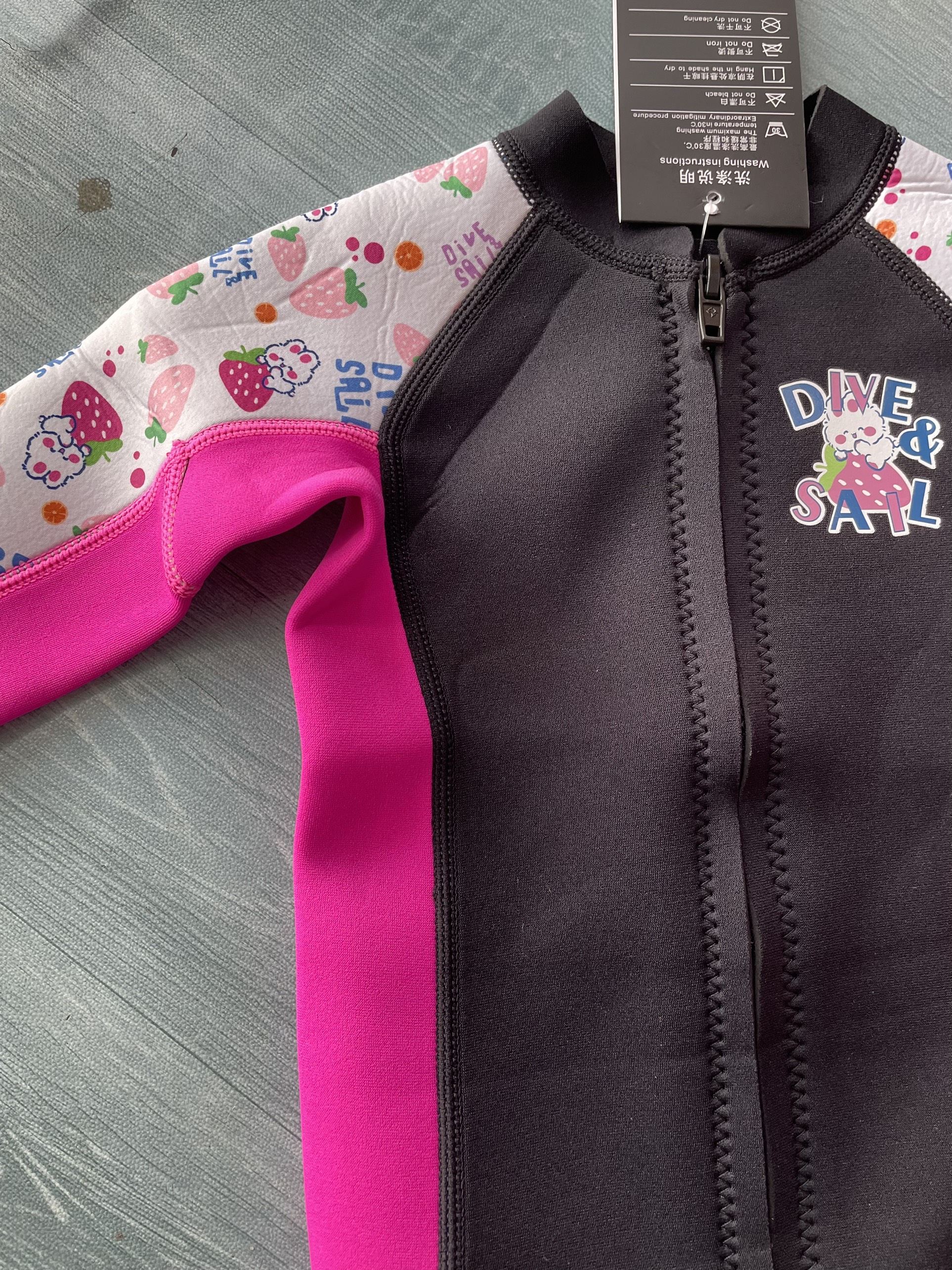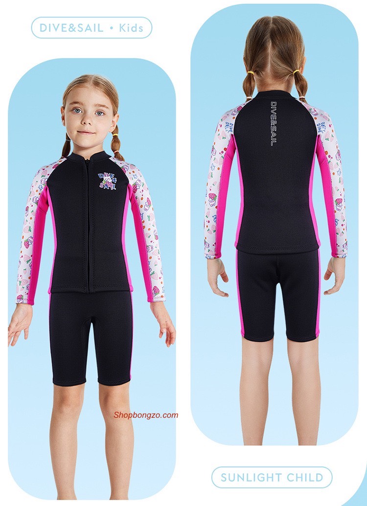 Bộ bơi giữ nhiệt bé gái dài, đen tay hồng, vải dày 2.5mm, Dive & Sail