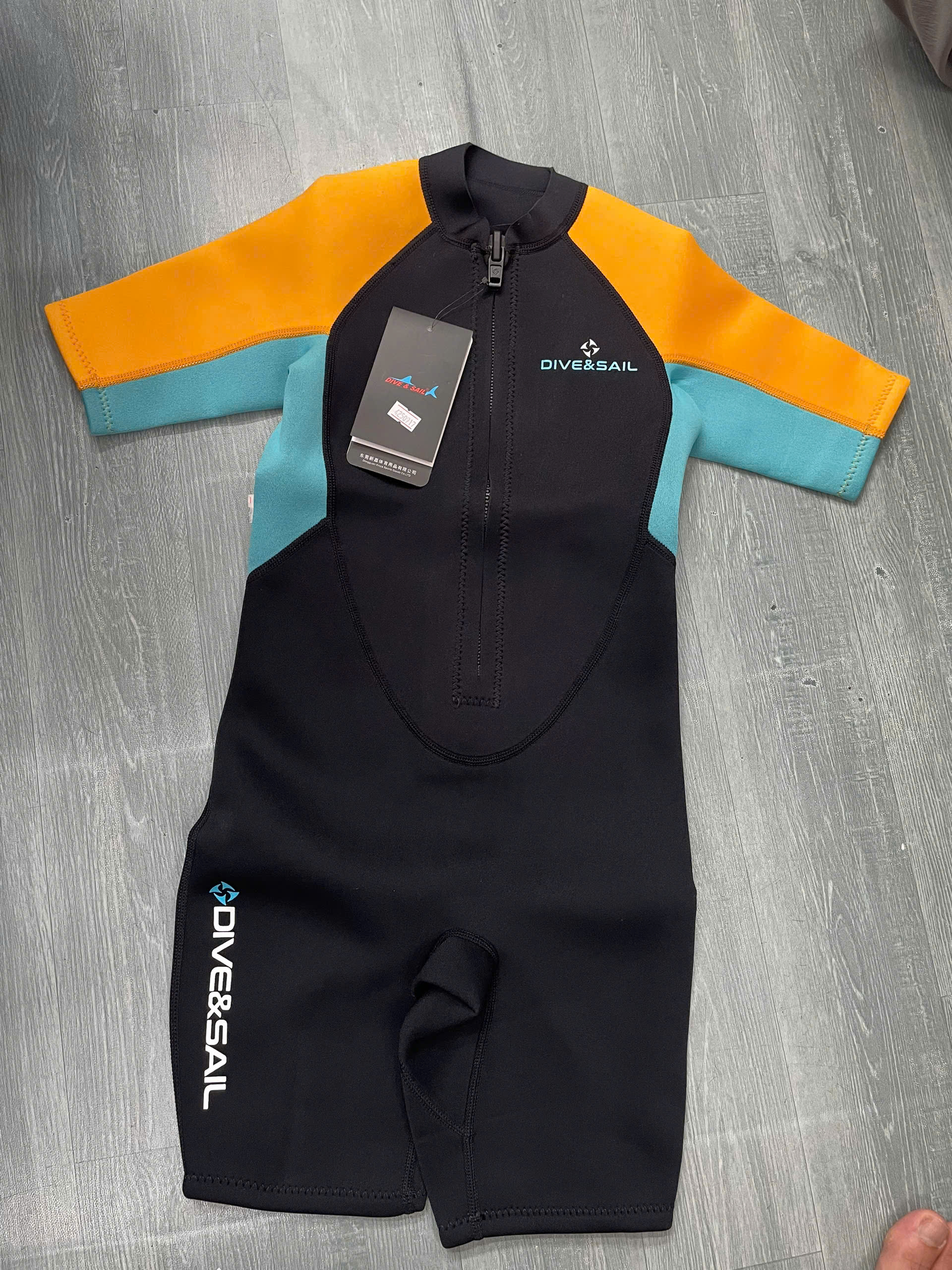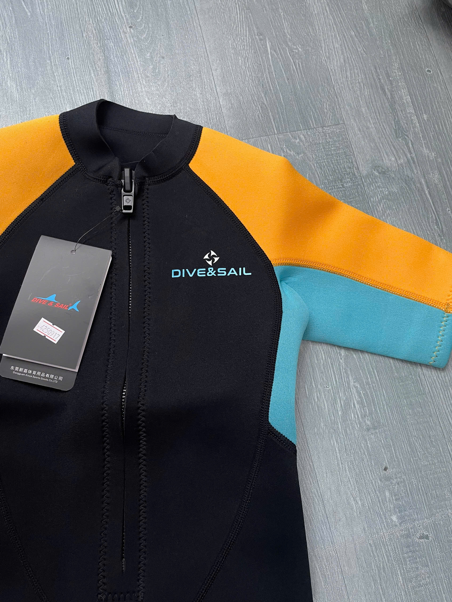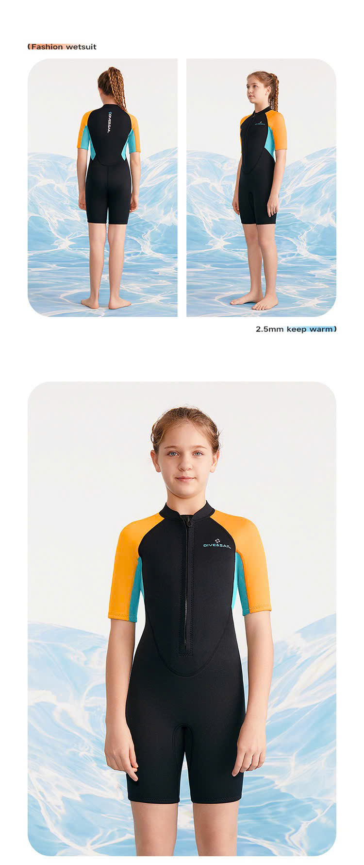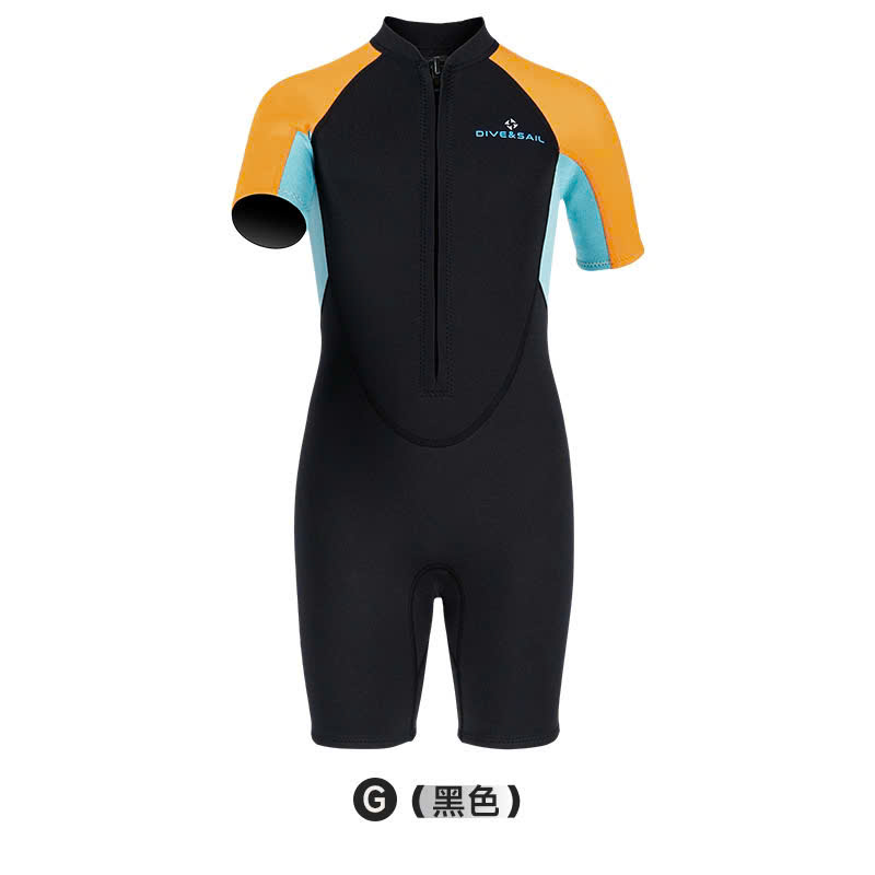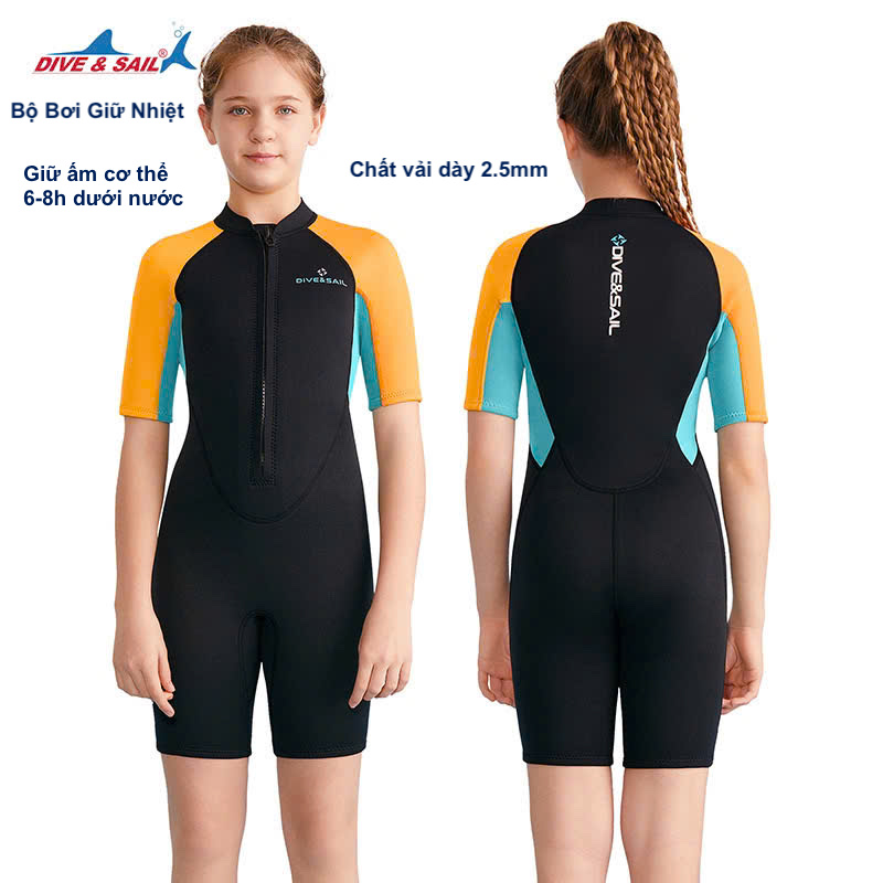 Bộ bơi giữ nhiệt bé gái, màu đen tay vàng, vải giữ nhiệt 2.5mm, Dive & Sail