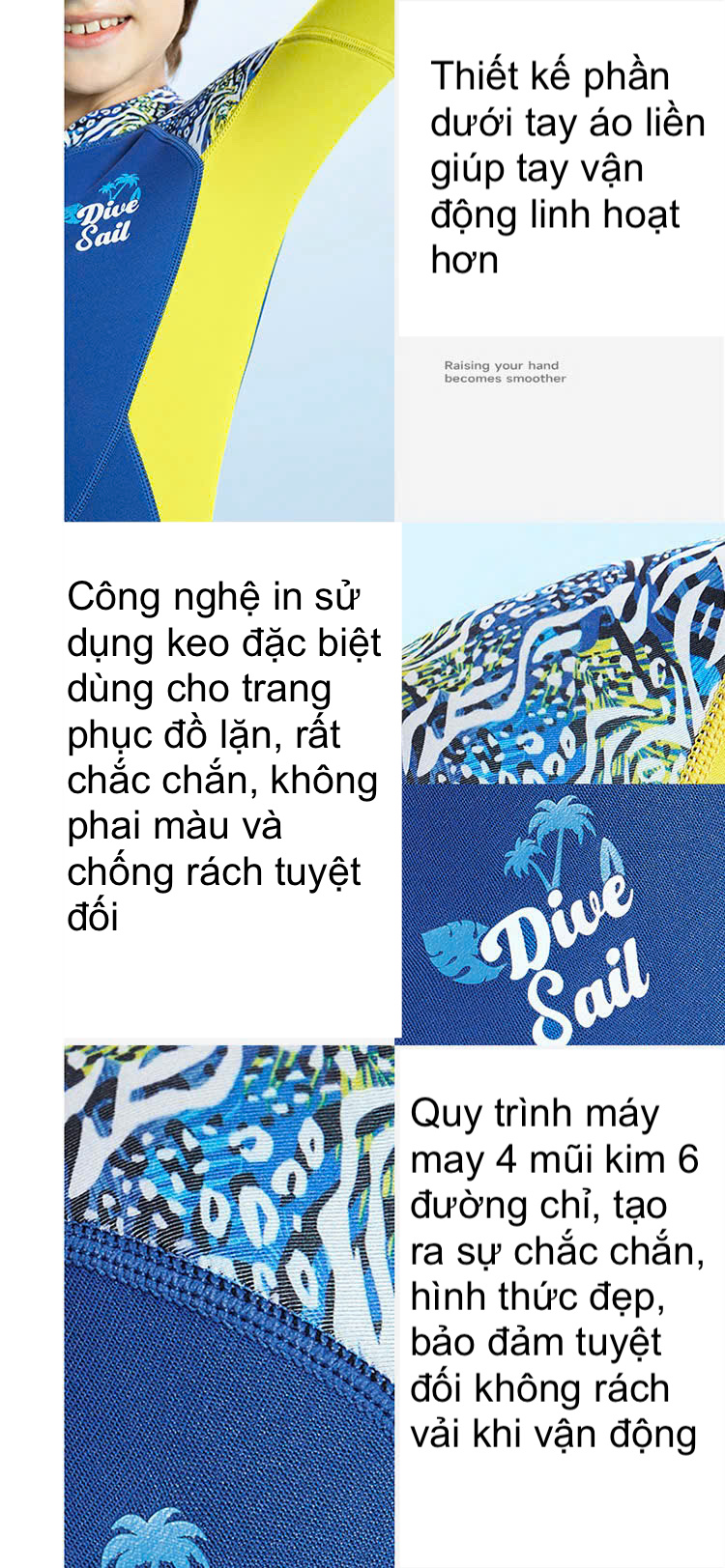 - Công nghệ in sử dụng keo đặc biệt dùng cho trang phục đồ lặn, rất chắc chắn, không phai màu và chống rách tuyệt đối