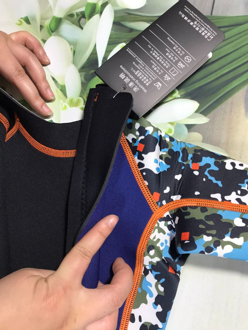 - Chất liệu vải gồm 3 tầng : lớp ngoài cùng vải nylon đàn hồi, lớp giữa là neoprene 2mm, lớp trong bằng vải nylon đàn hồi màu đen