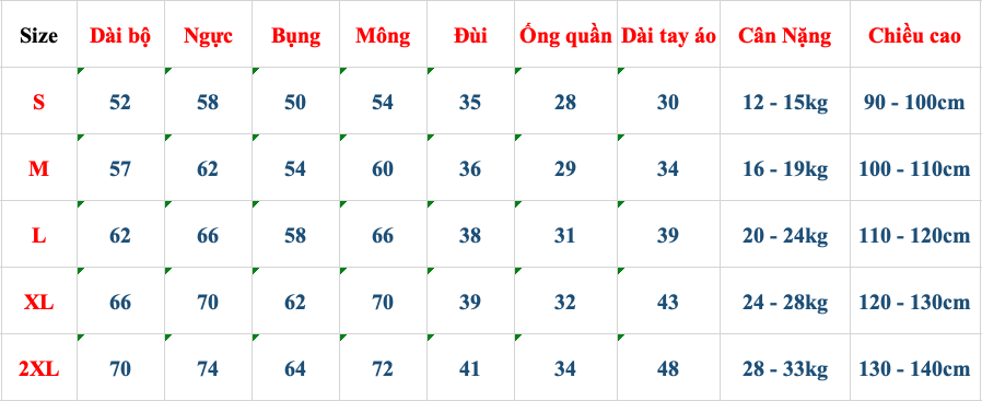(Đã tính size cho các bé mặc thoải mái chút, và tâm lý trẻ em nhanh lớn của bố mẹ, nên chọn size theo đúng cân nặng của bé theo bảng size dưới đây)