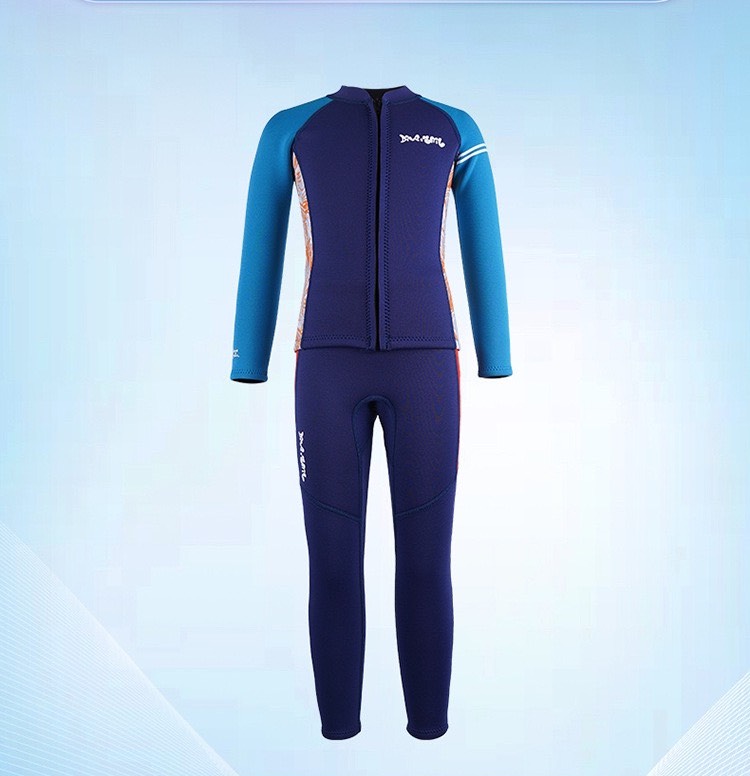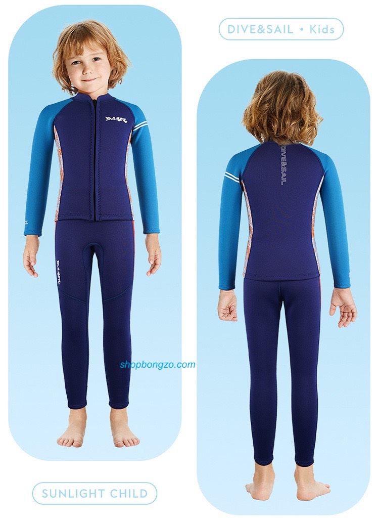 Bộ bơi giữ nhiệt bé gái, dài tay, màu xanh tay trắng, vải dày 2.5mm, Dive & Sail