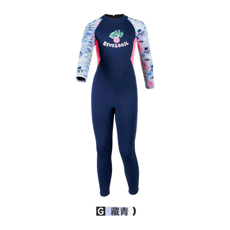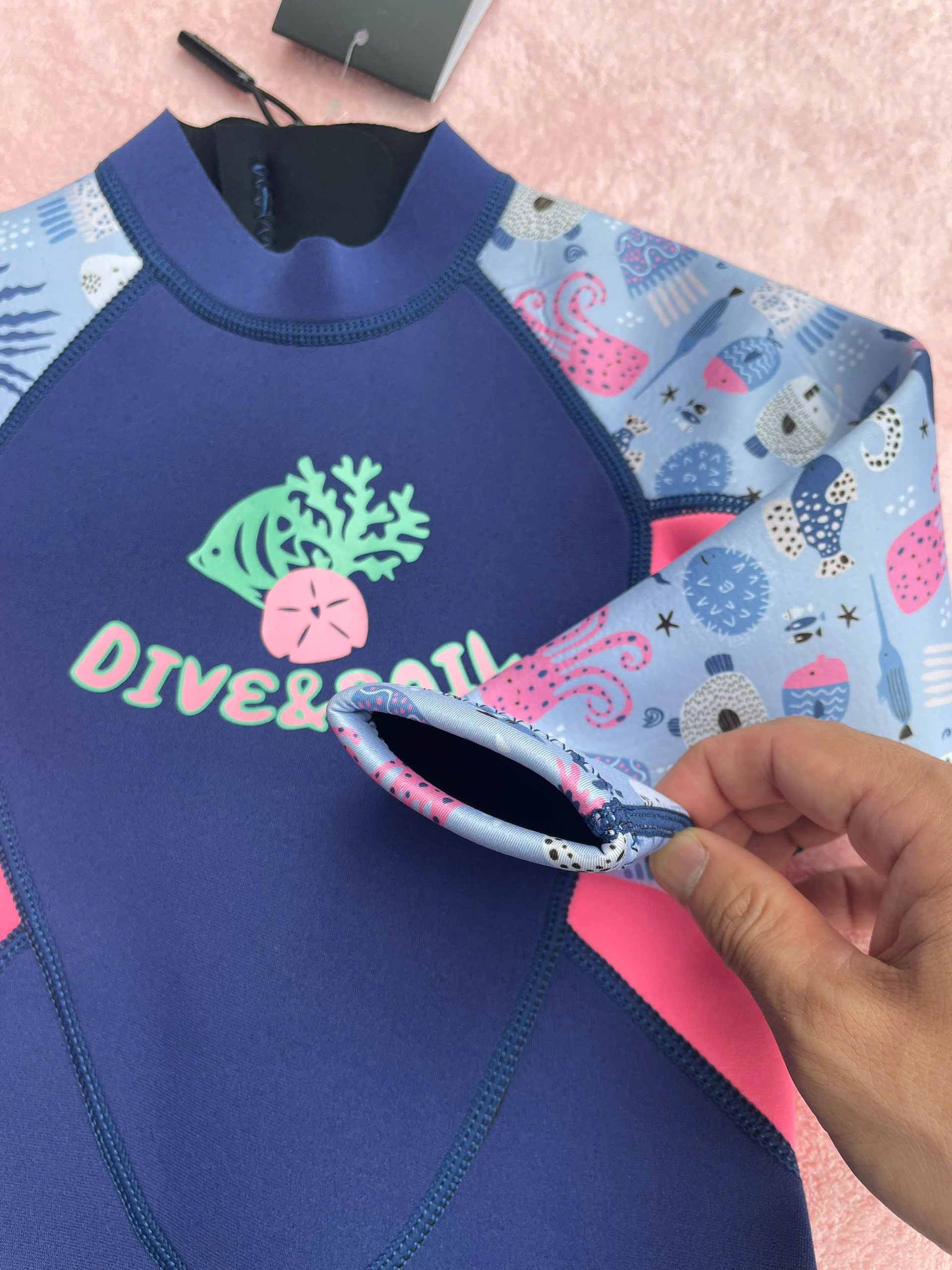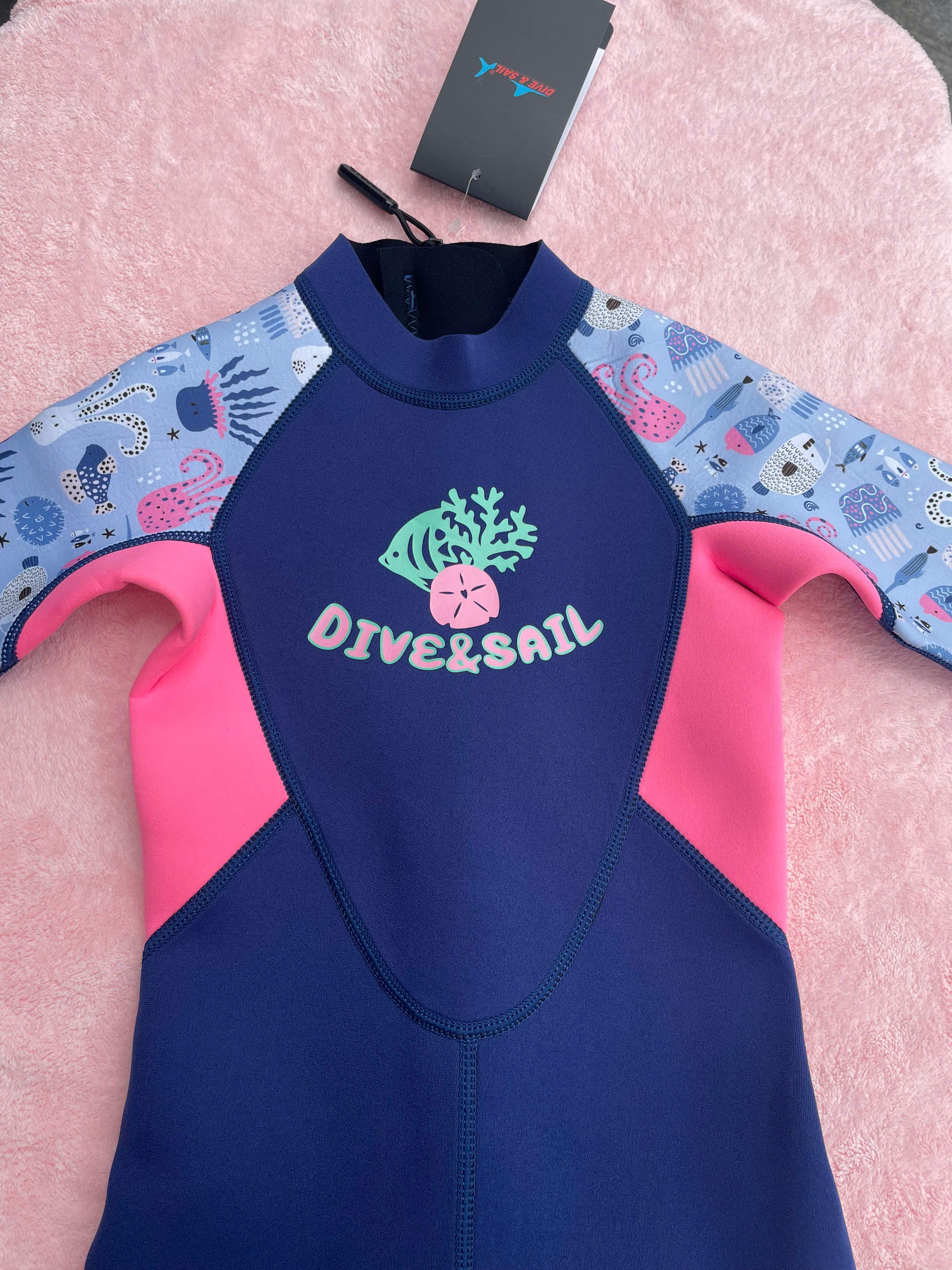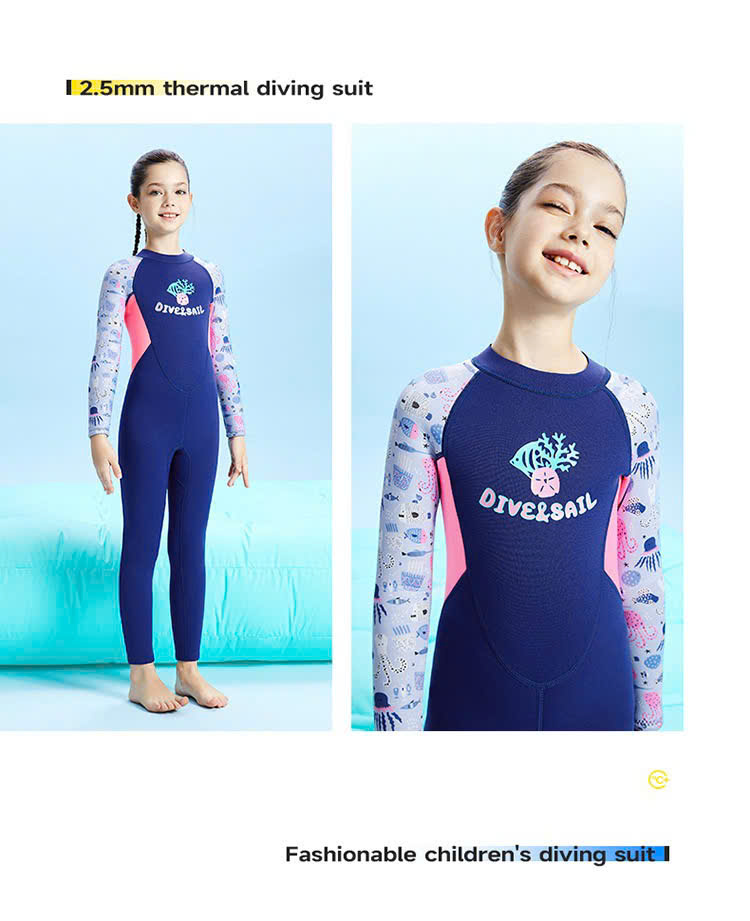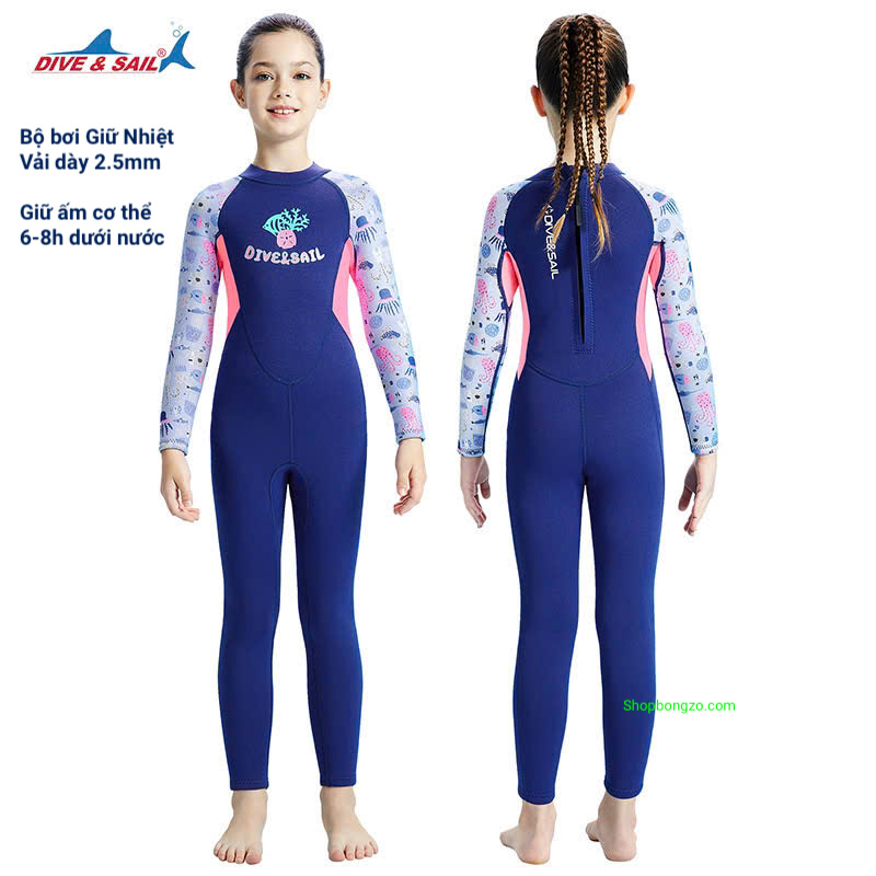 Bộ bơi giữ nhiệt bé gái, dài tay, màu xanh tay trắng, vải dày 2.5mm, Dive & Sail