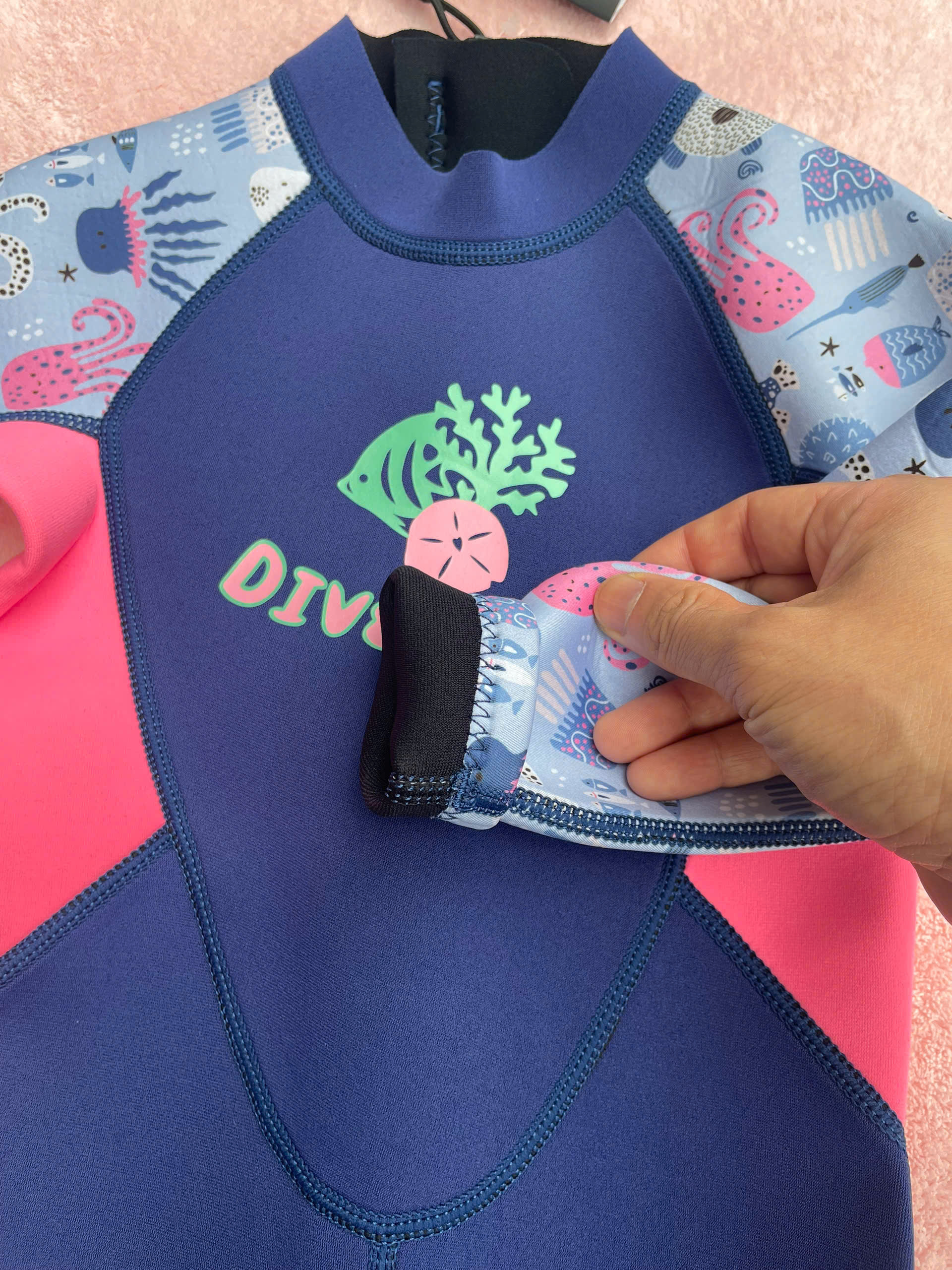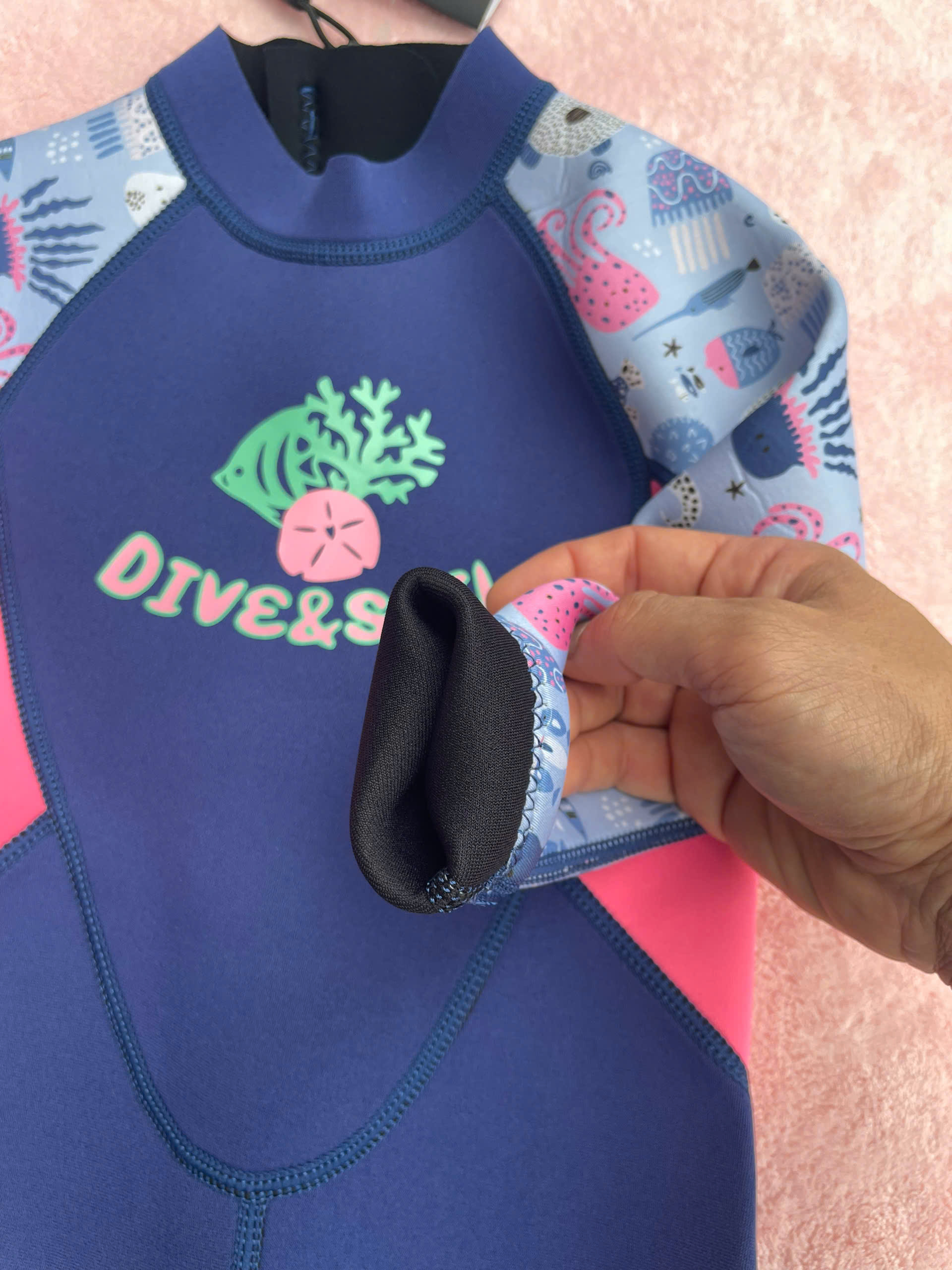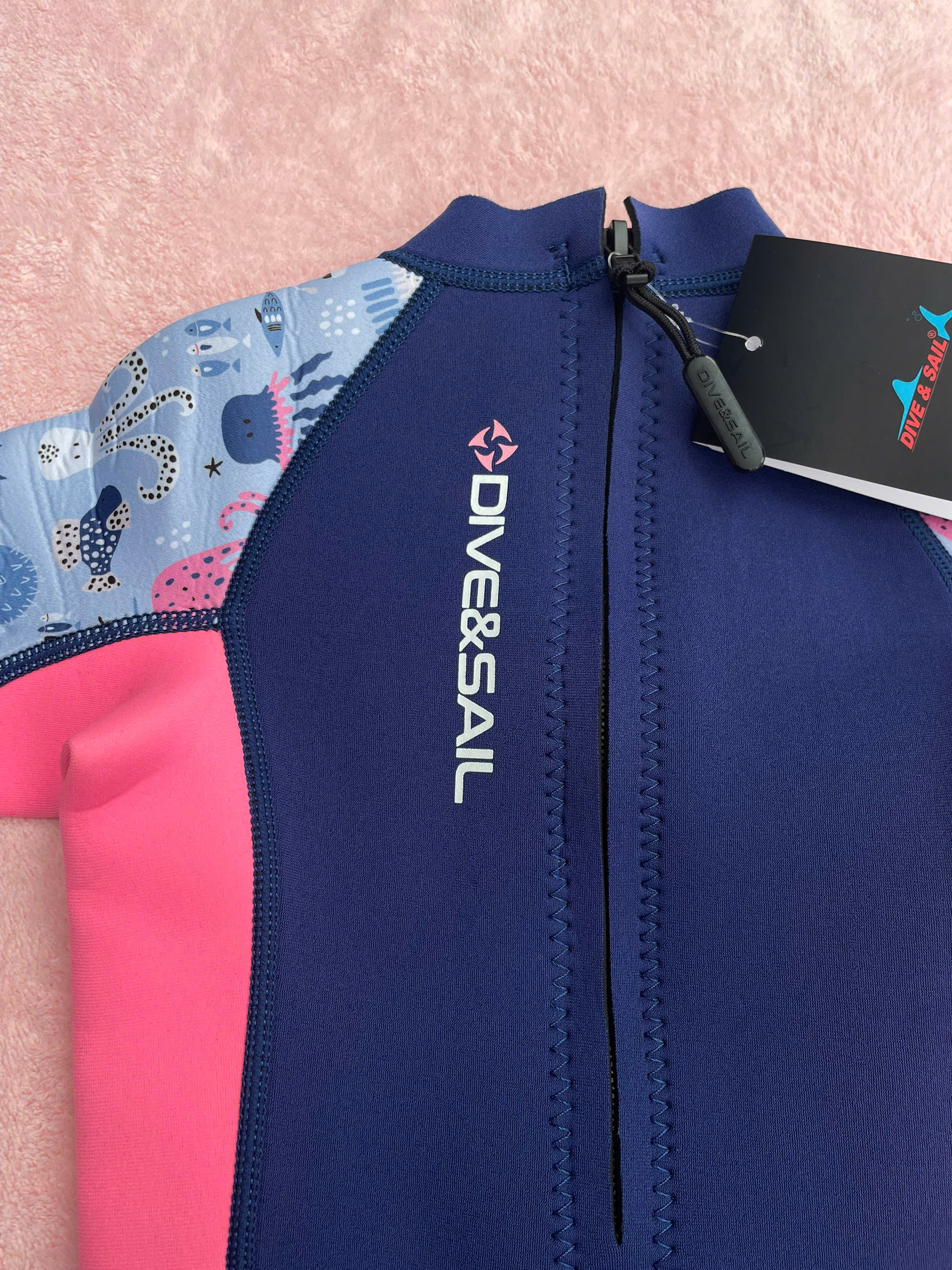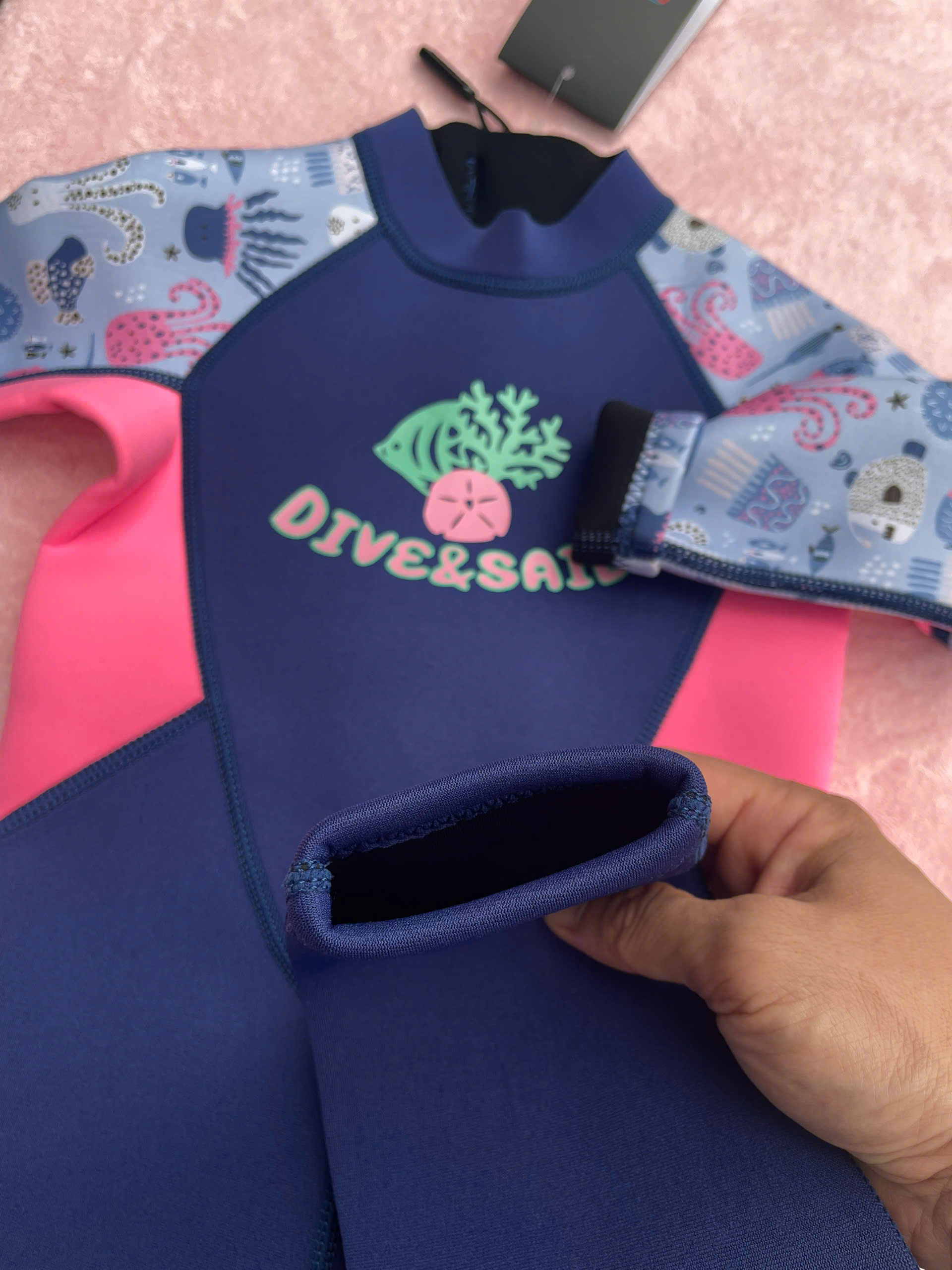 Bộ bơi giữ nhiệt bé gái, dài tay, màu xanh tay trắng, vải dày 2.5mm, Dive & Sail
