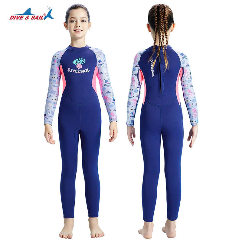 Bộ bơi giữ nhiệt bé gái, màu đen tay vàng, vải giữ nhiệt 2.5mm, Dive & Sail