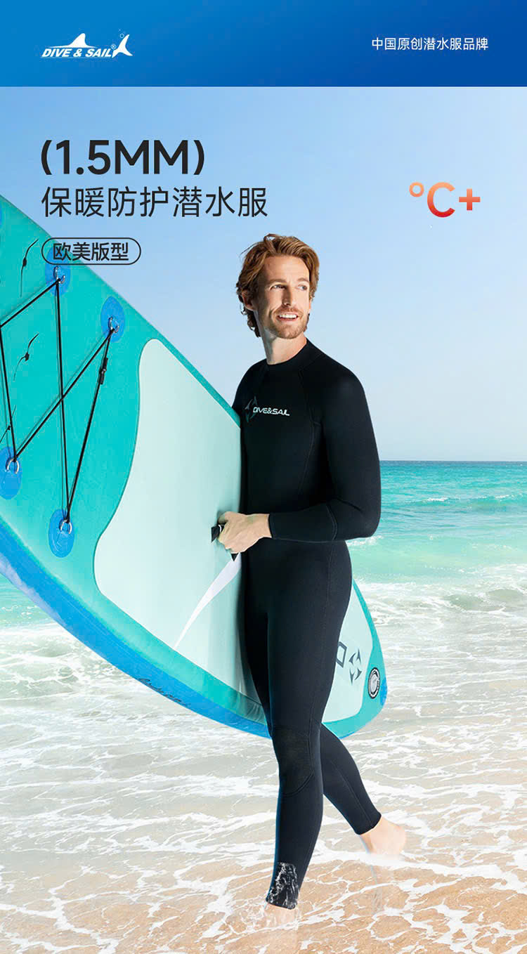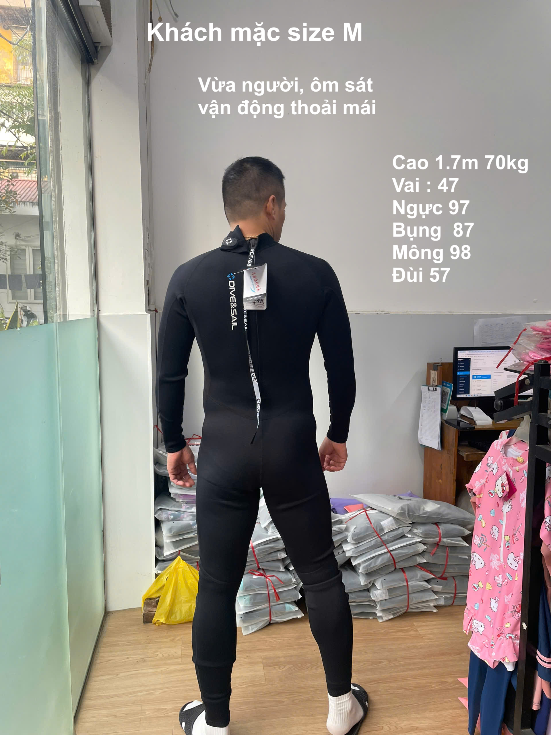 Bộ bơi giữ nhiệt nam, dài tay dáng rời, màu đen, vải dày 1.5mm Dive Sail