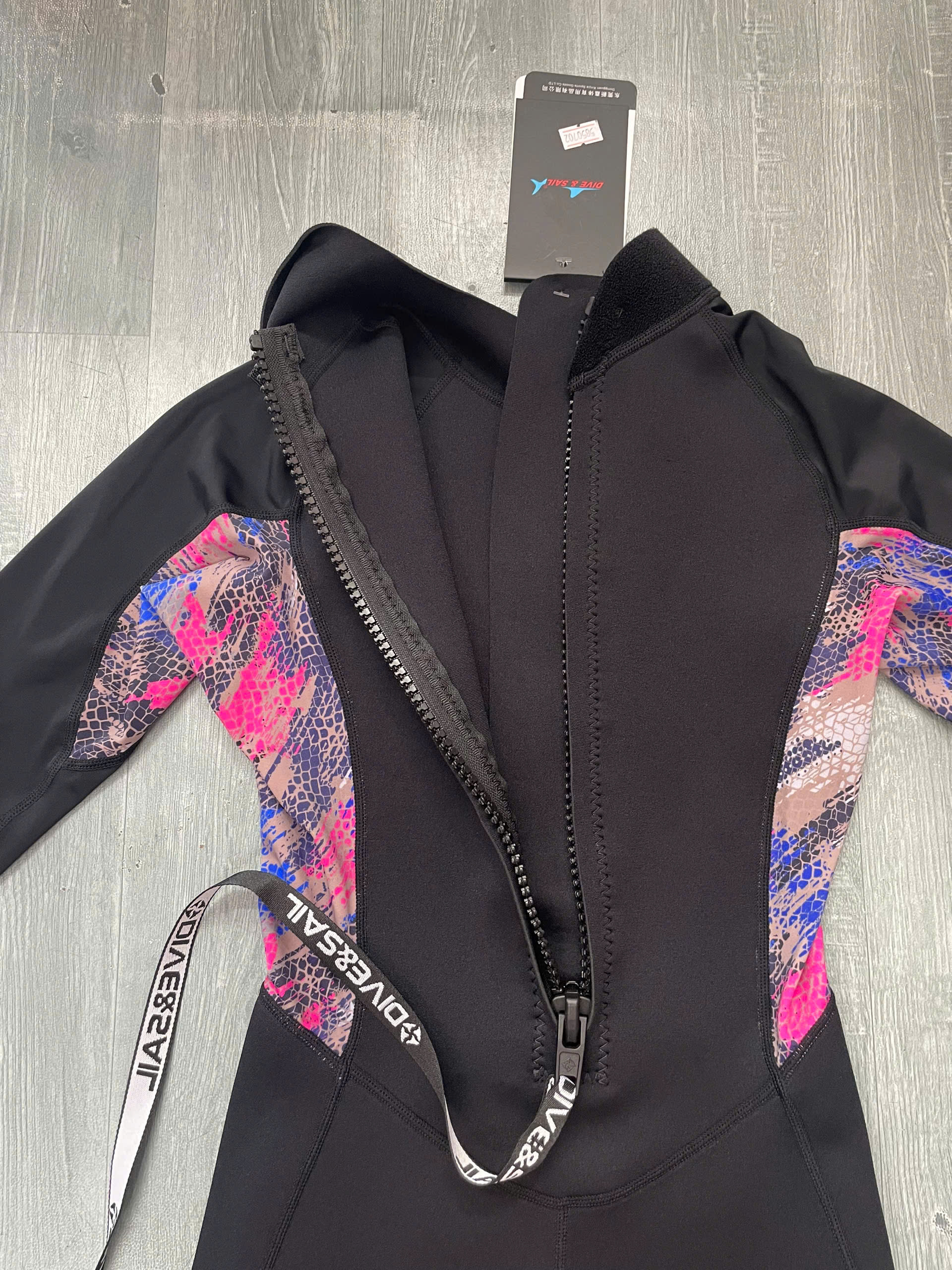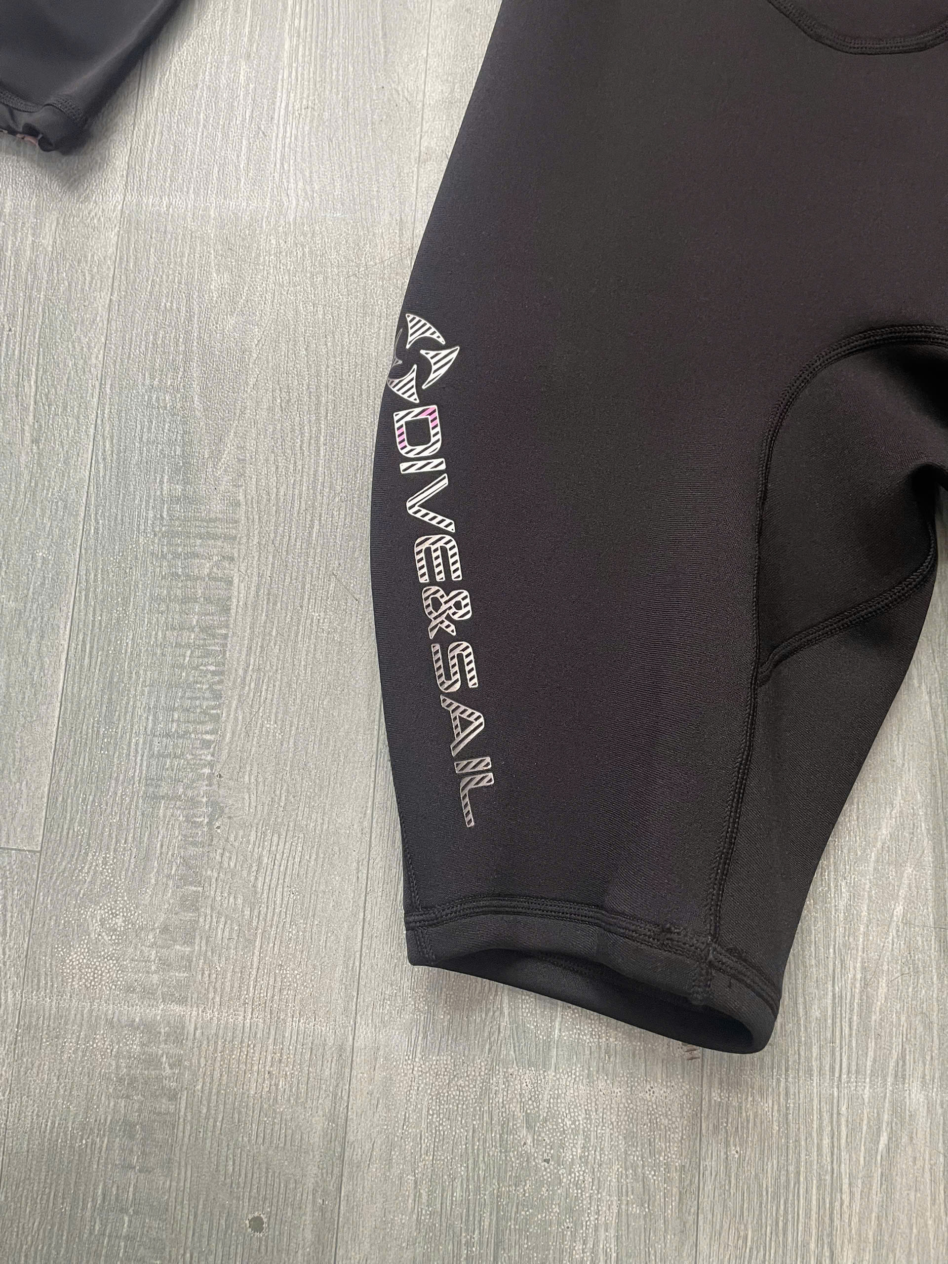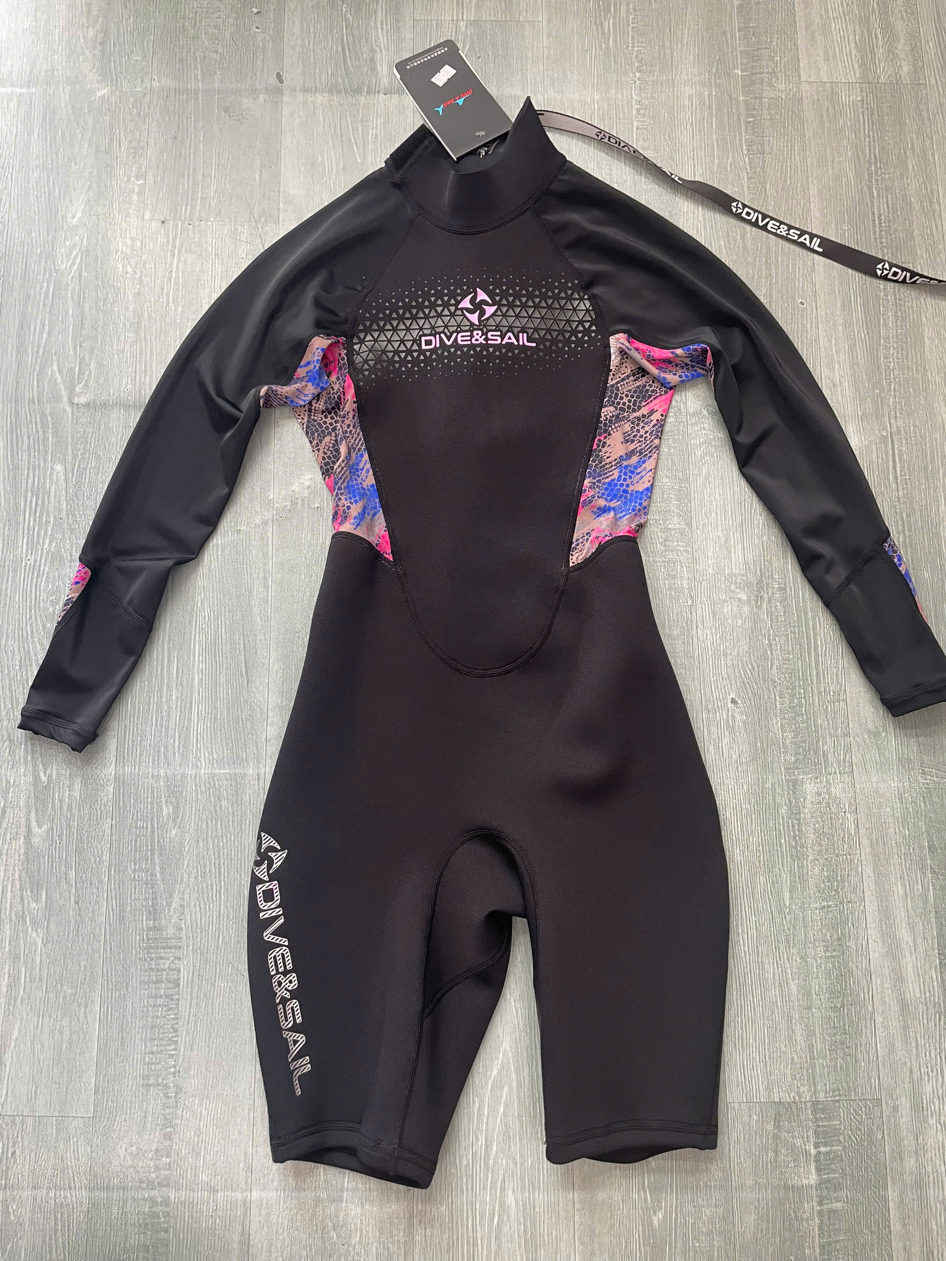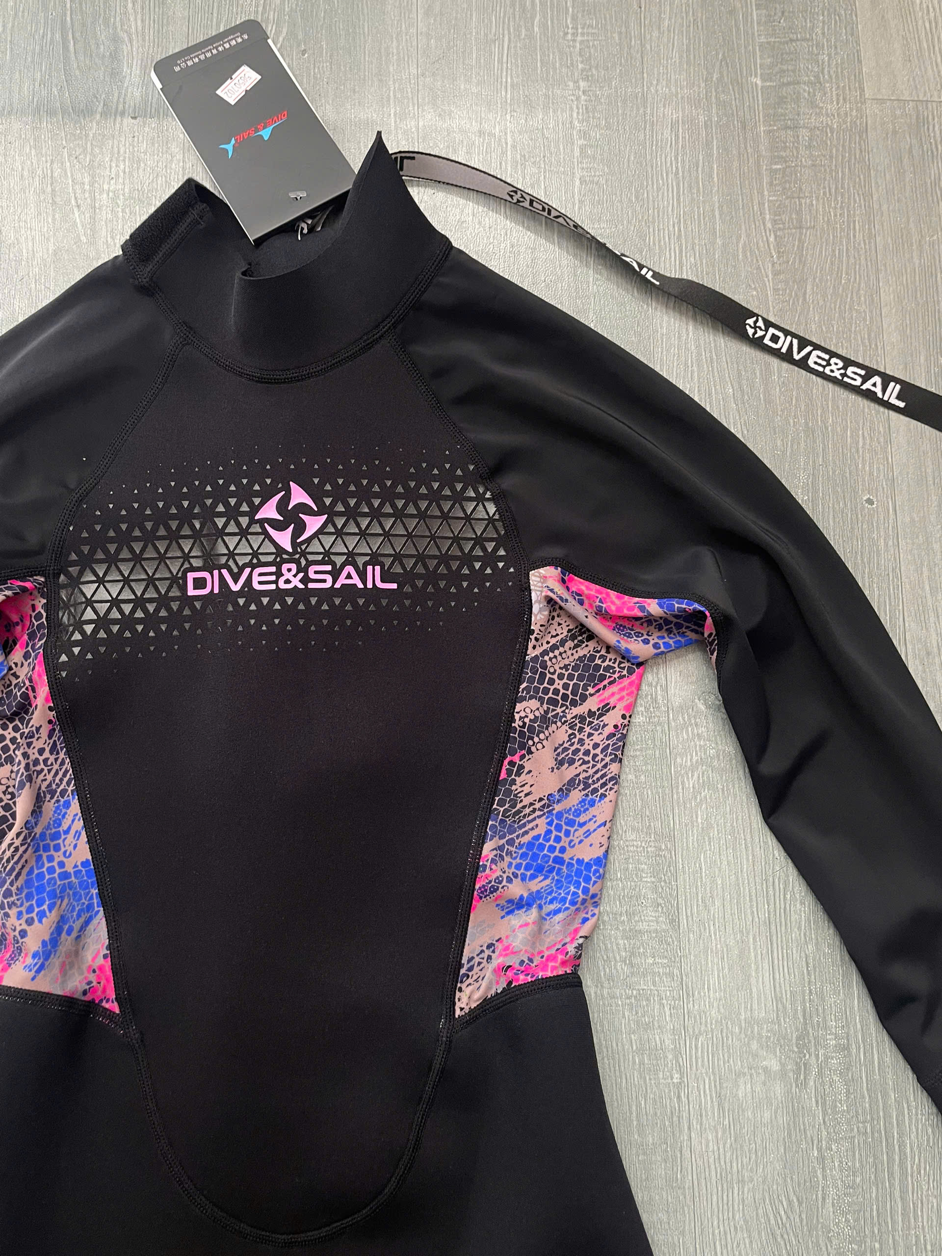 Bộ bơi giữ nhiệt nữ, dáng dài tay quần ngắn, màu đen hồng, vải 1.5mm Dive & Sail