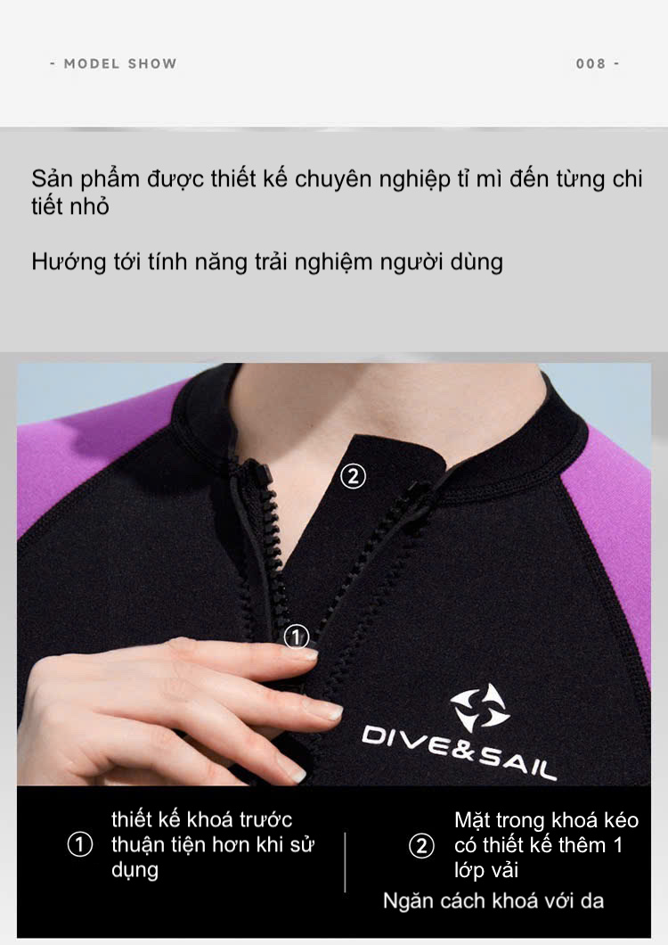 Bộ bơi giữ nhiệt nữ, vải dày 3mm chống lạnh, màu đen tím, dài tay, dáng rời Dive & Sail