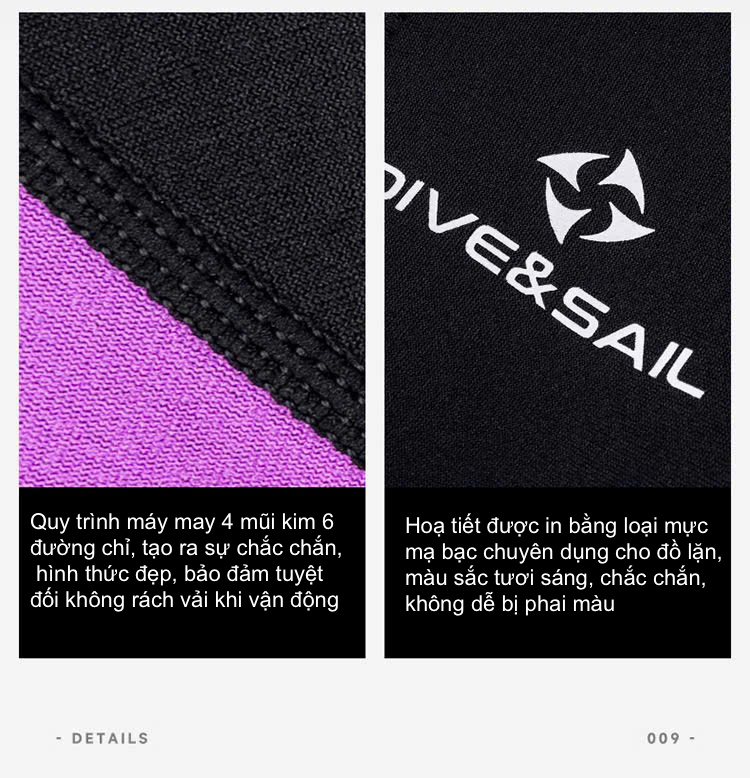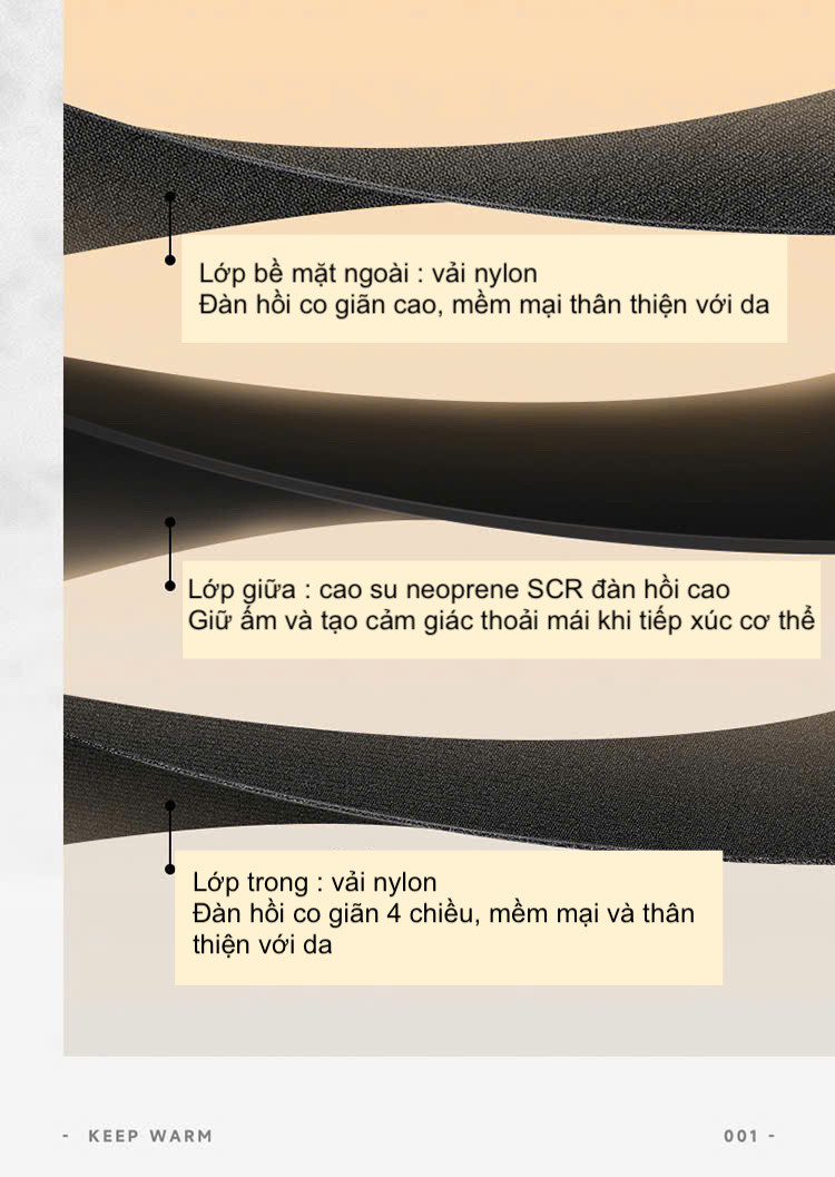 - Thiết kế đặc biệt vải cấu tạo 3 lớp : Ngoài cùng Nylon co giãn mềm mại, lớp giữa cao su cloropren có tính đàn hồi.