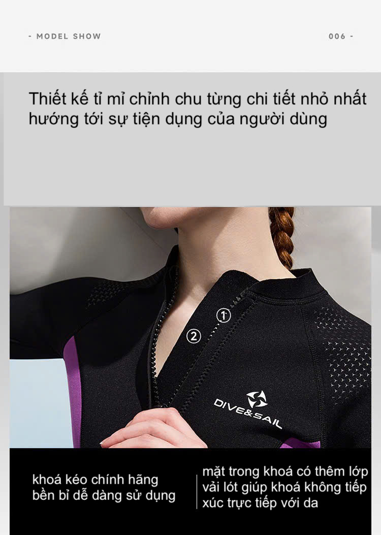 PHÙ HỢP Mùa hè & mùa lạnh khi bơi cảm thấy lạnh Người có thể trạng yếu, trẻ em dễ nhiễm lạnh Bơi buổi sáng, bơi bể, hồ, sông, suối,… THƯƠNG HIỆU : DIVE & SAIL KIỂU DÁNG Dài tay, kéo khoá trước Mặt trong khoá kéo có thiết kế thêm 1 lớp vải, ngăn cách với da, nhằm tác dụng tránh khoá tiếp xúc trực tiếp với da CHẤT LIỆU - Vải Neoprene (hay polychloroprene) trong tiếng Việt là cao su tổng hợp (synthetic rubber). Đây là một loại cao su có tính cân bằng giữa các tính chất cơ lý tính và tính kháng dung môi. Neoprene chịu thời tiết, kháng dầu, kháng ozon, chống lão hóa, chống nước… - Sử dụng cho người chơi lướt sóng, thợ lặn, lướt gió, chèo thuyền và các môn thể thao theo "hệ" nước Vai trò chính của dòng sản phẩm này là CÁCH NHIỆT, GIỮ NHIỆT, nổi trên nước và chống mài mòn, TRÁNH TIẾP XÚC VỚI TIA CỰC TÍM và vết chích từ đá, san hô, sinh vật biển Thiết kế đặc biệt vải cấu tạo 3 lớp : Ngoài cùng Nylon co giãn mềm mại, lớp giữa cao su cloropren có tính đàn hồi. - Vải không thấm nước, nên hạn chế tối đa nước tiếp xúc với cơ thể, nhưng không phải 100%, vì có thể nước sẽ vào cơ thể qua kẽ hở. Nhưng có thể yên tâm nước đó sẽ không làm lạnh cơ thể mà còn ngược lại do, chất liệu Wetsuit được làm từ sợi cao su tổng hợp closed - cell neoprene, loại vật liệu này cung cấp chất cách nhiệt rất tốt, chịu được thời tiết thay đổi thất thường, kháng dầu. Điều này đồng nghĩa với việc nước thâm nhập vào bên trong, duy trì như một lớp màng mỏng bao bọc quanh cơ thể, khi đó nhiệt độ bình thường của cơ thể sẽ khiến bạn làm ấm lớp nước này và hỗ trợ bạn cách ly với nước lạnh bên ngoài thông qua wetsuit - Độ dày vải 2.0mm - Giữ ấm cơ thể 6-8h dưới nước - Công nghệ in sử dụng keo đặc biệt dùng cho trang phục đồ lặn, rất chắc chắn, không phai màu và chống rách tuyệt đối - Độ co giãn 4 chiều, đàn hồi 128%, thoải mái vận động - Quy trình máy may 4 mũi kim 6 đường chỉ, tạo ra sự chắc chắn, hình thức đẹp, bảo đảm tuyệt đối không rách vải khi vận động - Chống UV tuyệt đối LƯU Ý - Do đặc tính cao su tổng hợp sẽ có mùi, 3 lớp vải đã trải qua quá trình kiểm tra an toàn nghiêm ngặt. Mùi này vô hại với cơ thể con người và có thể yên tâm sử dụng. Hơn nữa sản phẩm mới để lâu trong túi đóng gói, khi mới lấy sẽ có mùi. Sau khi giặt, phơi khô, thông gió sử dụng, mùi này sẽ dần bay đi - Sản phẩm có thể có những nếp nhăn không tránh khỏi khi nhận hàng, do sản phẩm mới sản xuất xong được gấp gọn vào túi vận chuyển, bạn có thể yên tâm sau quá trình sử dụng nếp nhăn này sẽ nhanh chóng hết - Trước khi xuống nước, nên mặc bộ bơi vào rồi tráng trước qua nước sạch để hạn chế nước bể bơi thấm vào bộ bơi. Sau khi bơi xong cũng làm tương tự - Dùng xong chỉ cần tráng bộ bơi qua nước sạch - Không giặt máy, chất tẩy rửa - Không là (ủi) CAM KẾT CHỈ BÁN HÀNG CHÍNH HÃNG ĐỒ BƠI NHẬP CHÍNH HÃNG Xem hàng trực tiếp tại : 25 Nguyễn Chí Thanh - Ba Đình - Hà Nội Ship toàn quốc, nhận hàng kiểm tra trước Nhận hàng kiểm tra trước khi thanh toán web : https://shopbongzo.com Hotline / Zalo : 094 6886 012 - 034 994 0705 Map shop : https://maps.app.goo.gl/N1WBJNvGUfo6o1jp7?g_st=com.google.maps.preview.copy455.000₫ -