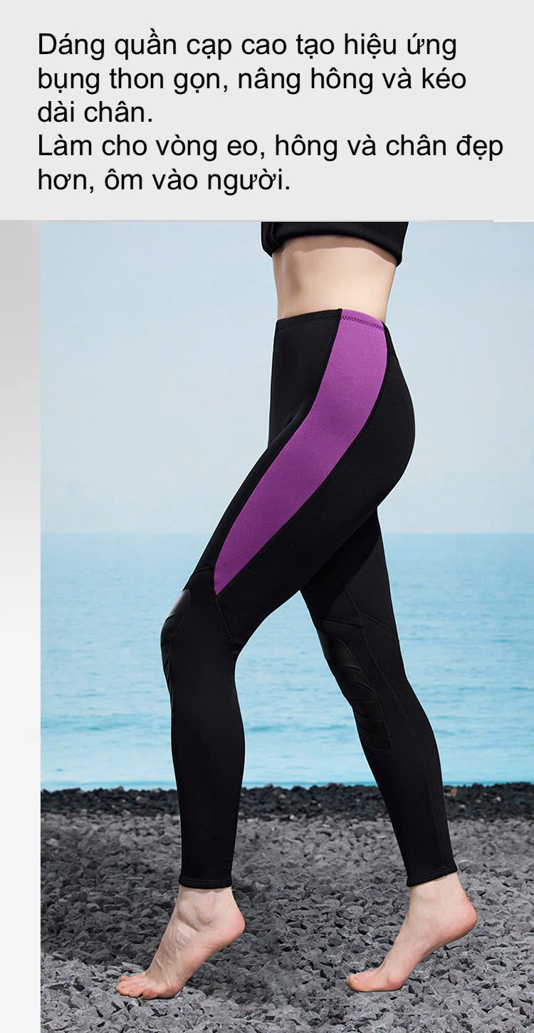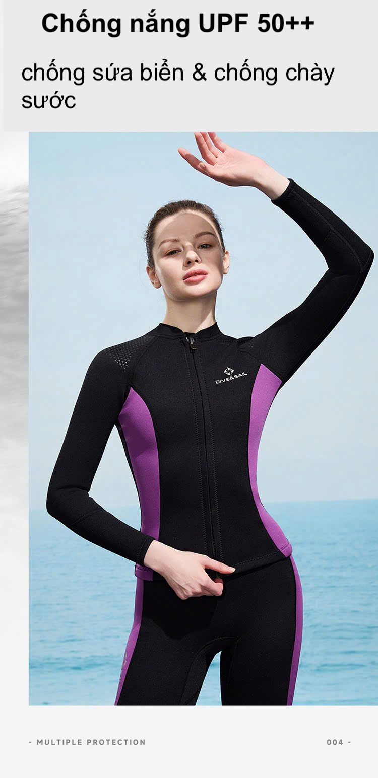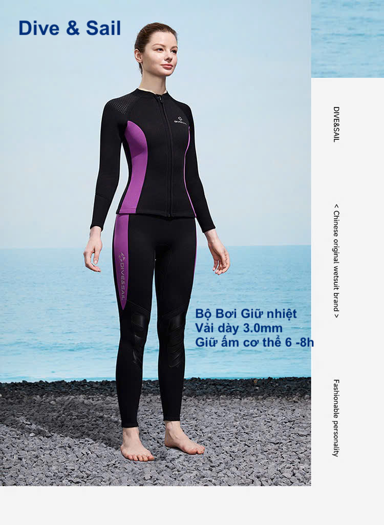 Bộ bơi giữ nhiệt nữ, vải dày 3mm chống lạnh, màu đen tím, dài tay, dáng rời Dive & Sail