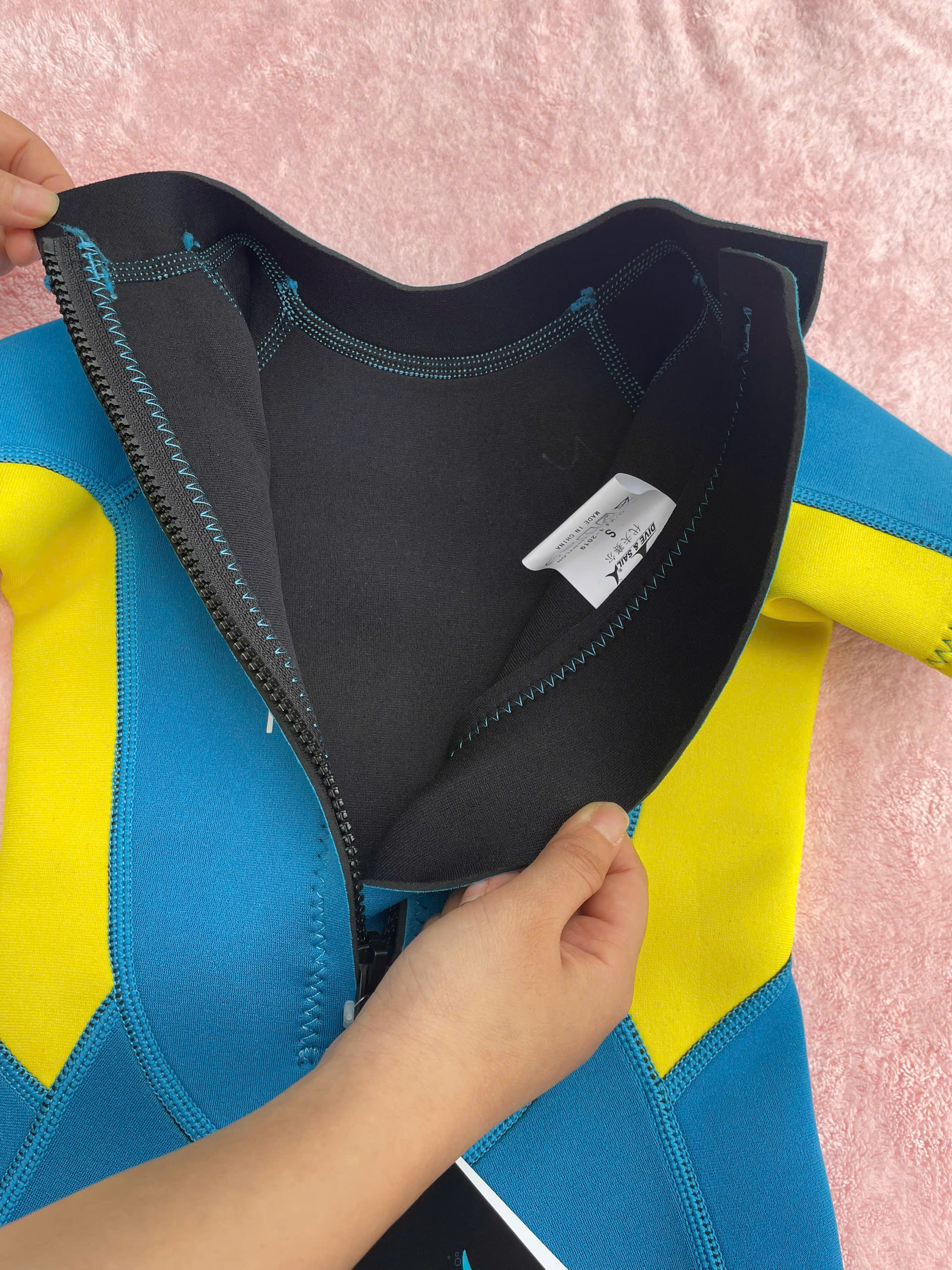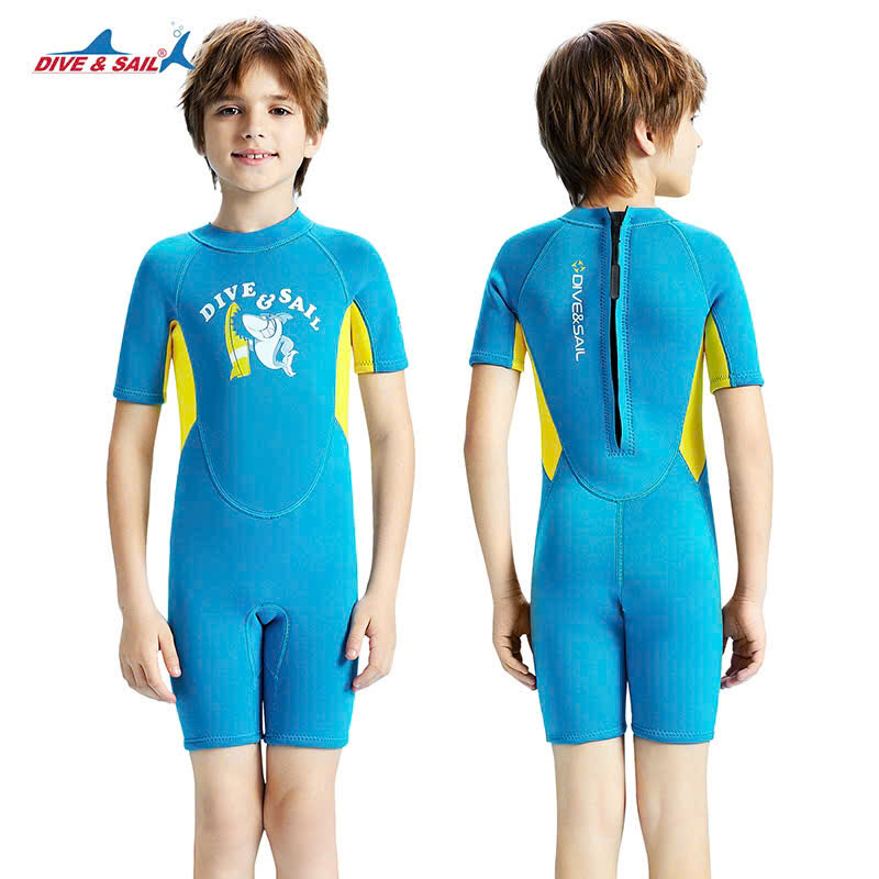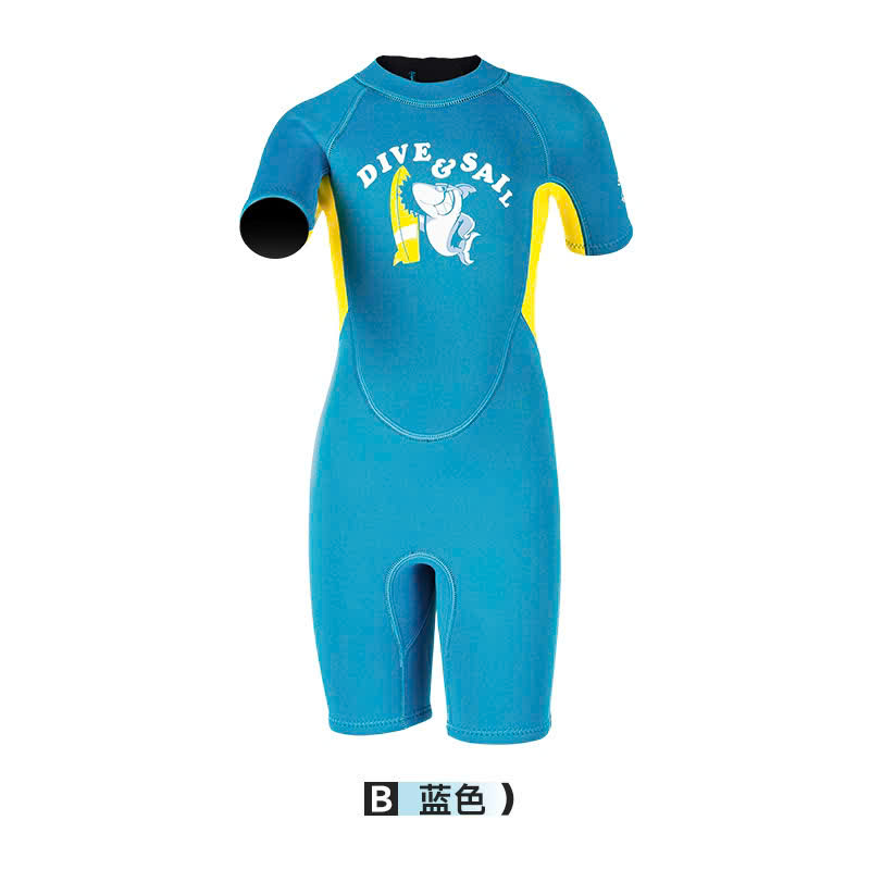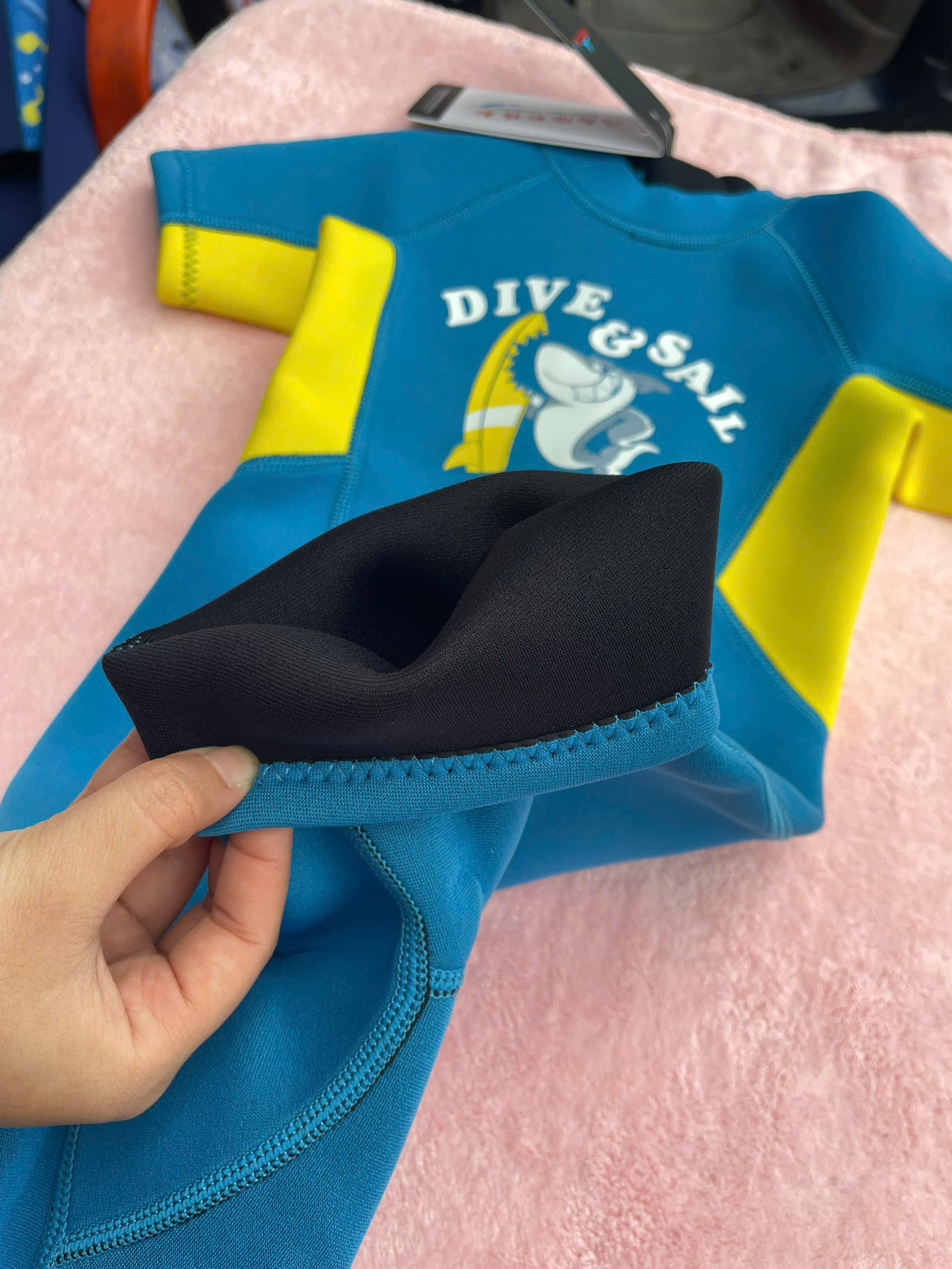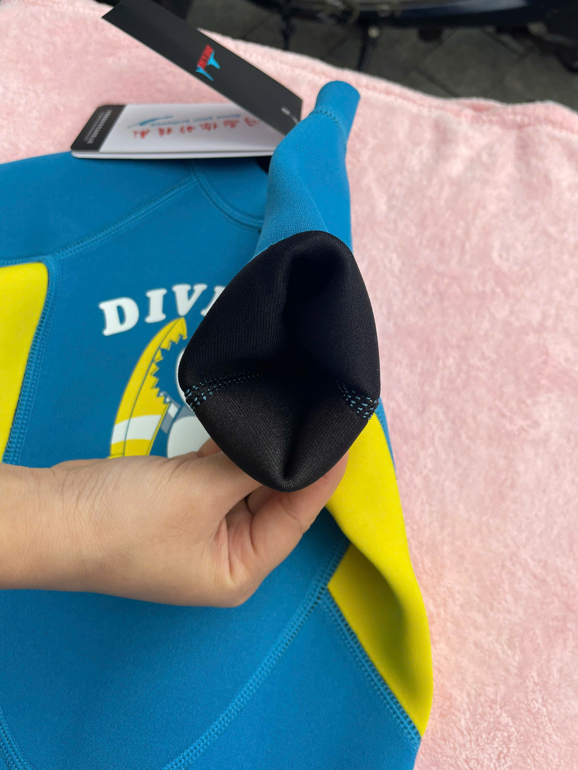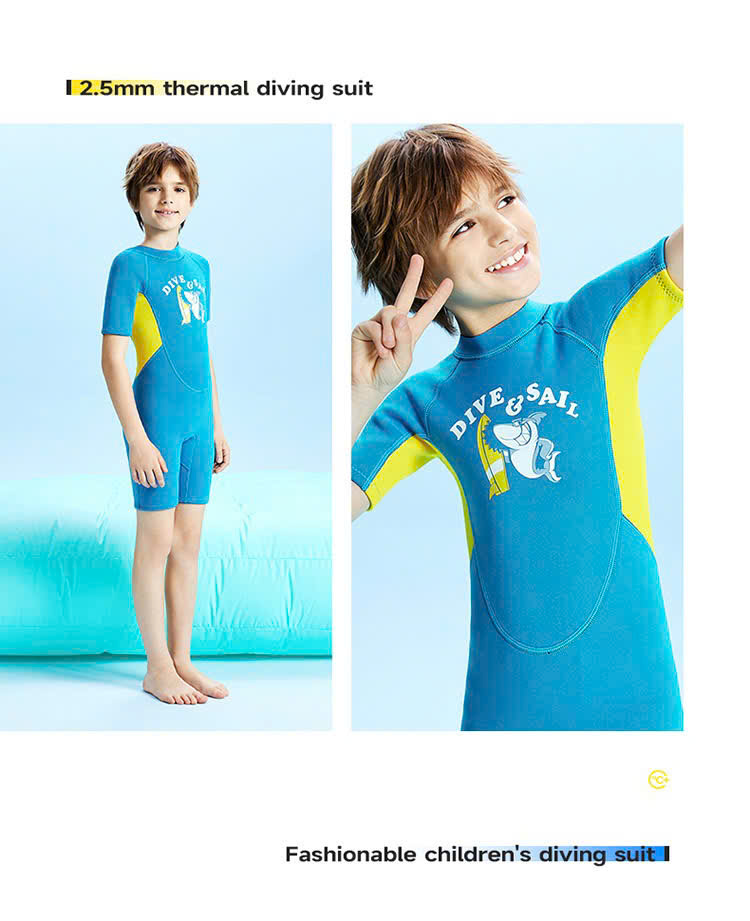 Bộ bơi giữ nhiệt vải dày 2.5mm, màu xanh hình cá, cộc tay liền, Dive & Sail