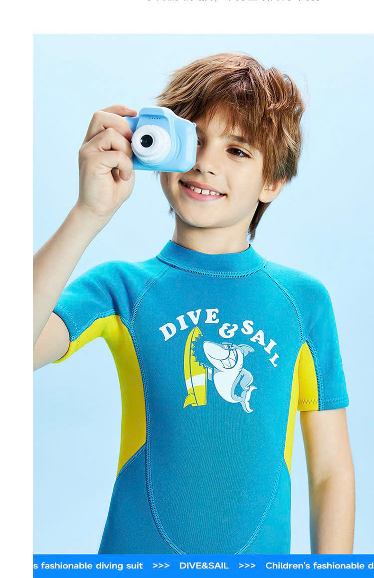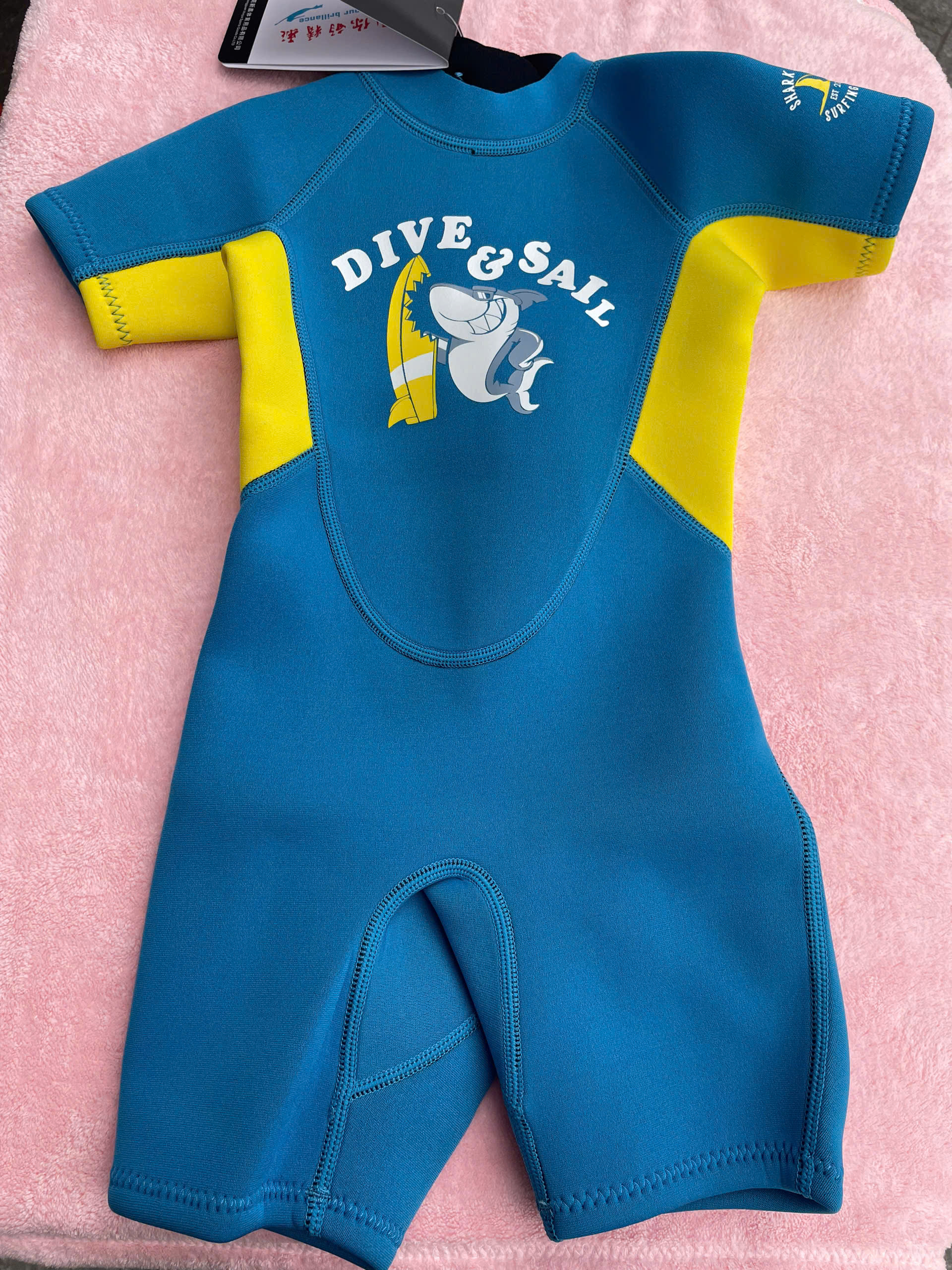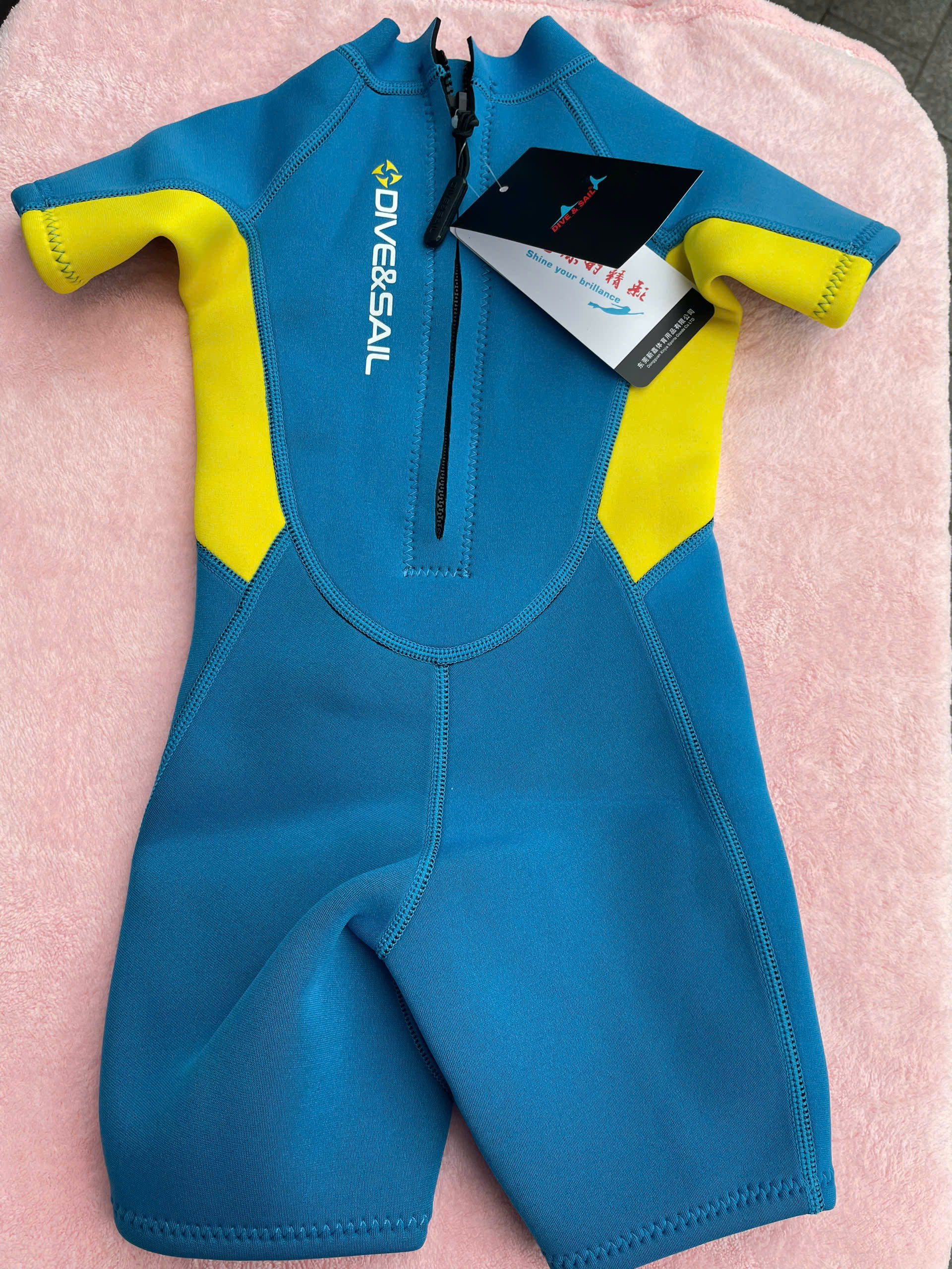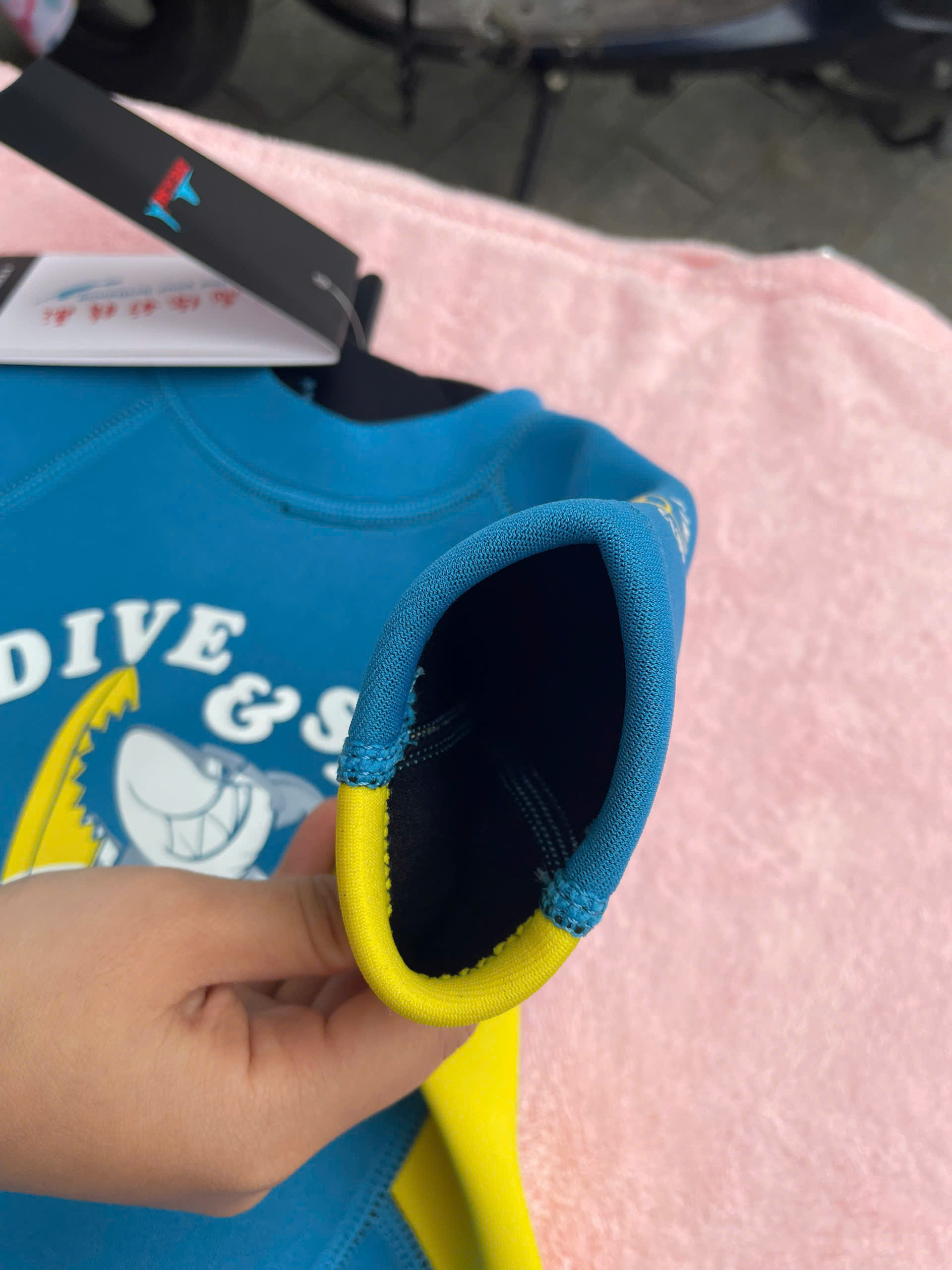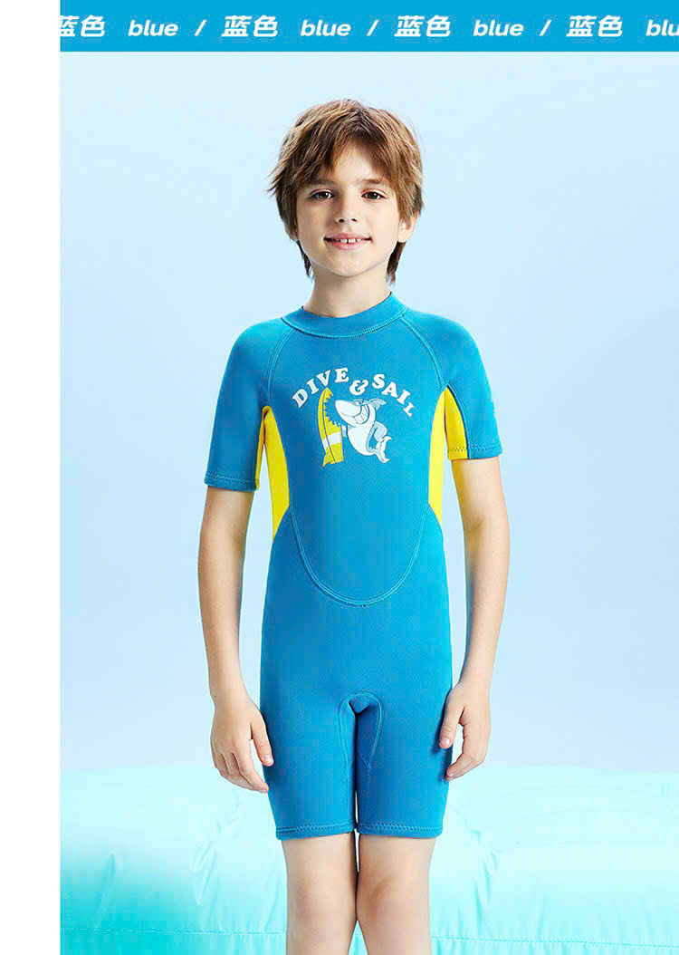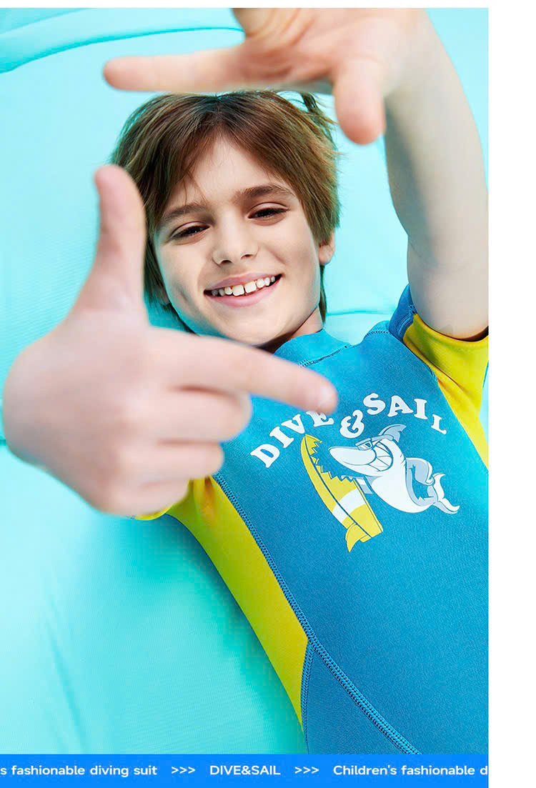 Bộ bơi giữ nhiệt vải dày 2.5mm, màu xanh hình cá, cộc tay liền, Dive & Sail