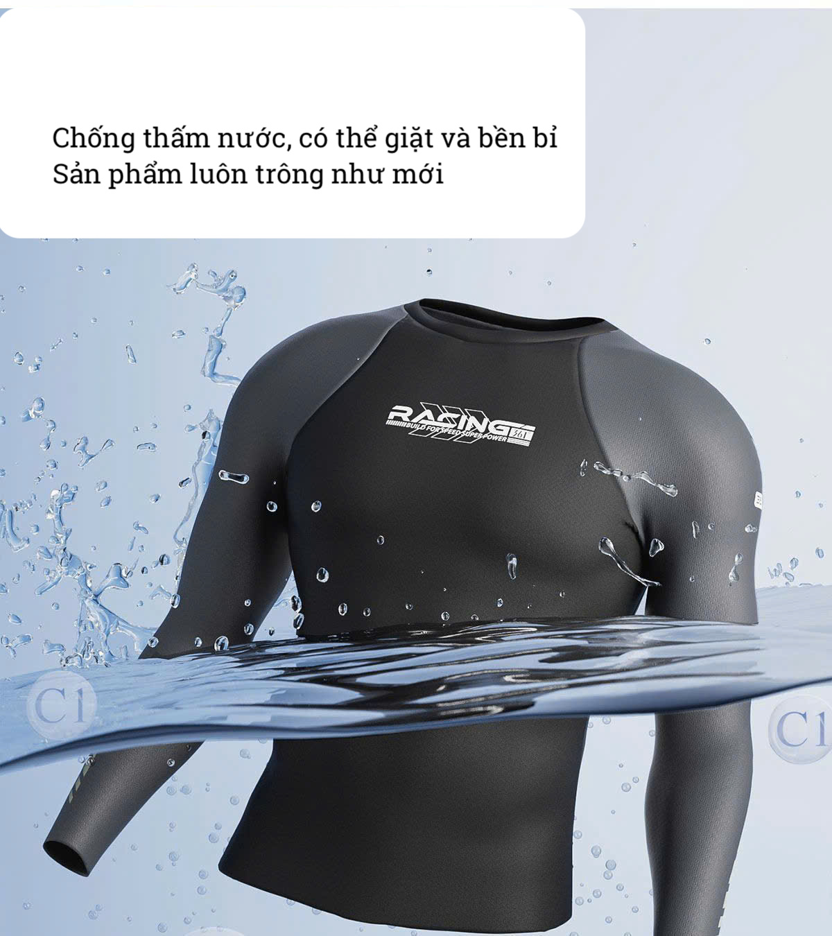 Bộ bơi nam 361, dài tay chống nắng UPF 50+, kháng Clo, Racing, màu đen