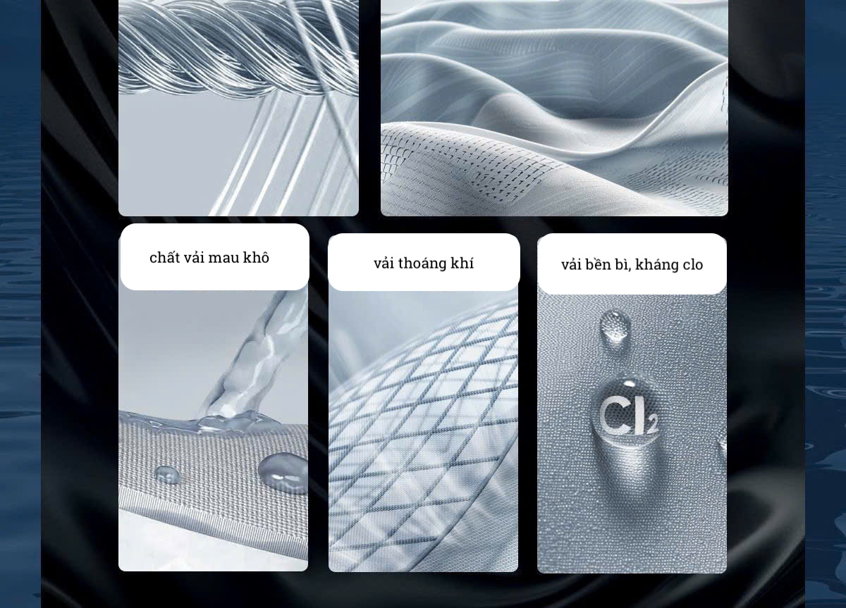 + Vải đồ bơi cao cấp Lycra (82% Nynol 18% Spandex), mềm mại, co giãn 4 chiều