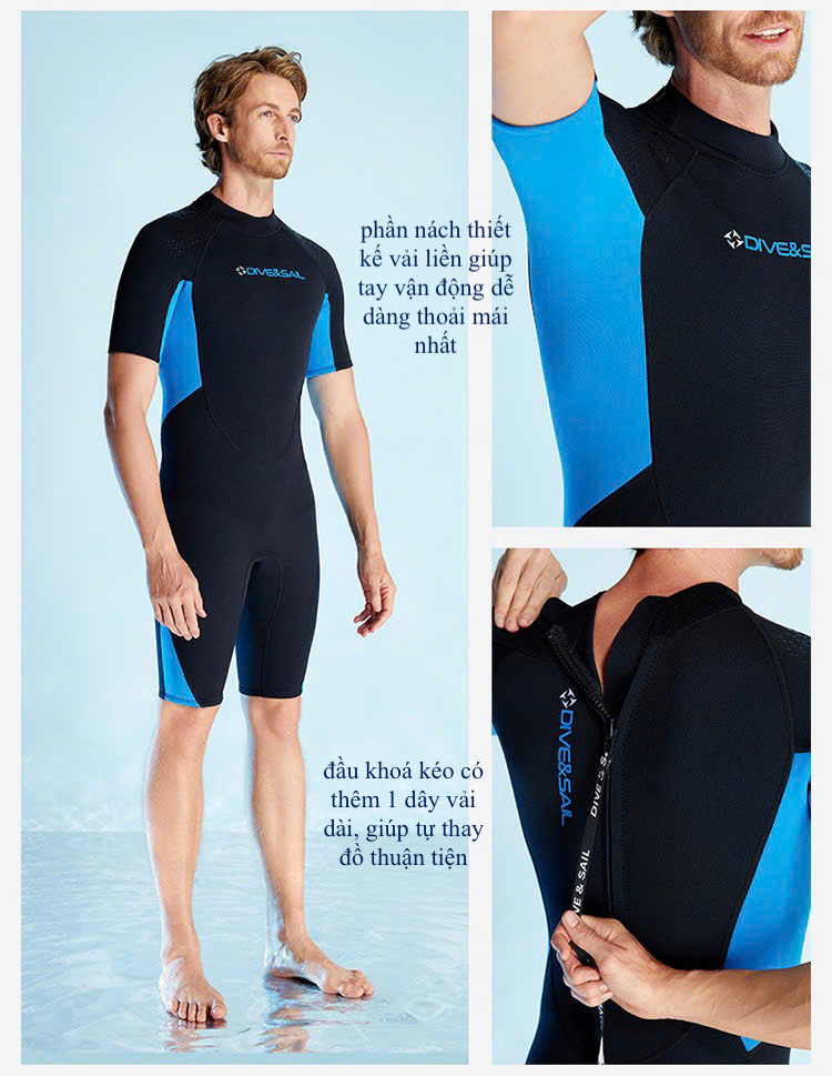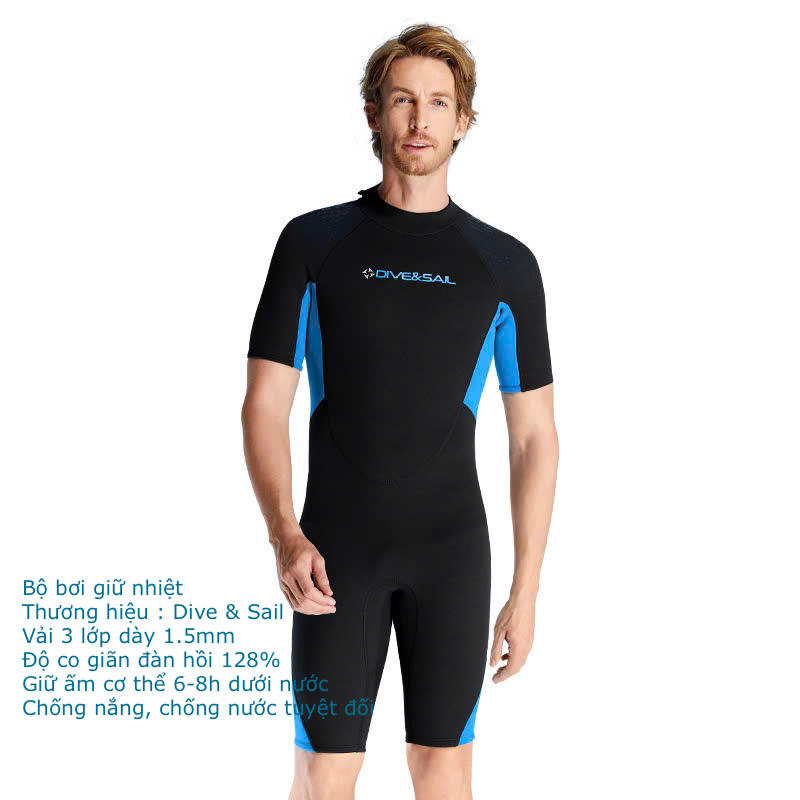 Bộ bơi giữ nhiệt nam, cộc tay, màu đen, vải dày 2.0mm, Dive Sail