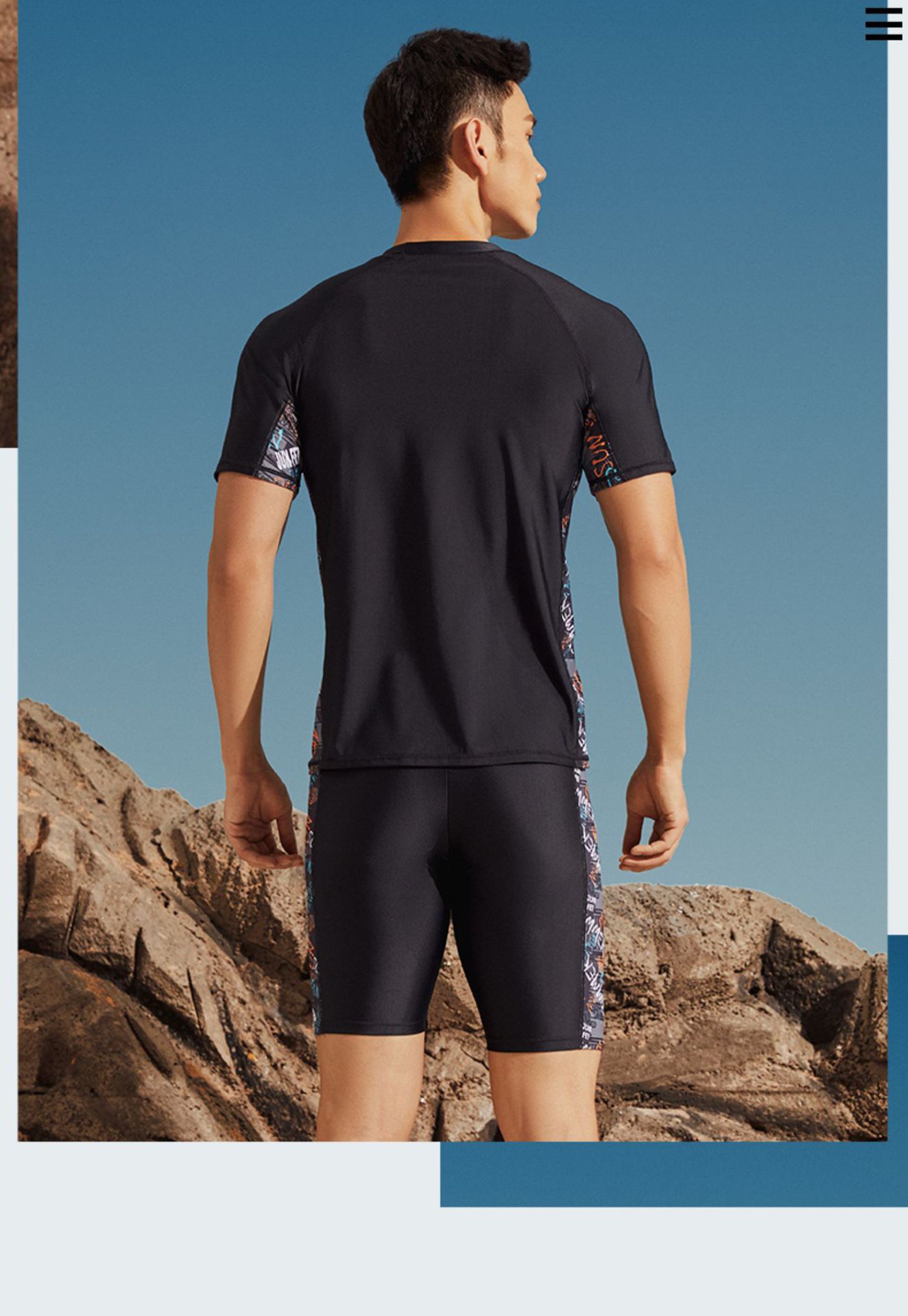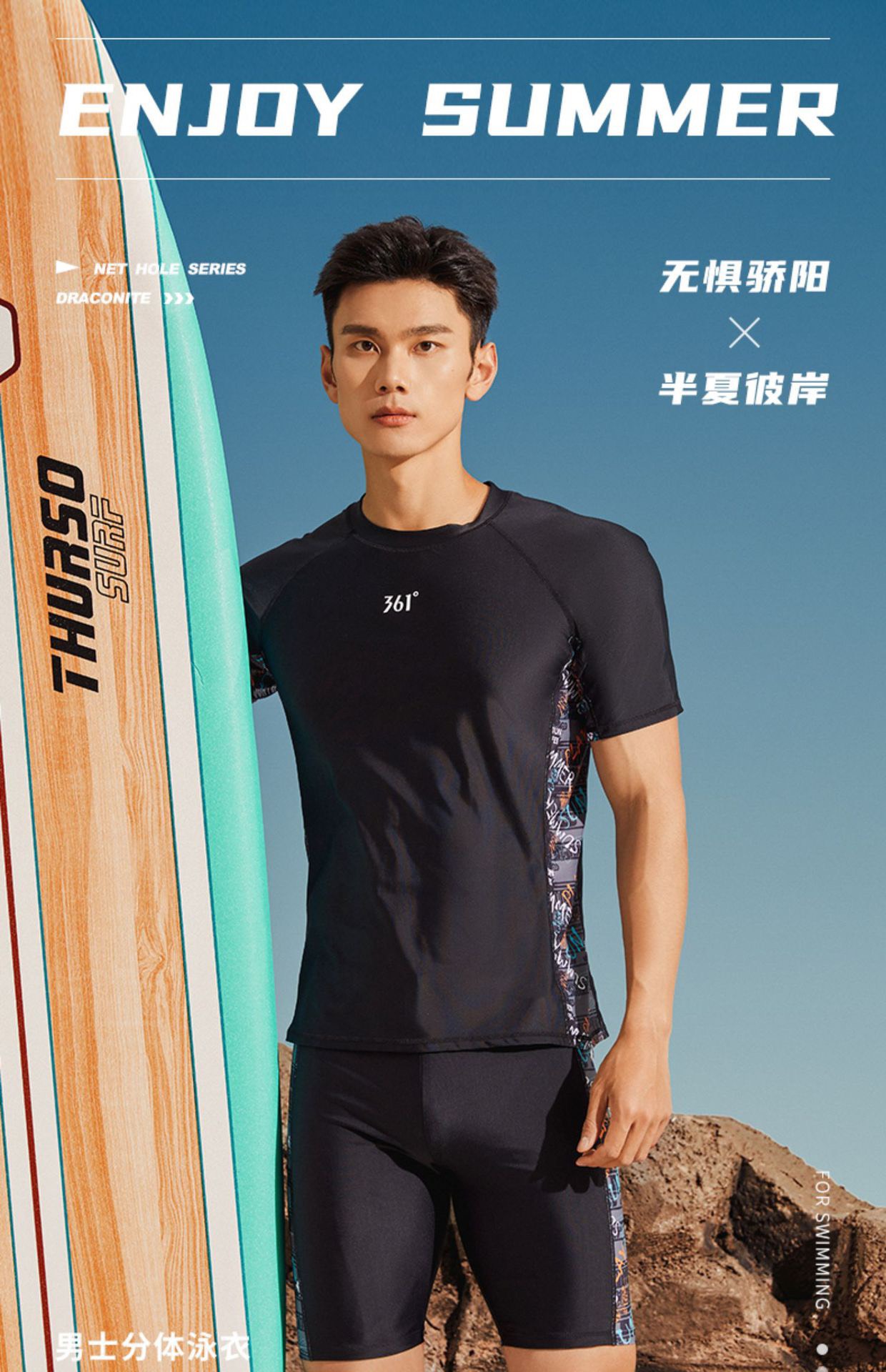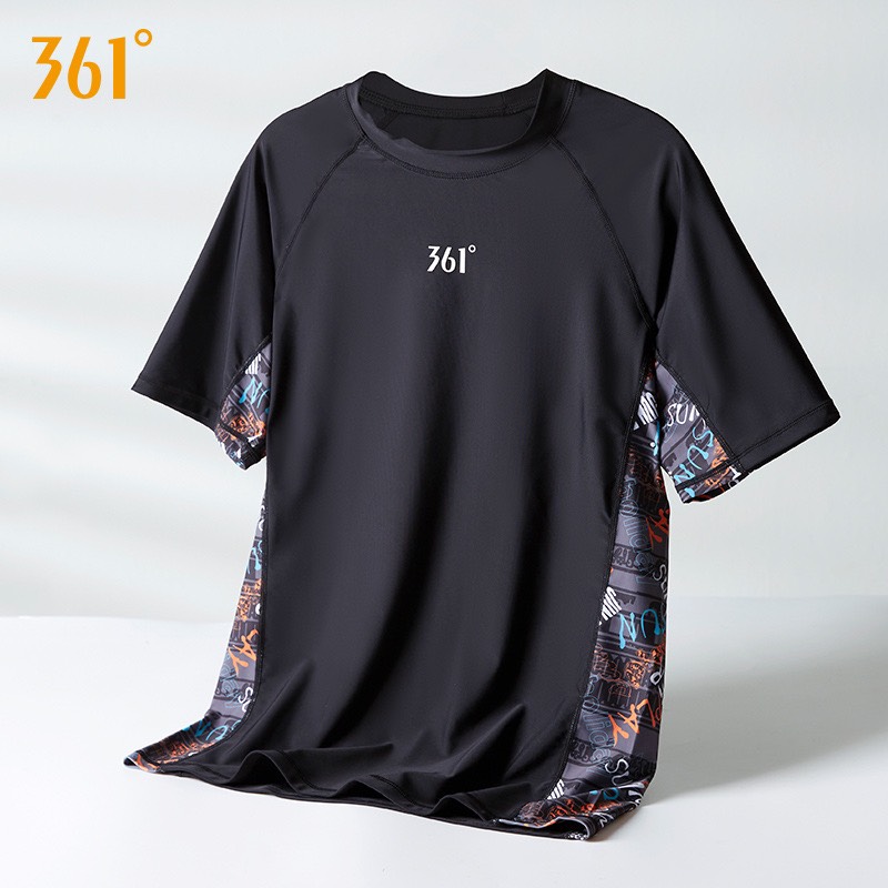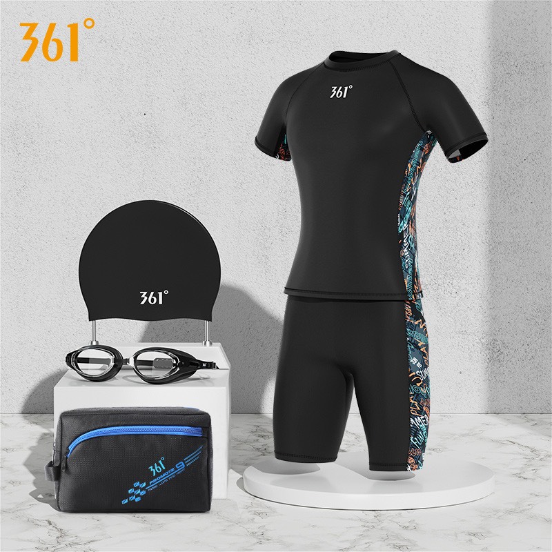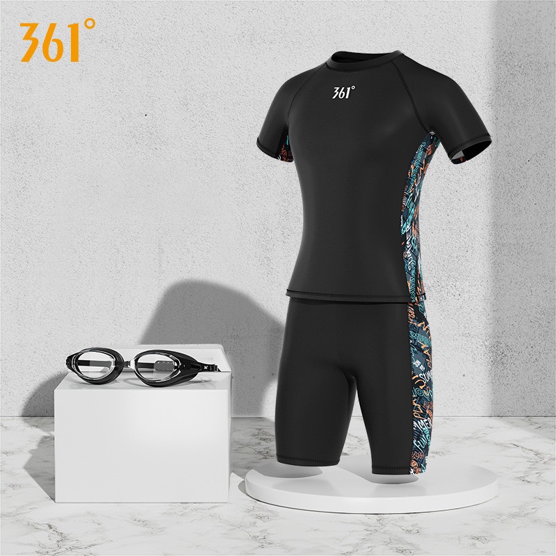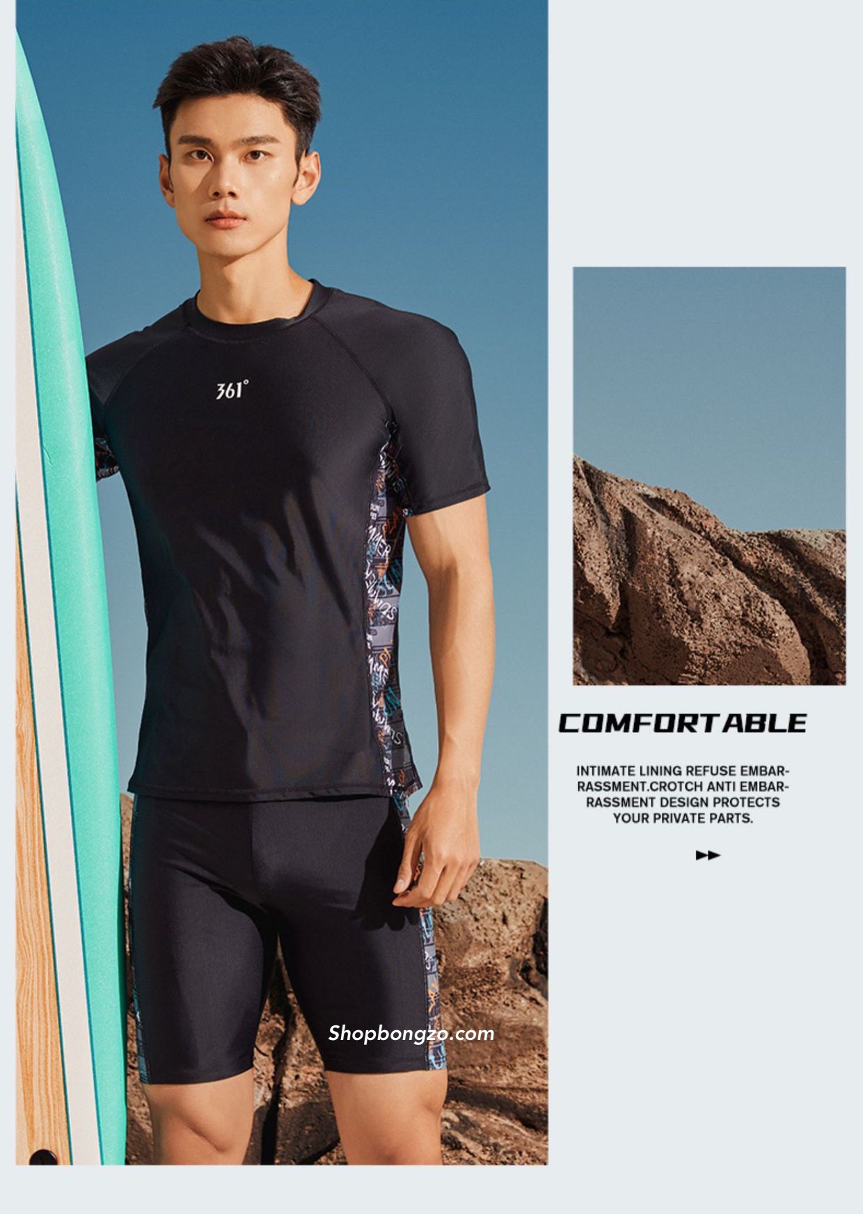 Bộ bơi nam cộc tay, màu đen, hông hoạ tiết, hãng 361, vải chống nắng