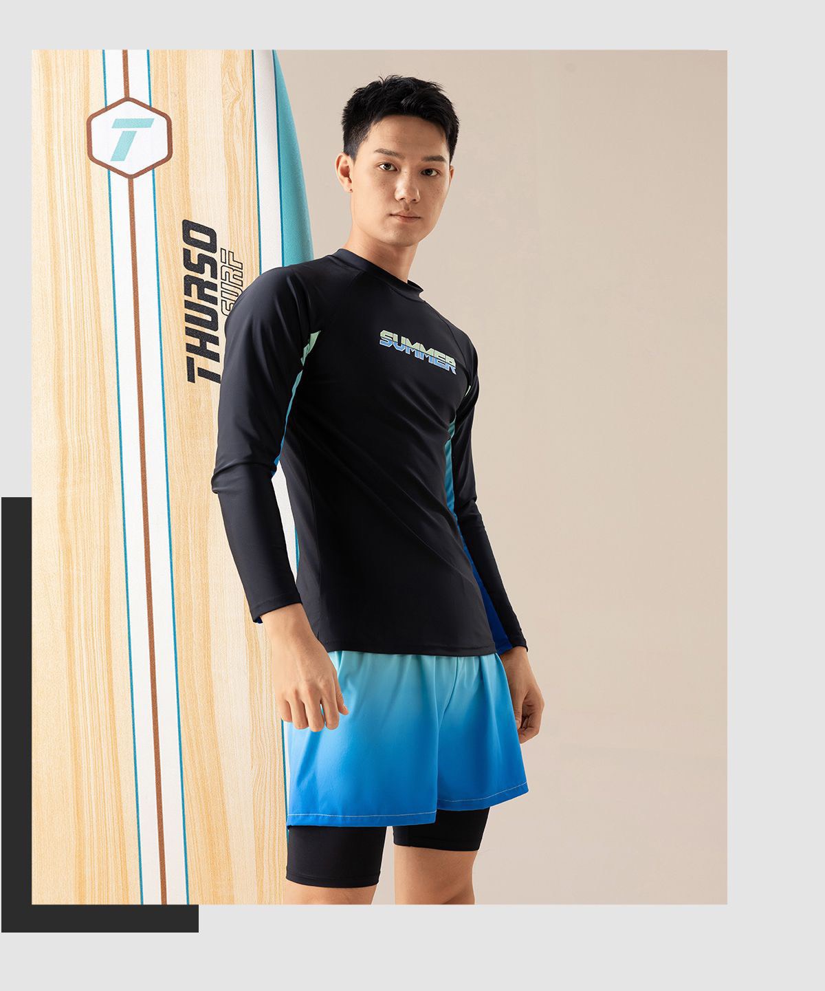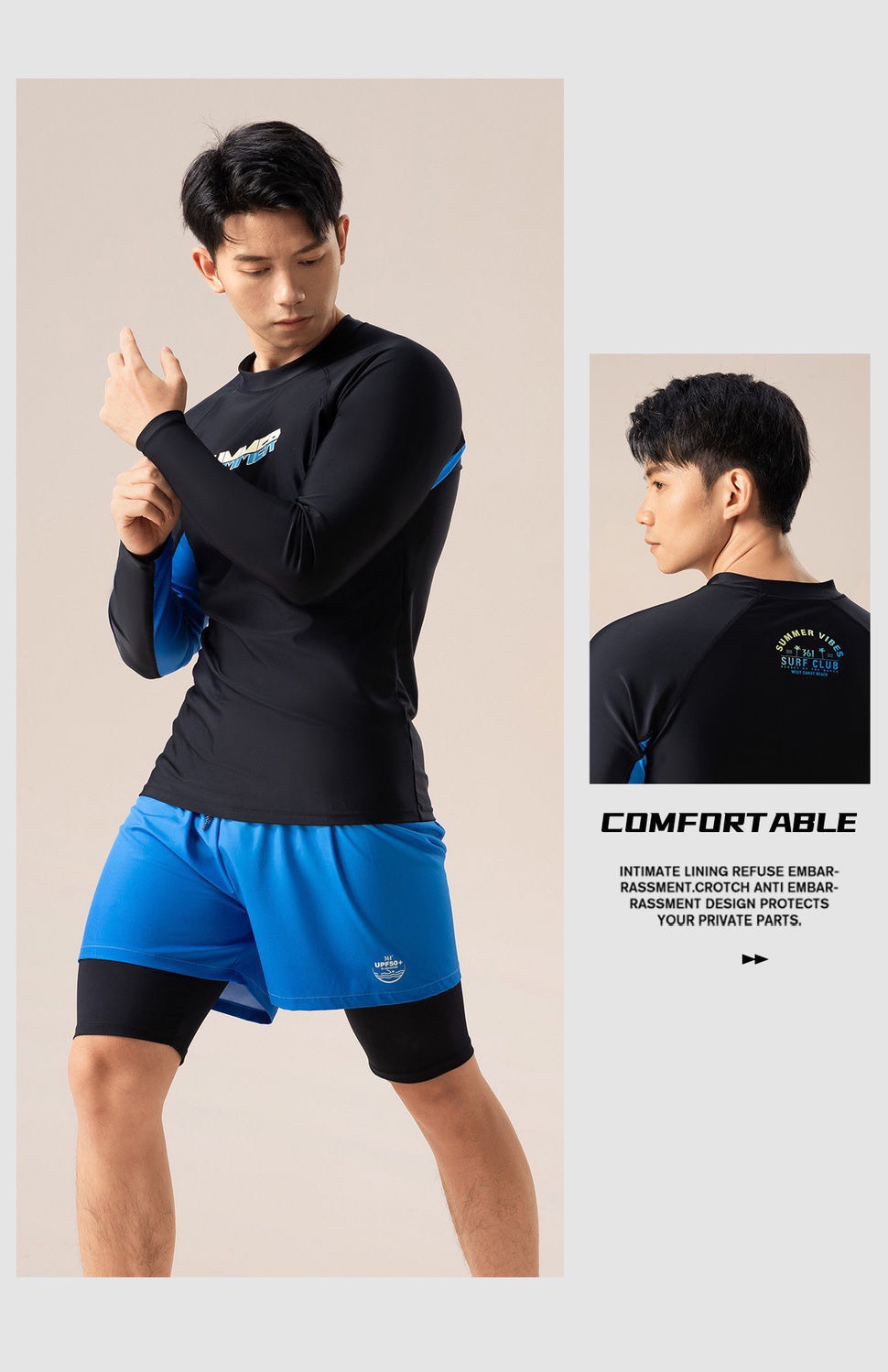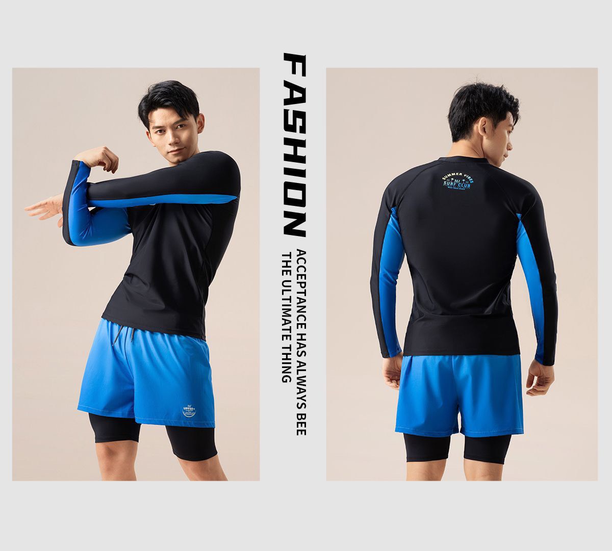 Bộ bơi nam dài tay, vải chống nắng UPF 50+, kháng Clo, màu xanh tay trắng, Momasong