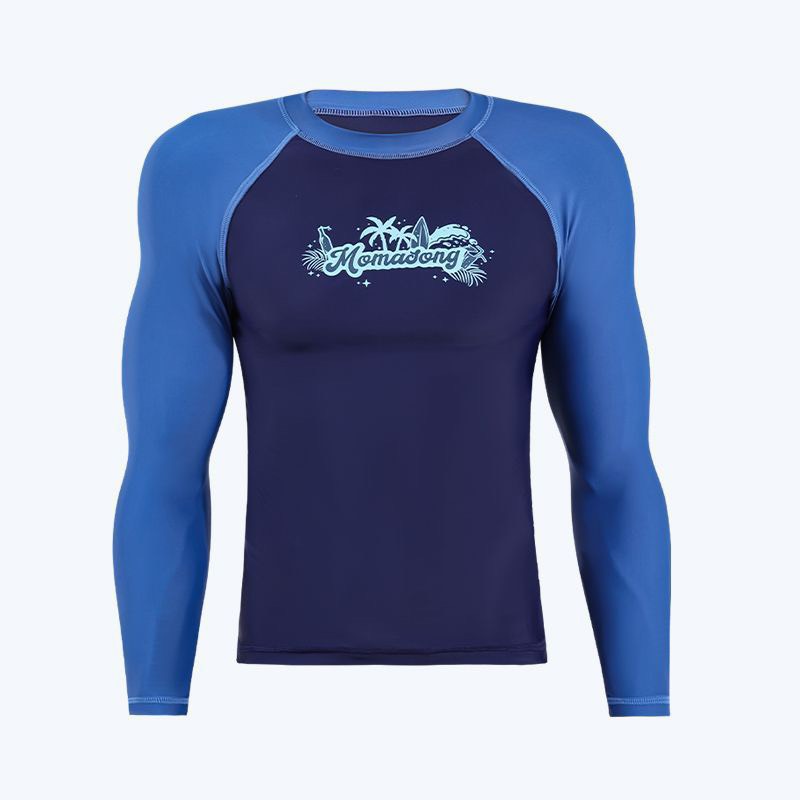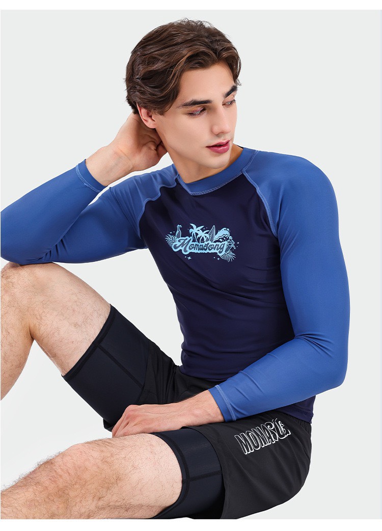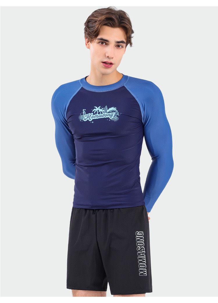 Bộ bơi nam dài tay, vải chống nắng UPF 50+, kháng Clo, màu xanh tay trắng, Momasong