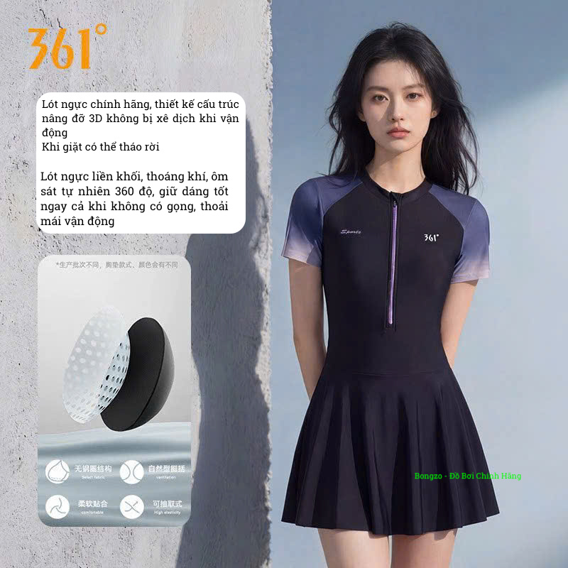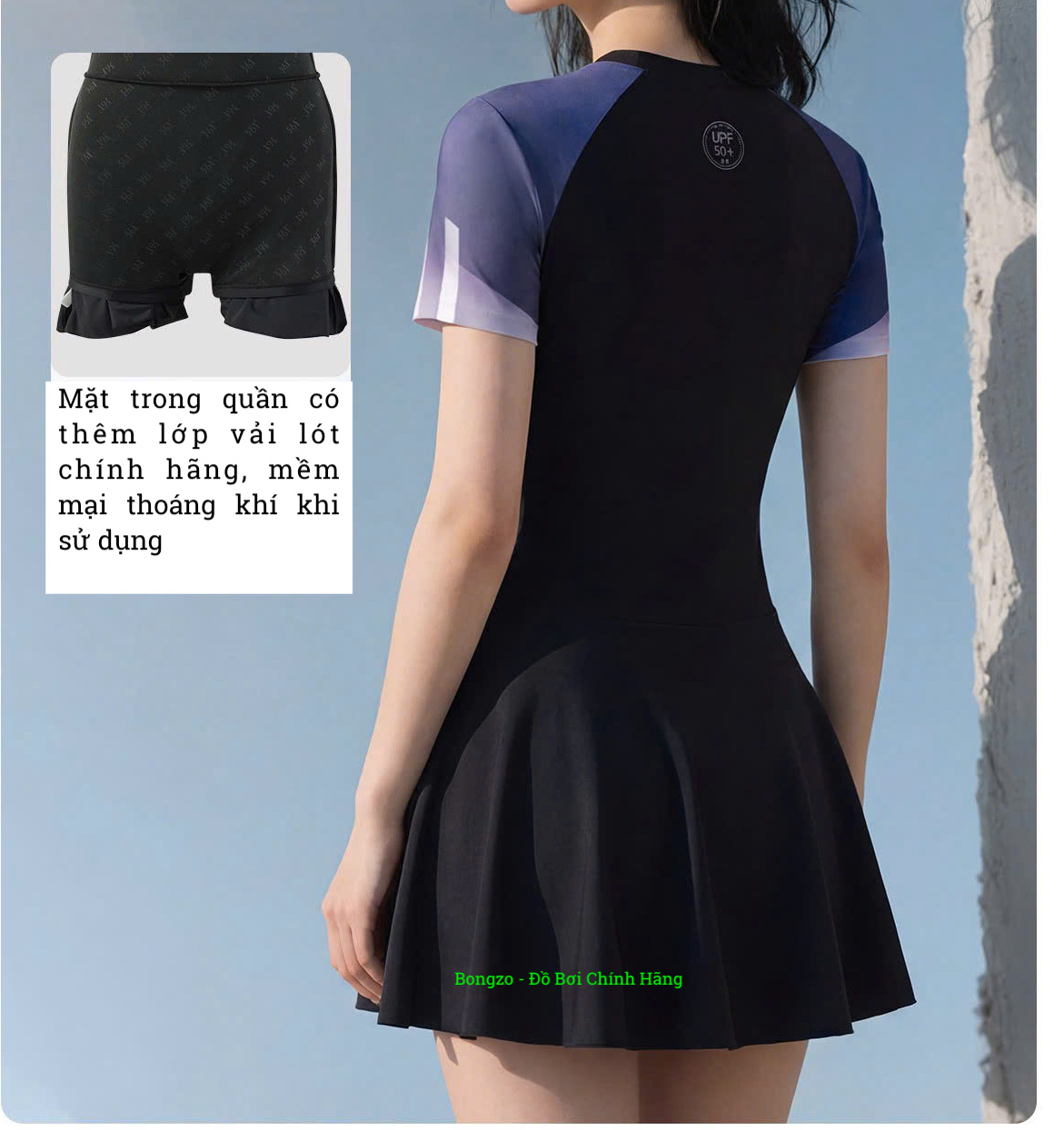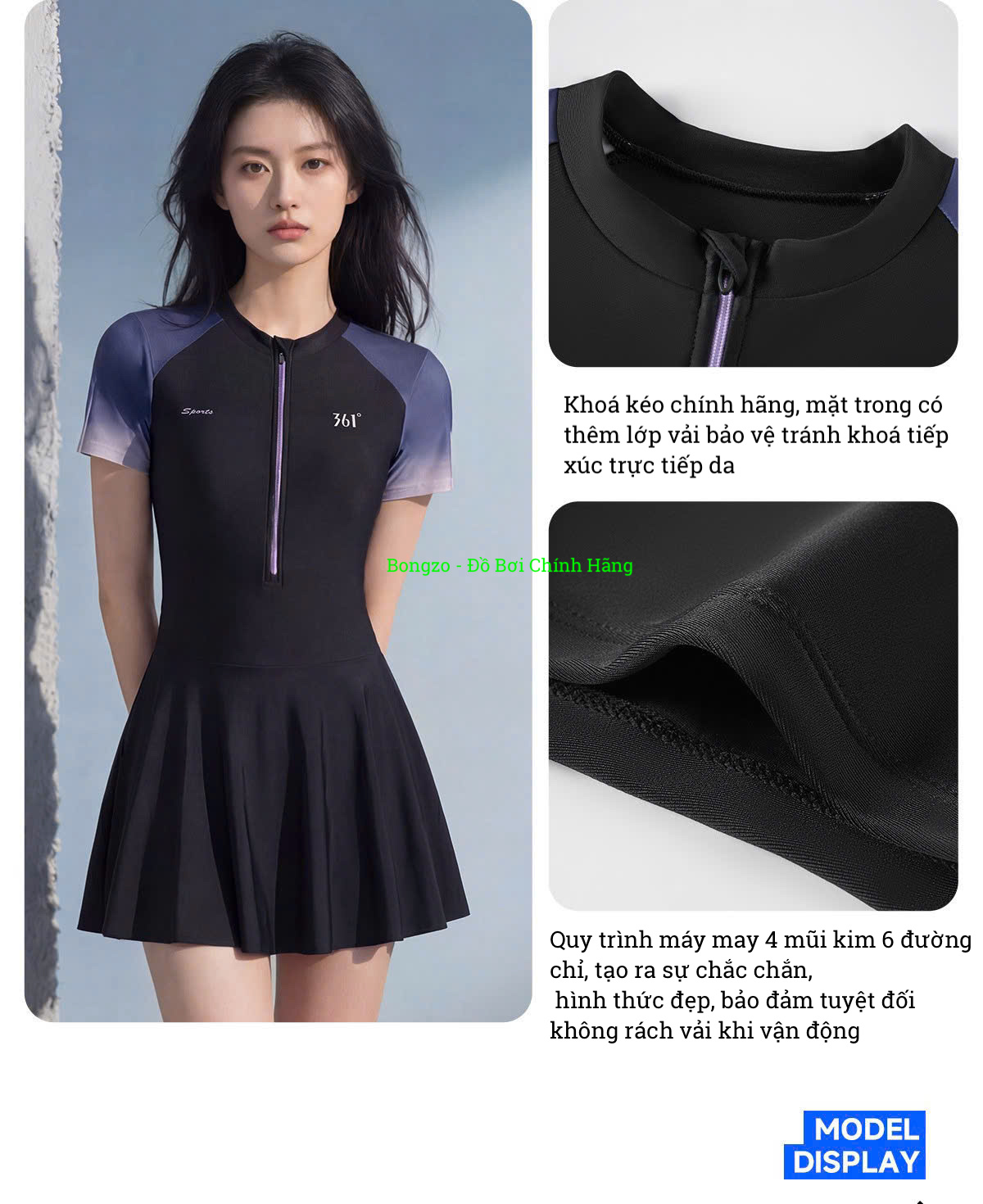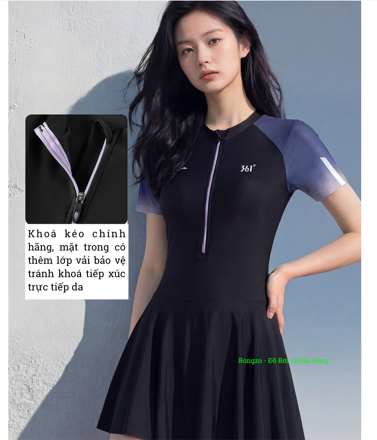 Bộ bơi nữ 361 cộc tay liền thân chân váy, dáng thon gọn che bụng, thoáng khí, co giãn