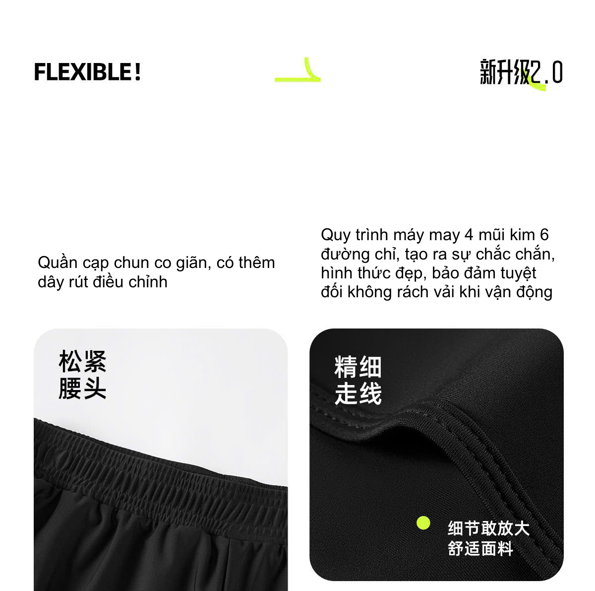 + Quy trình máy may 4 mũi kim 6 đường chỉ, tạo ra sự chắc chắn, hình thức đẹp, bảo đảm tuyệt đối không rách vải khi vận động