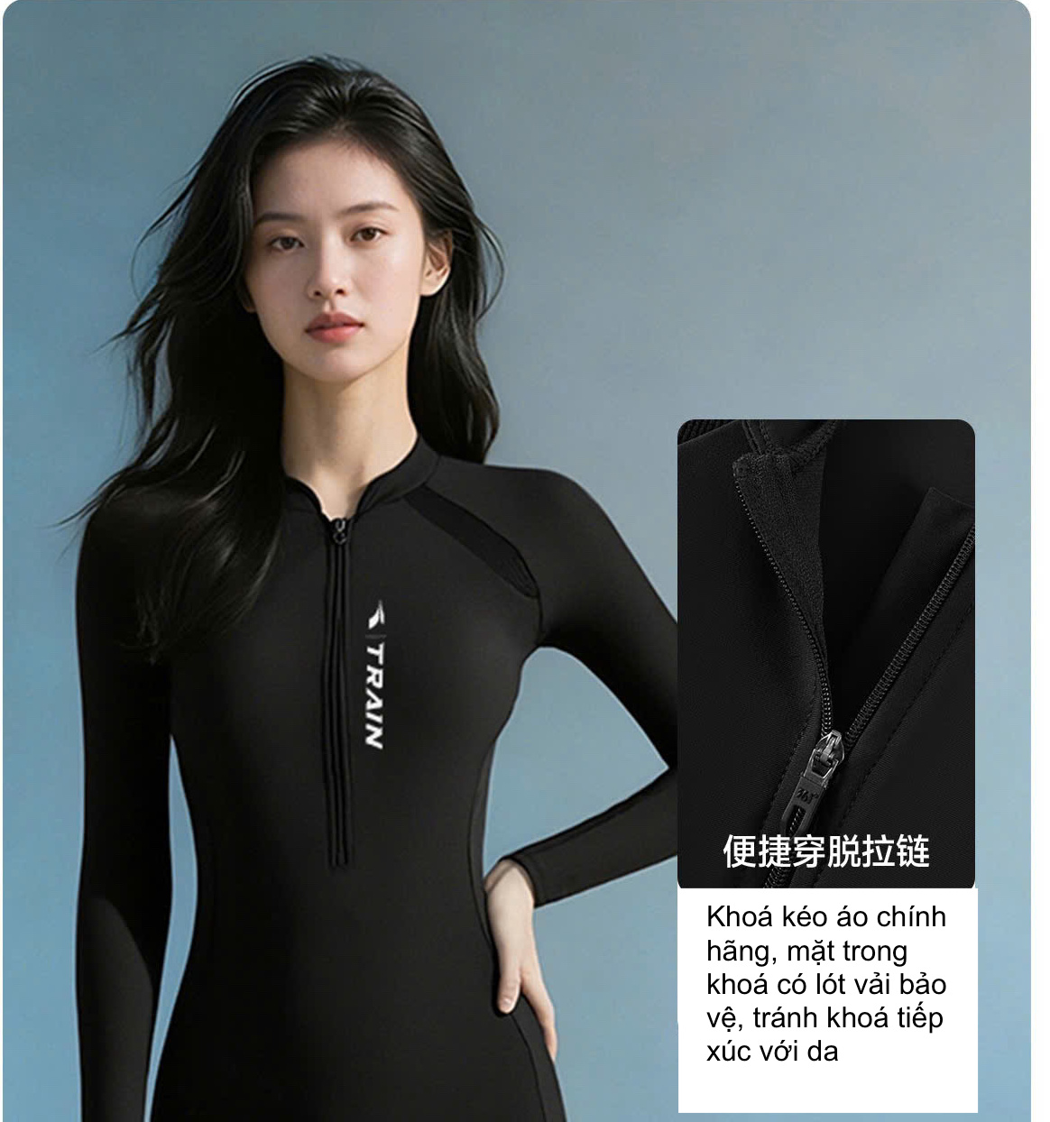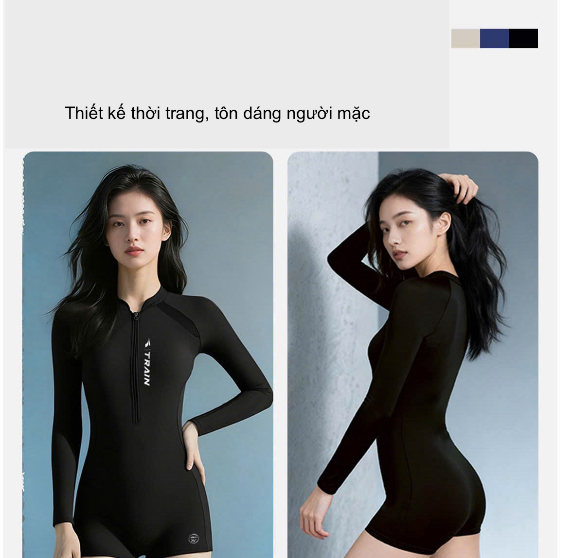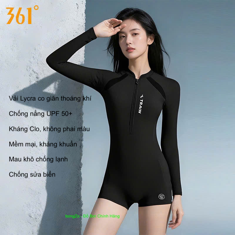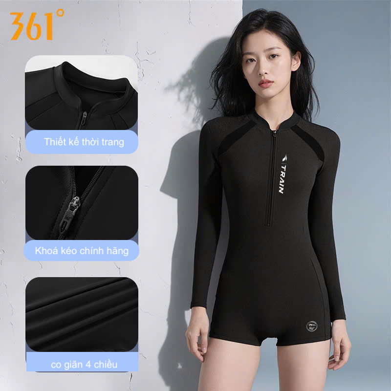 Bộ bơi nữ 361 dài tay liền thân, màu đen tôn dáng, chống nắng UPF 50+, co giãn thoáng khí