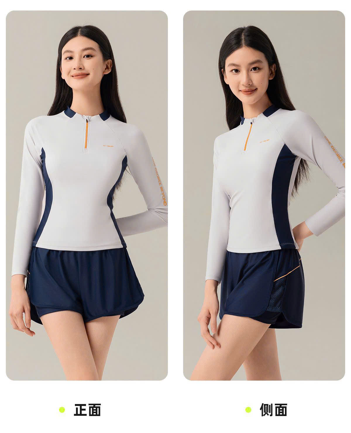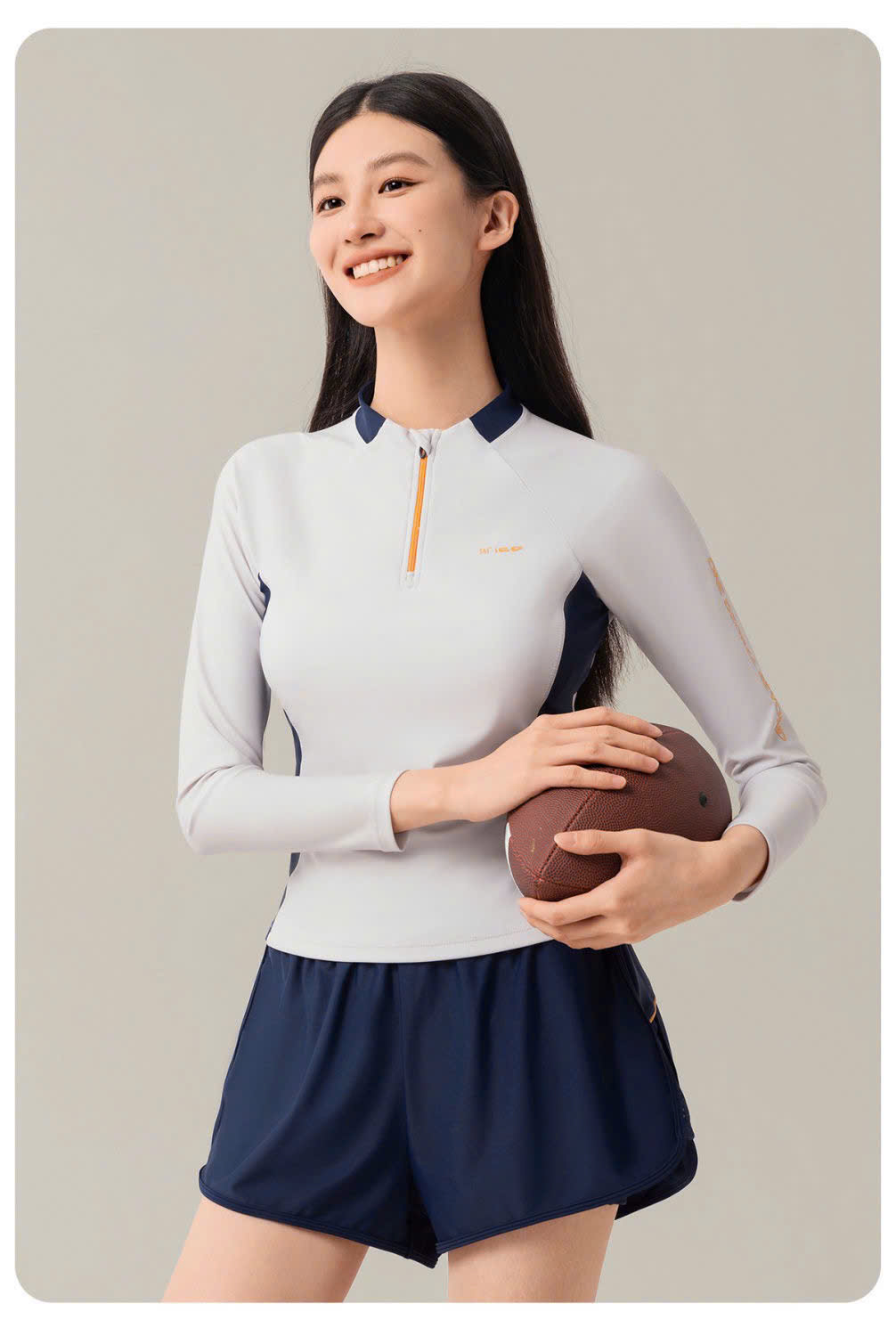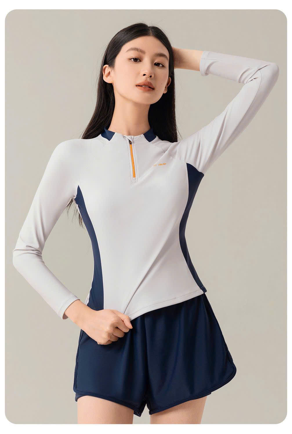 Bộ bơi nữ chống nắng, dài tay màu xám, tay xanh, vải kháng Clo, UPF 50+, 361