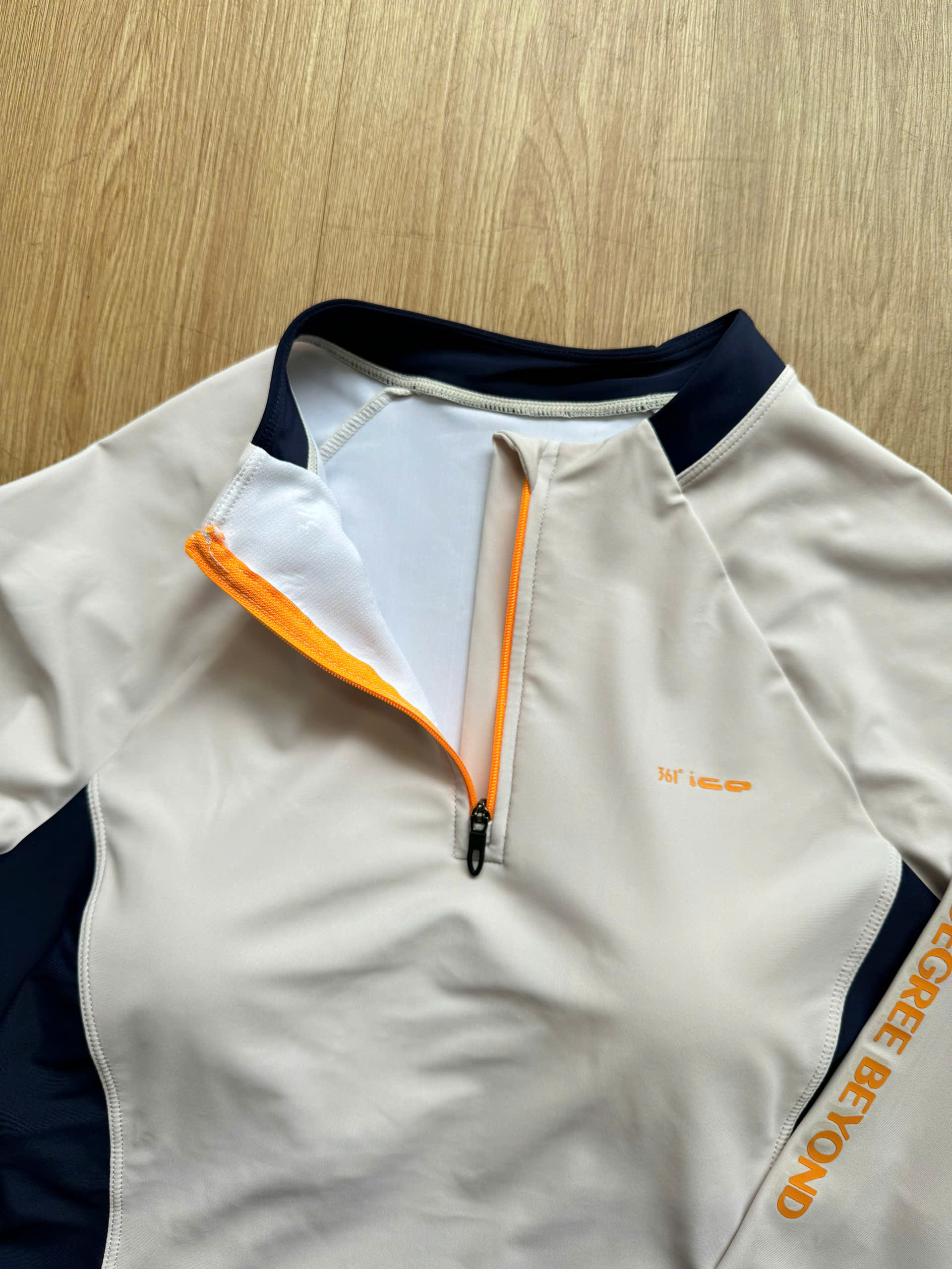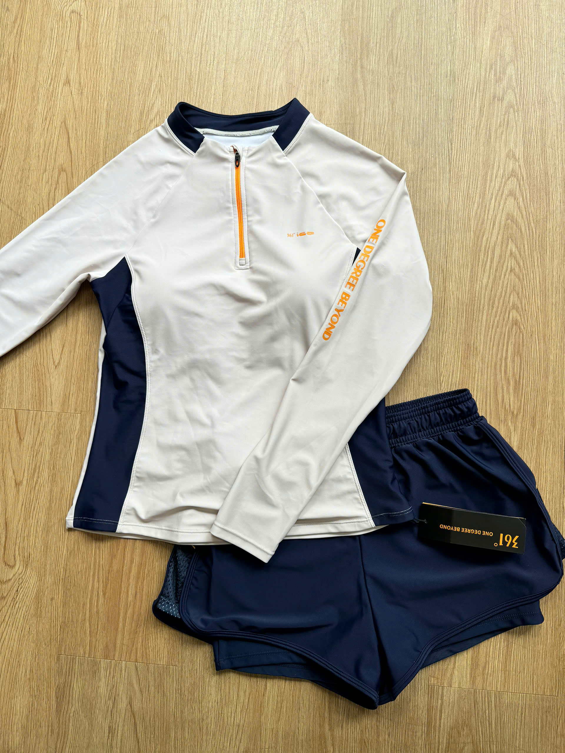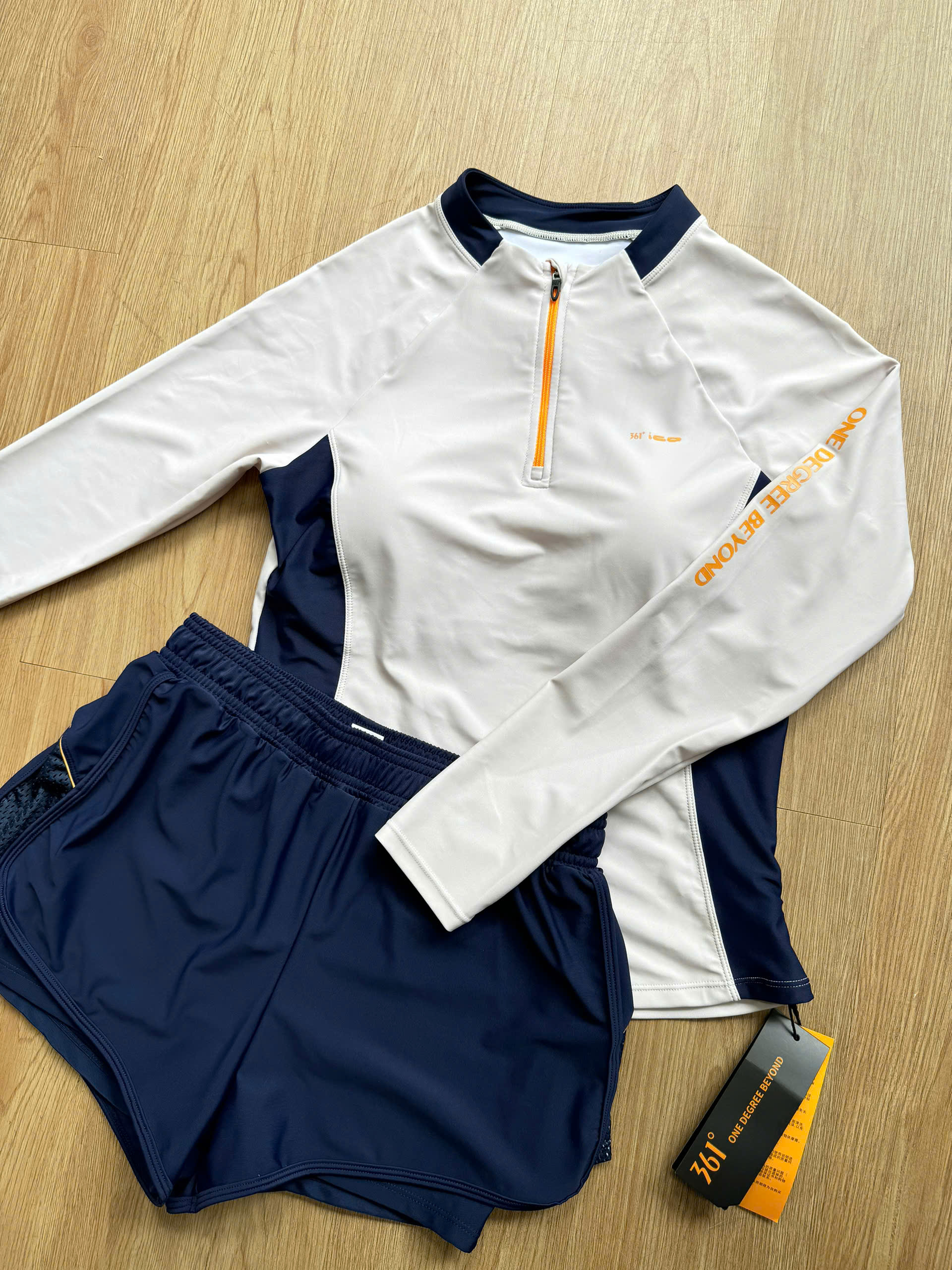 Bộ bơi nữ chống nắng, dài tay màu xám, tay xanh, vải kháng Clo, UPF 50+, 361