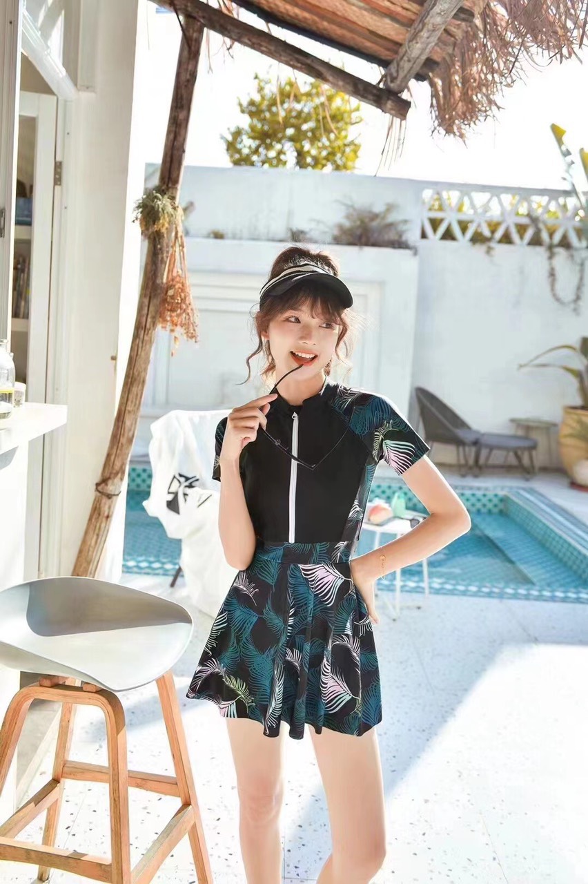 Bộ bơi nữ cộc đen, liền chân váy xanh lá