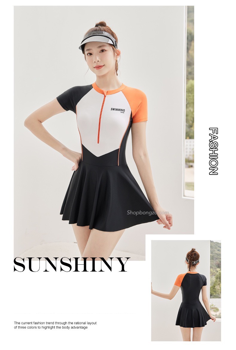 - Kiểu dáng : dán liền, áo cộc liền chân váy, bên trong liền quần. Áo có lót ngực bên trong, có thể dễ dàng tháo rời khi giặt bộ bơi.