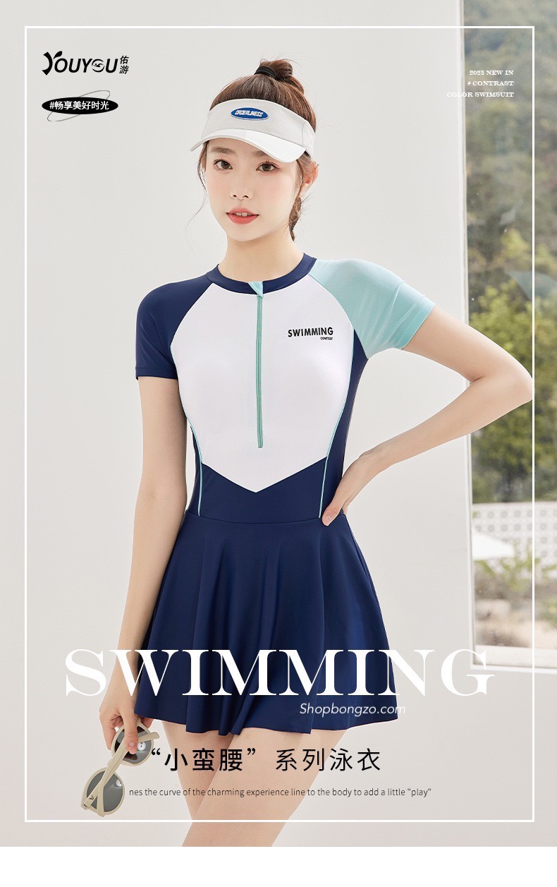 Bộ bơi nữ cộc liền chân váy, trắng xanh YouYou