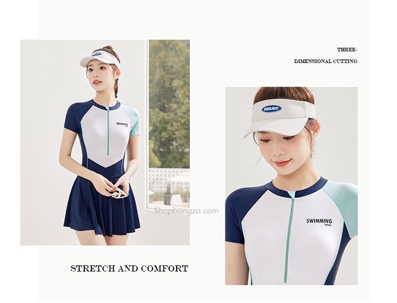 - Kiểu dáng : dán liền, áo cộc liền chân váy, bên trong liền quần. Áo có lót ngực bên trong, có thể dễ dàng tháo rời khi giặt bộ bơi.