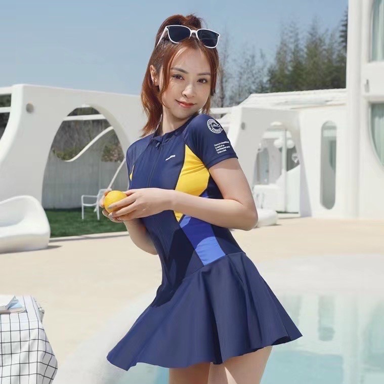 Bộ bơi nữ cộc liền chân váy xanh than, hông vàng