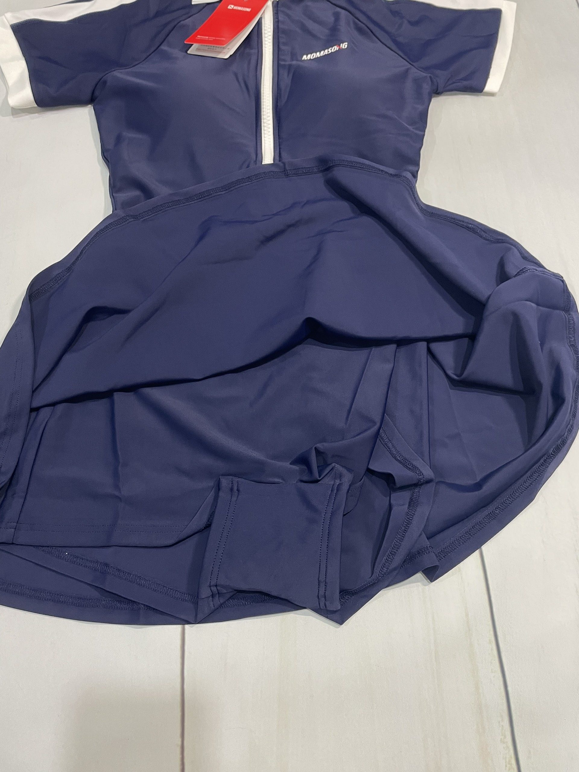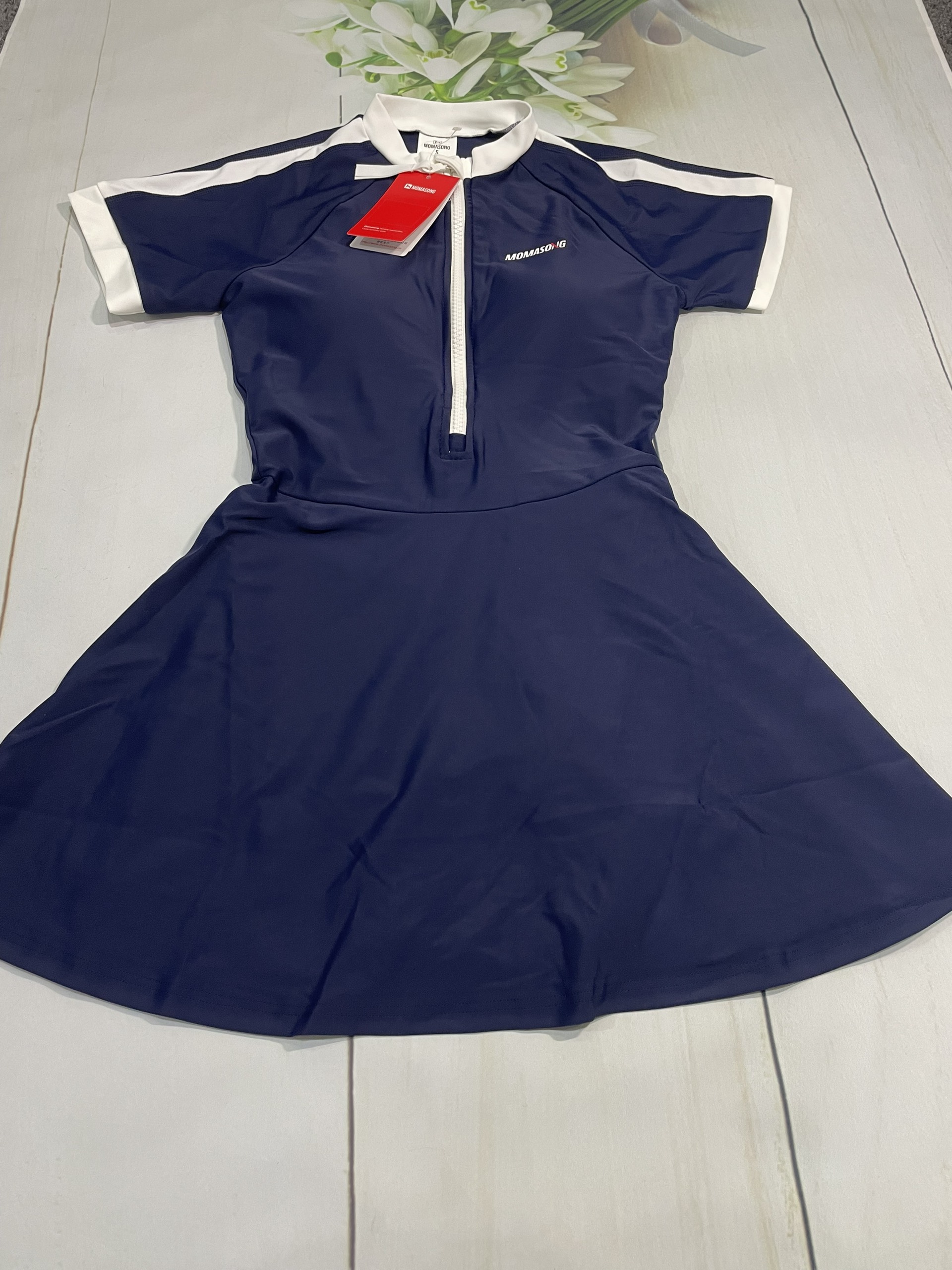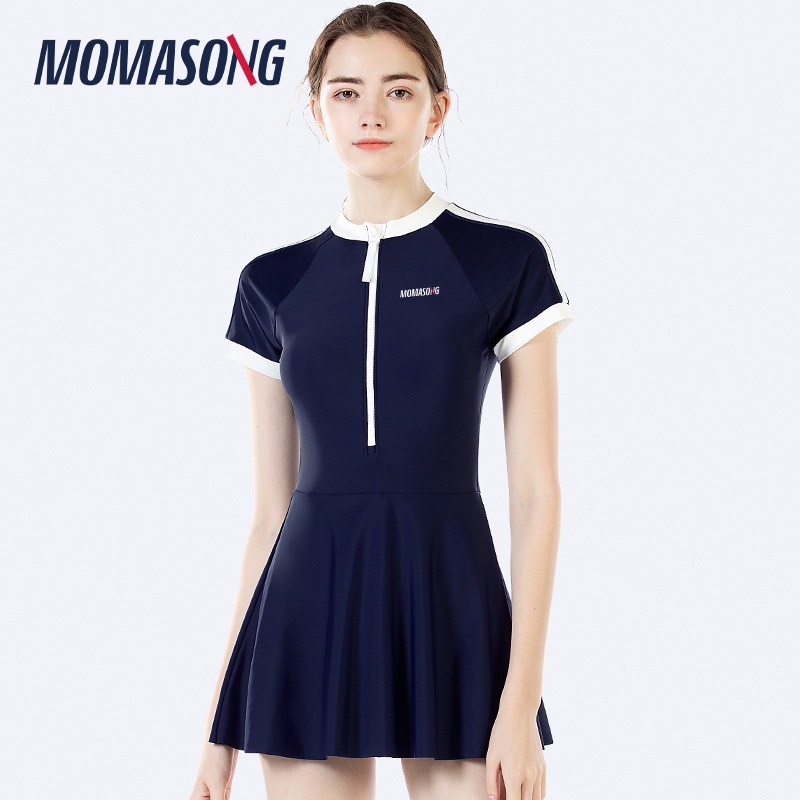 Bộ bơi nữ cộc tay liền chân váy, màu xanh than, chống nắng, Momasong