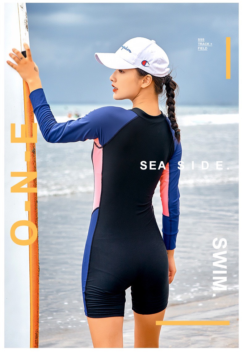 Bộ bơi nữ đen liền dài tay, quần lửng, hông hồng, 361