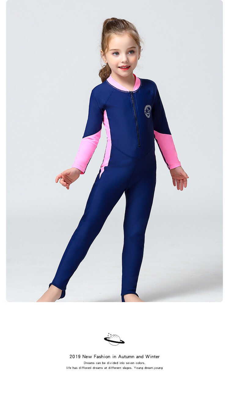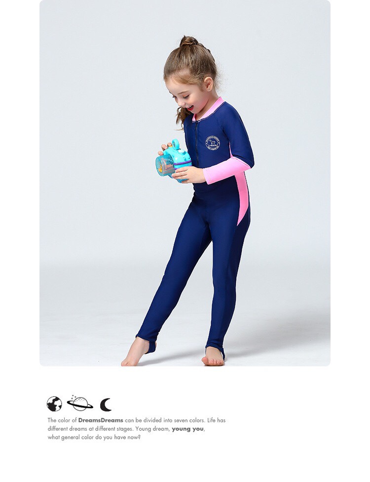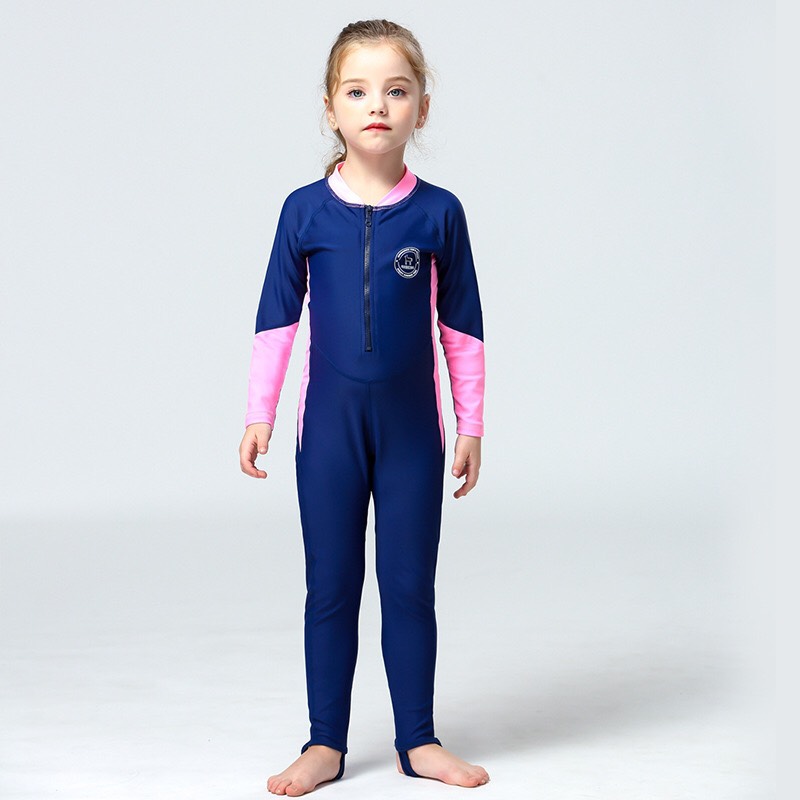 Bộ bơi bé gái, vải chống nắng UPF 50+, kháng Clo, dáng dài liền, màu than tay trắng, Dive&Sail