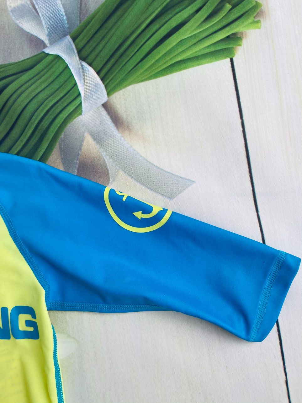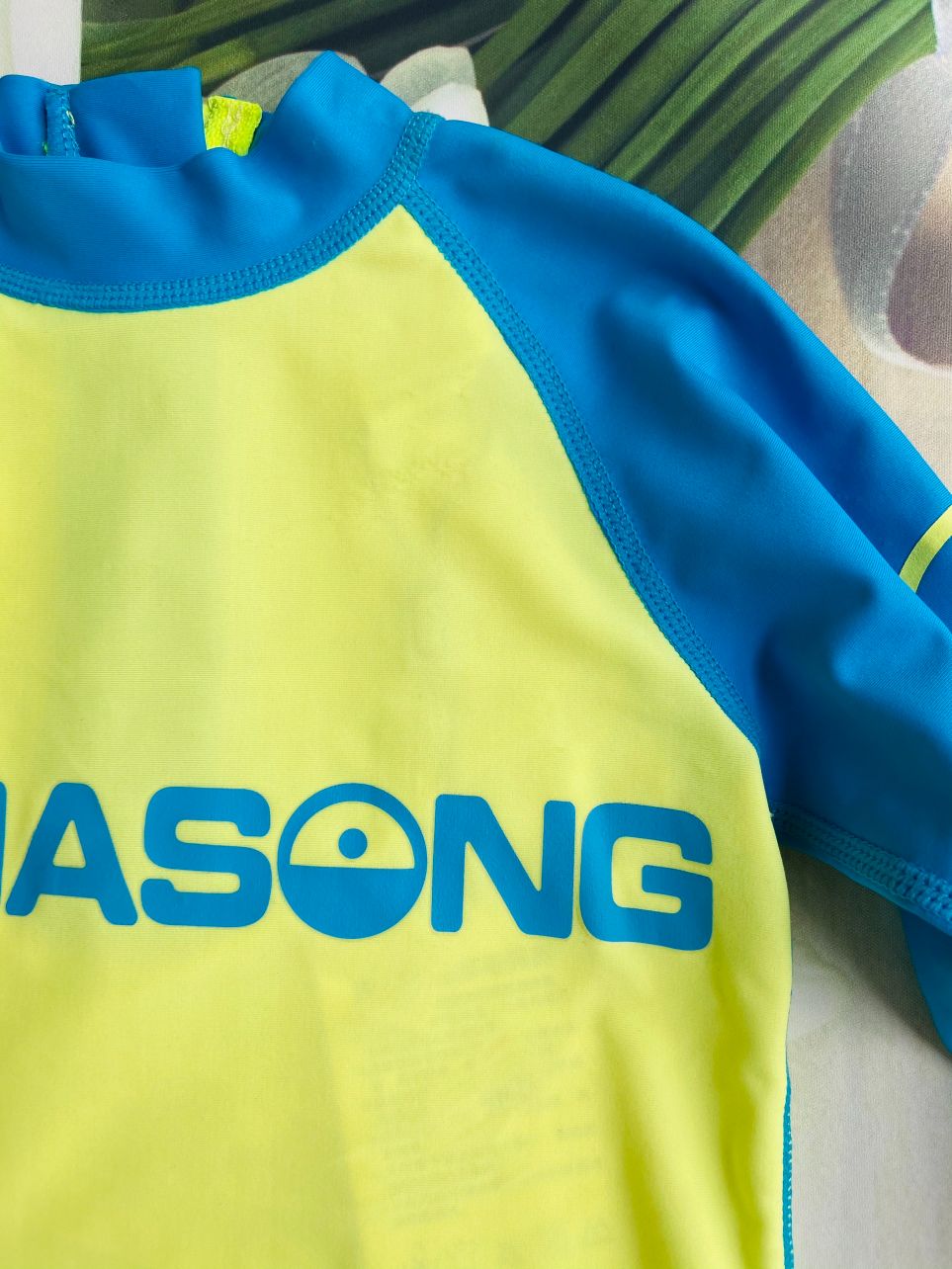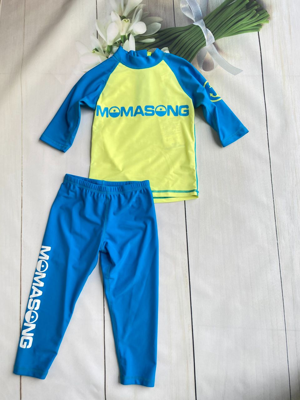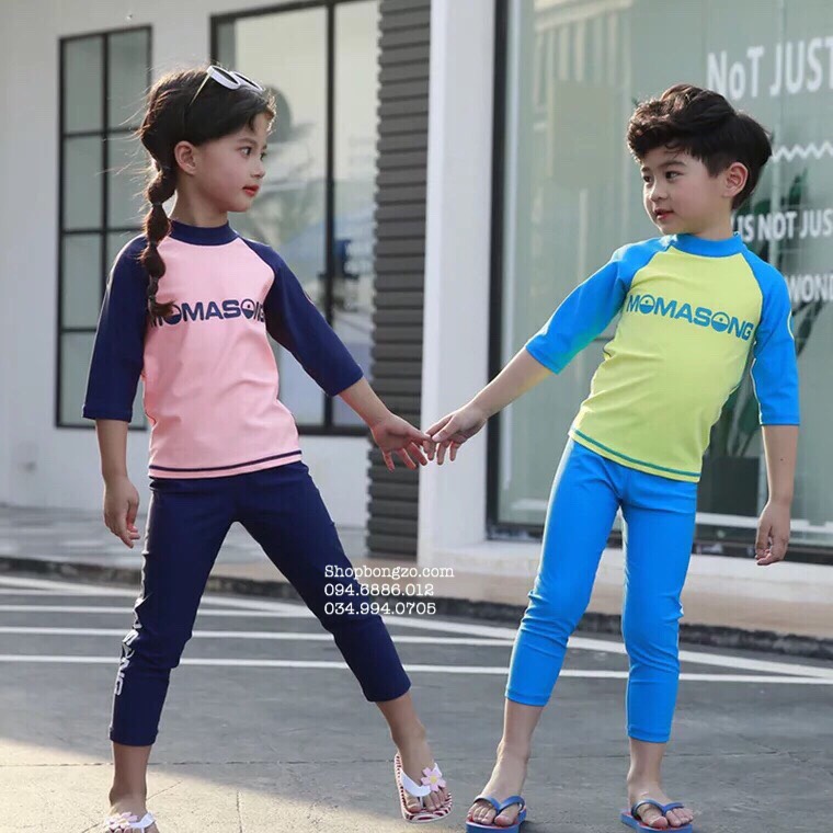 Bộ bơi dài vàng, tay xanh, quần dài xanh, Momasong