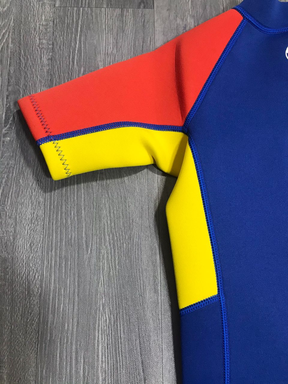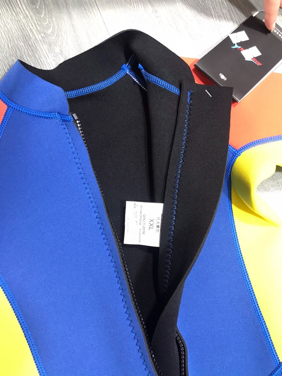 Chất liệu vải gồm 3 tầng : lớp ngoài cùng vải nylon đàn hồi, lớp giữa là neoprene 2mm, lớp trong bằng vải nylon đàn hồi màu đen.