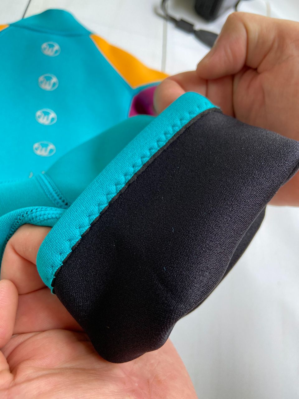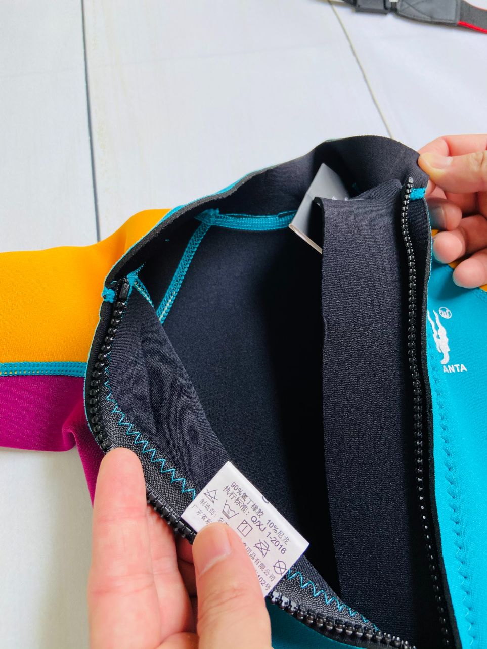 - Chất liệu vải gồm 3 tầng : lớp ngoài cùng vải nylon đàn hồi, lớp giữa là neoprene 2mm, lớp trong bằng vải nylon đàn hồi màu đen