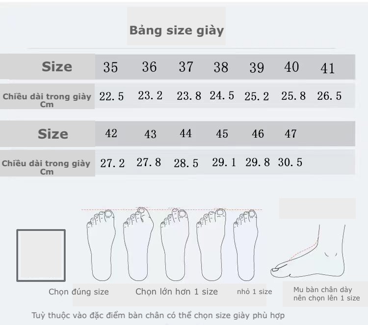 - Lưu ý : giày được làm bằng chất liệu vải tổng hợp mềm co giãn, cổ giày cao ôm sát cổ chân. Nên có thể chọn size giày thoải mái chút vẫn đảm bảo mang giày không bị tuột khi di chuyển và vận động.