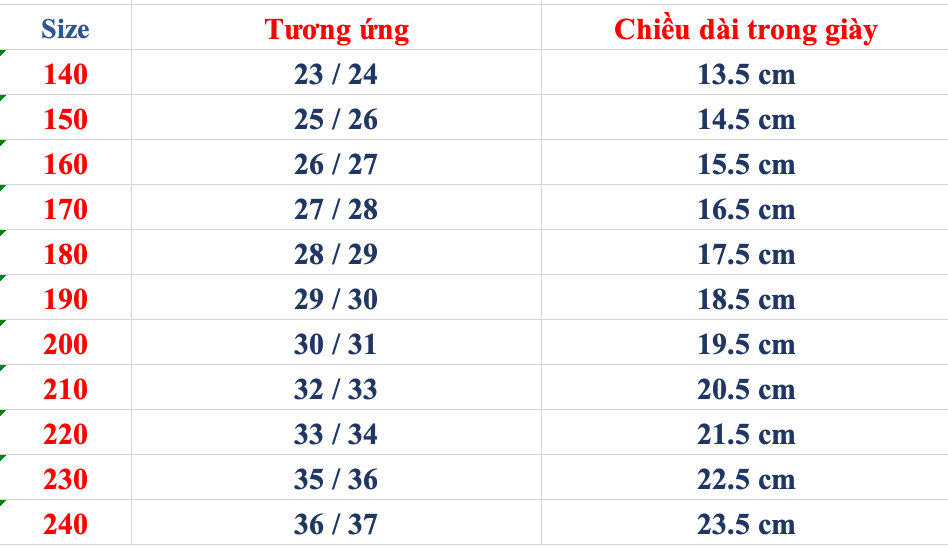 Cách chọn size : Chiều dài chân + 0.5~1.0 cm = Chiều dài bên trong giày