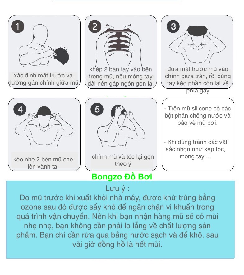 Mũ bơi cho bé - Tác dụng : Giữ tóc cố định. Bảo vệ tóc, tránh tóc tiếp xúc trực tiếp với nước bể bơi. - Chất liệu : Silicone cao cấp, an toàn, chống nước, co giãn 4 chiều, tạo cảm giác thoải mái cho người dùng. - Thiết kế : mặt trong có thiết kế đường gân giúp tăng độ giữ tóc, tránh tuột mũ khi bơi. Độ dày của mũ lớn đảm bảo độ bền bỉ cho người dùng. Kích cỡ mũ : 22.8 *19cm Vòng đầu 45 - 49cm : đội hơi rộng Vòng đầu 49-55cm : vừa Vòng đầu 55cm trở lên : đội chật Phù hợp : trẻ em 5 - 12 tuổi. Cách dùng : Lồng 2 bàn tay vào mặt trong mũ. Lưu ý cụm đầu ngón tay tránh móng tay làm rách mũ. Đầu tiên xác định mặt trước mũ, đội từ trán ra phía sau gáy. Rồi chỉnh mũ cân đối. Sao cho đỉnh mũ phải ôm sát đỉnh đầu. Đường viền của mũ phải tiếp xúc với da đầu nhằm hạn chế nước vào tóc. Hướng dẫn sử dụng : Dùng xong chỉ cần tráng mũ qua nước sạch. Bảo quản nơi khô ráo, nhiệt độ phòng. —————————————————— ✔ Hàng luôn có sẵn tại shop ✔ Bán lẻ, buôn(sỉ) 094.6886.012 - 034.994.0705 ✔ Store xem hàng trực tiếp : 25 Nguyễn Chí Thanh-Ba Đình-Hà Nội ✔ Đổi trả hàng trong 5 ngày ✔ Ship COD ( nhận hàng hàng thanh toán) - toàn quốc ✔️ Xem sp : https://shopbongzo.com/100.000₫ -