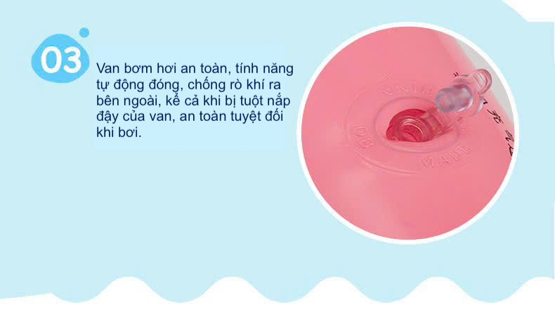 - Van bơm hơi an toàn, tính năng tự động đóng, chống rò khí ra bên ngoài, kể cả khi bị tuột nắp đậy của van, an toàn tuyệt đối khi bơi.