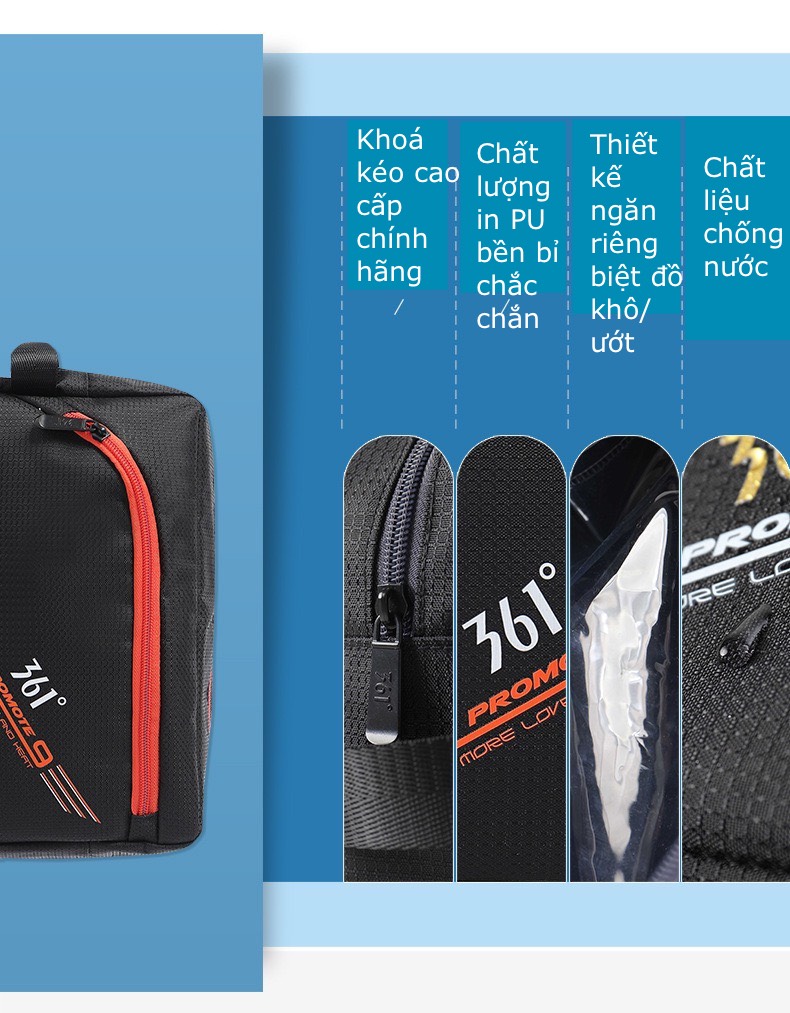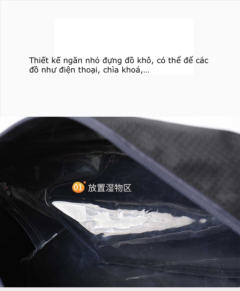 - Ngăn đựng đồ khô và ướt riêng biệt, ngăn nhỏ đựng đồ khô có thể đựng điện thoại, chìa khoá,...