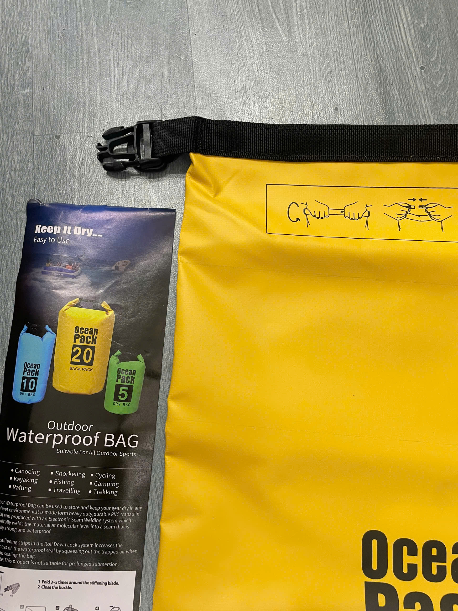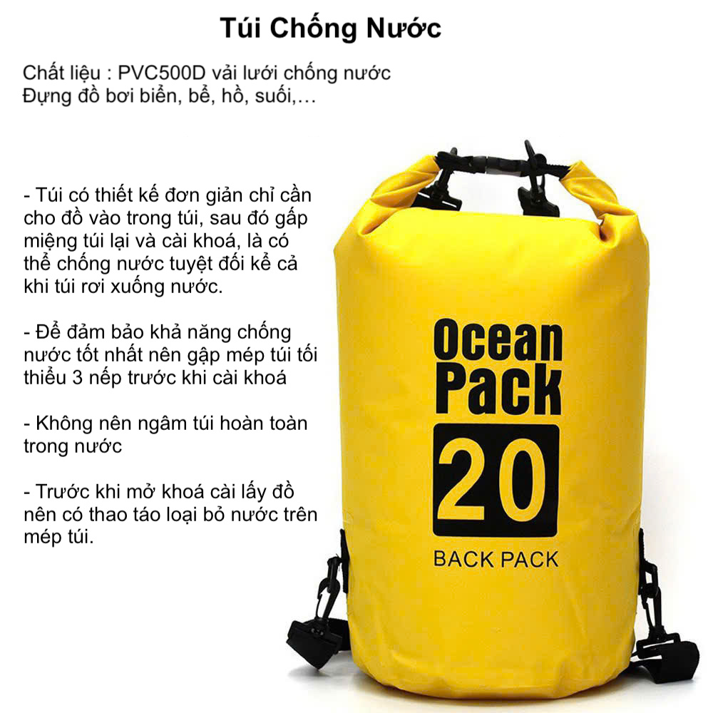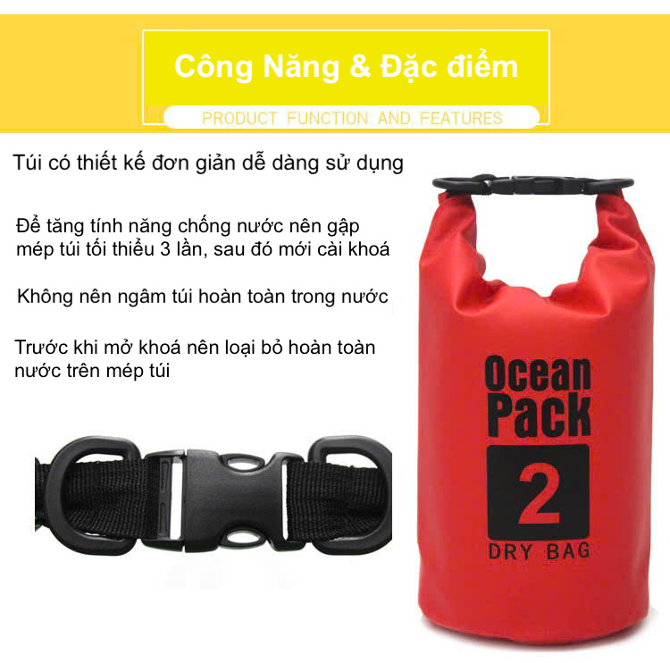 - Túi có thiết kế đơn giản chỉ cần cho đồ vào trong túi, sau đó gấp miệng túi lại và cài khoá, là có thể chống nước tuyệt đối kể cả khi túi rơi xuống nước.