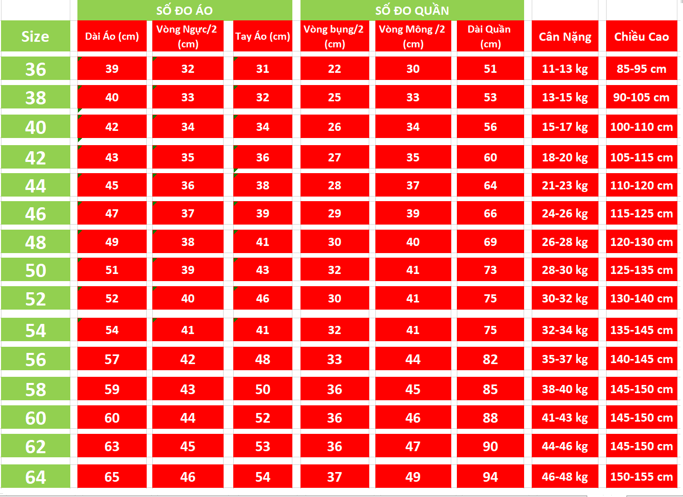 Lưu ý : với các bé bụng to nên chọn nhỉnh lên 1 size có thể vừa vòng bụng quần hơn.